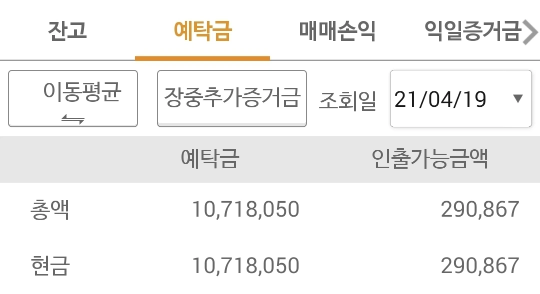사진 3. 선물 주식 예탁금. 1071만 원. 어서 훌쩍 이 가격대를 넘어 1600만 원대로 올라야 한다. 파이팅.