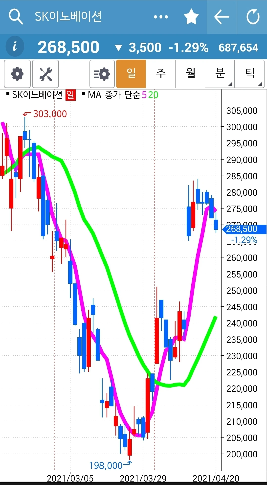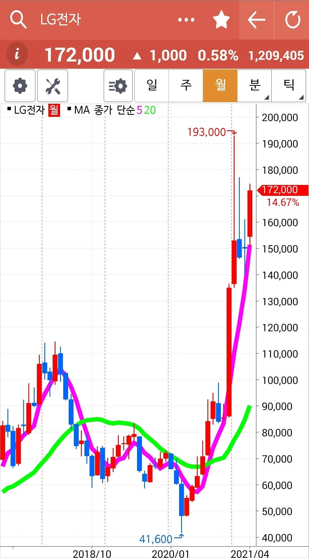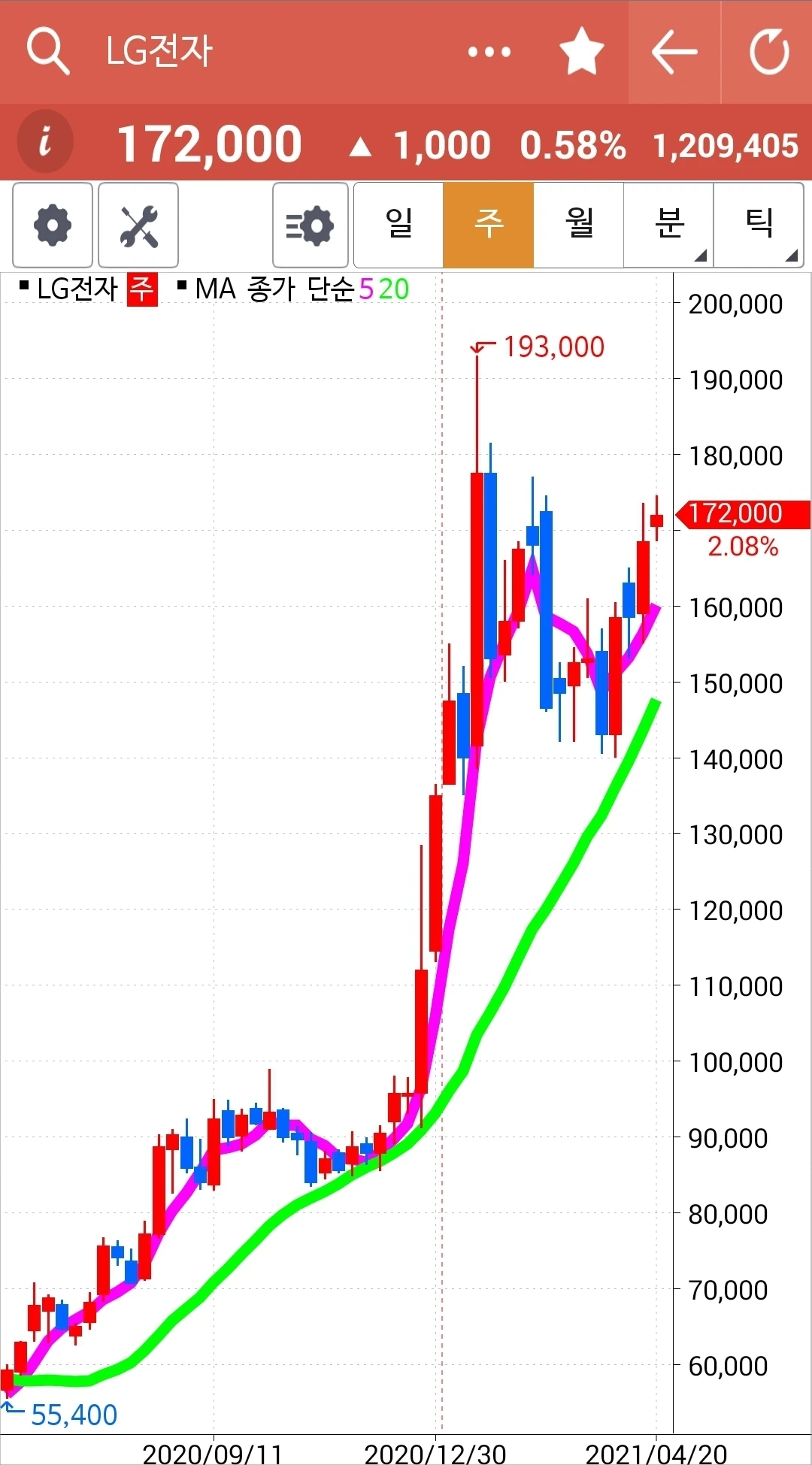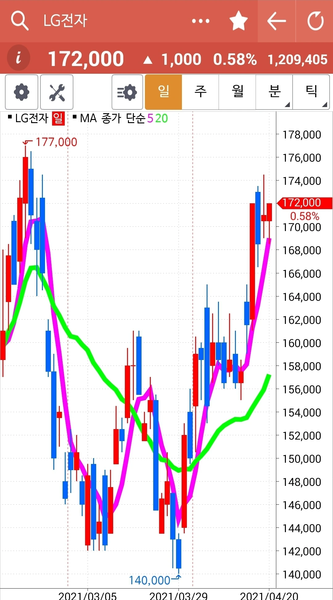 차트가 너무 가파르다. 구불구불 굴곡을 이루며 가야 오래갈 텐데. 그래도 내가 할 수 있는 거란 없다. 5일선이 20일선 위에 있으니까. 차트를 잘 지켜보리라. 파이팅!!!