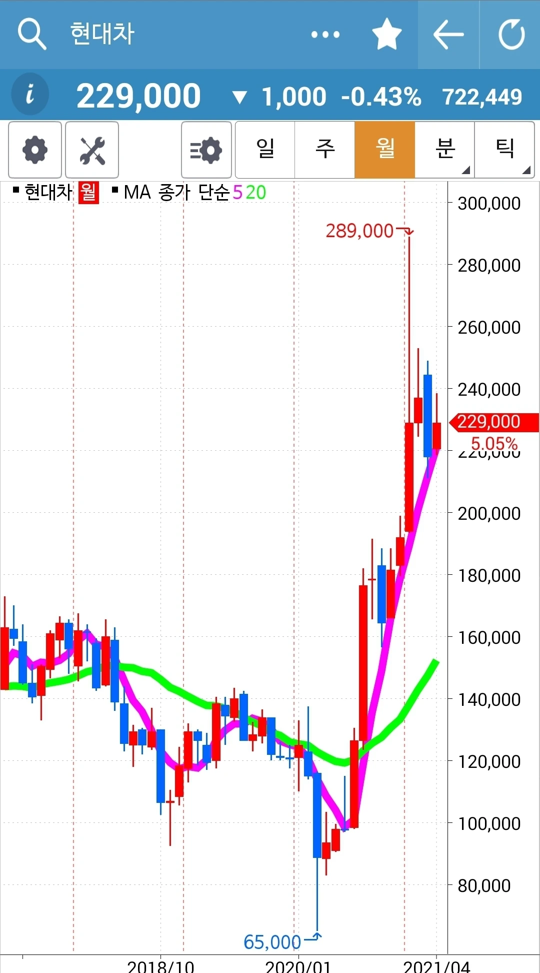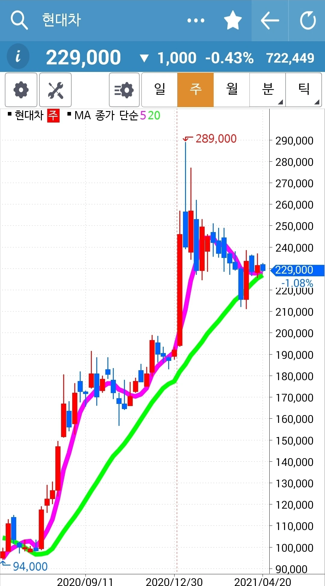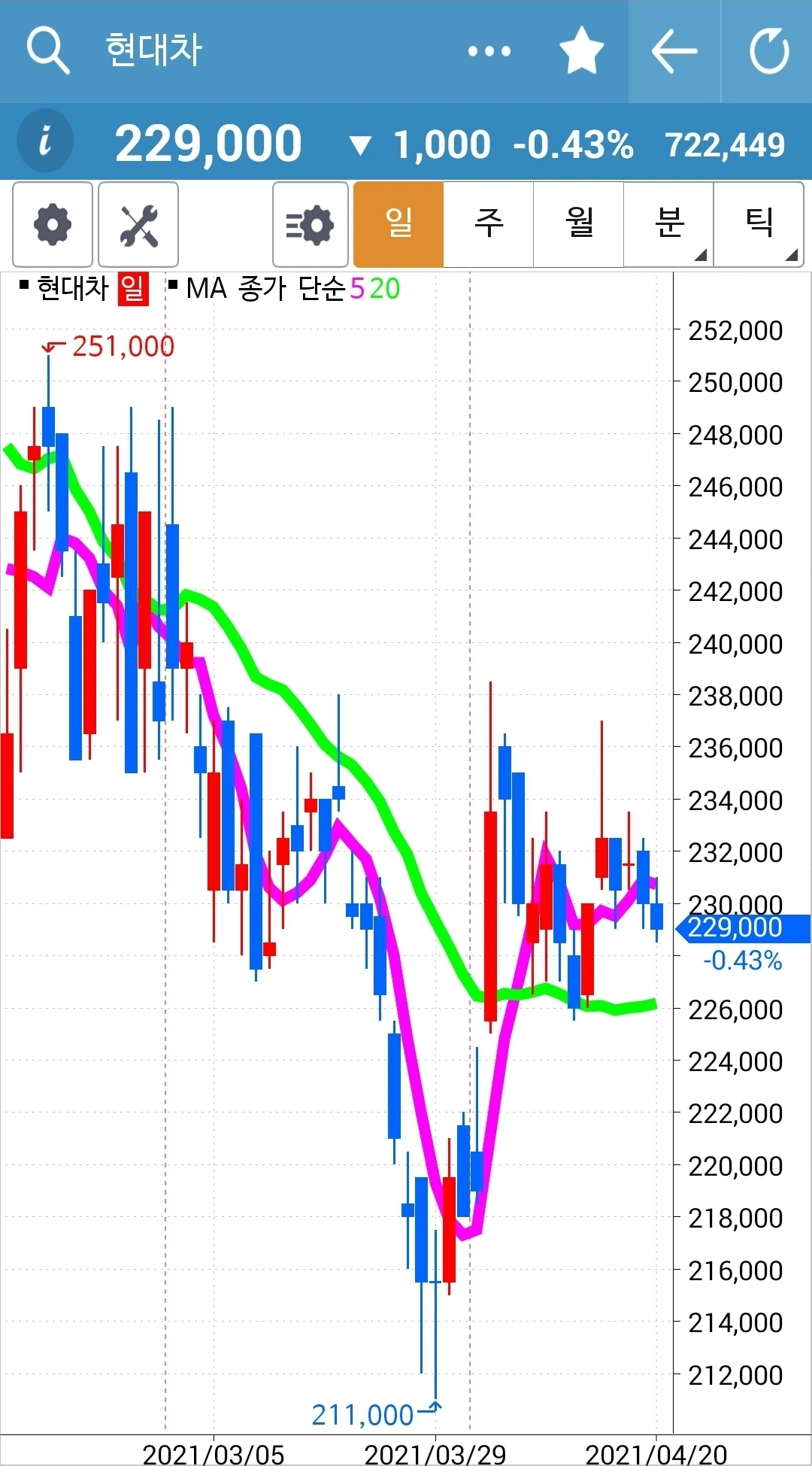 꾸준히 예쁘게 위로 올라가고 있다. 내가 아는 딱 하나. '난 아무것도 몰라요~ 5일선이 20일선을 뚫고 내려오면 매도할 뿐야요~' 그러므로 내가 행동할 건 아직 아무것도 없다. 하하.