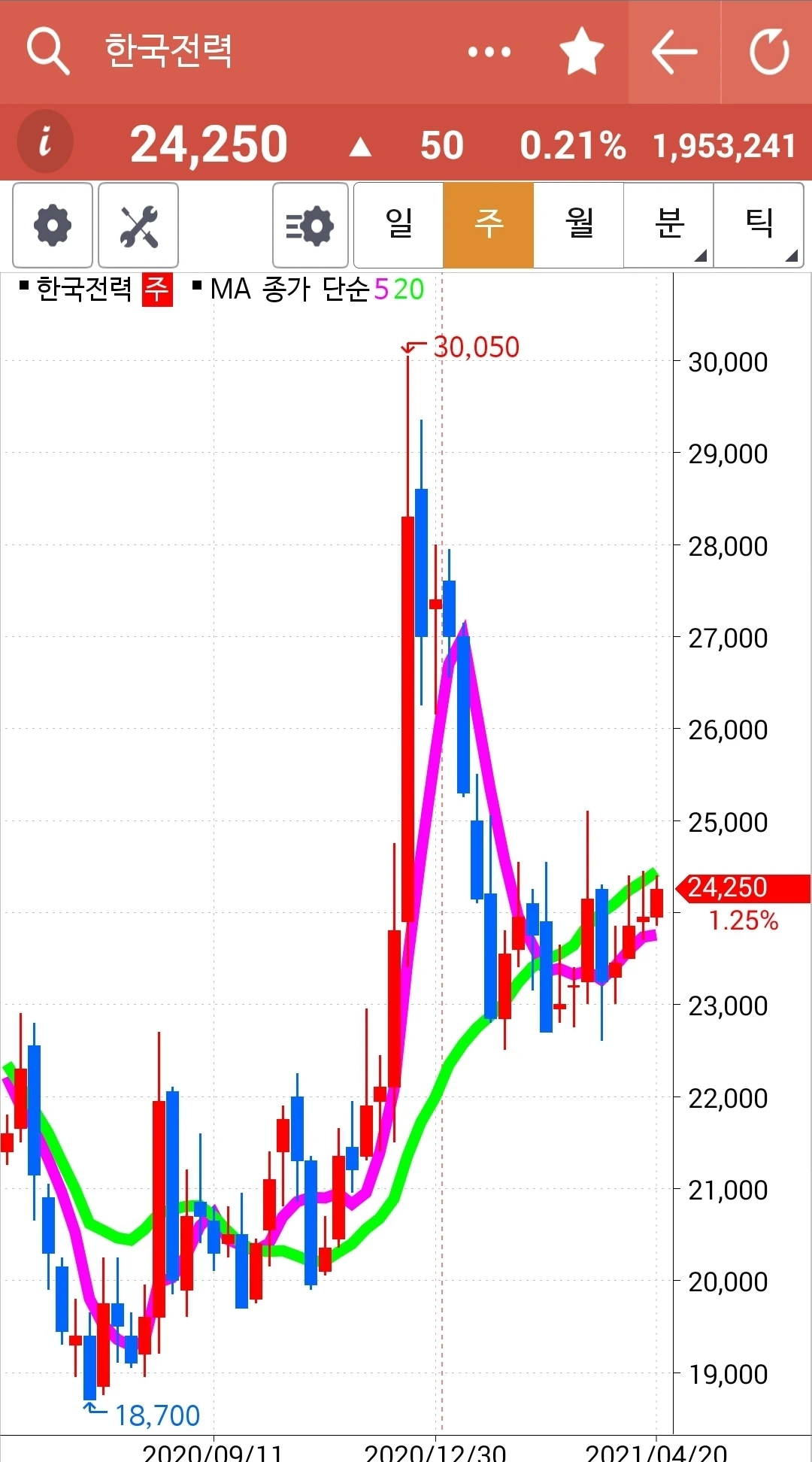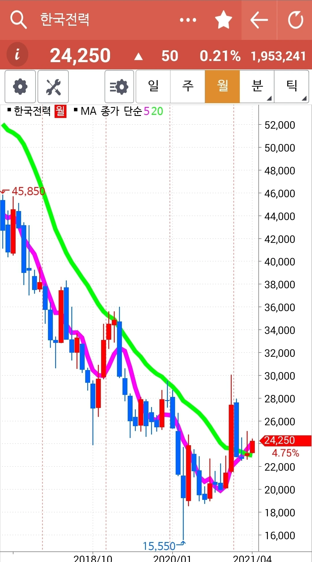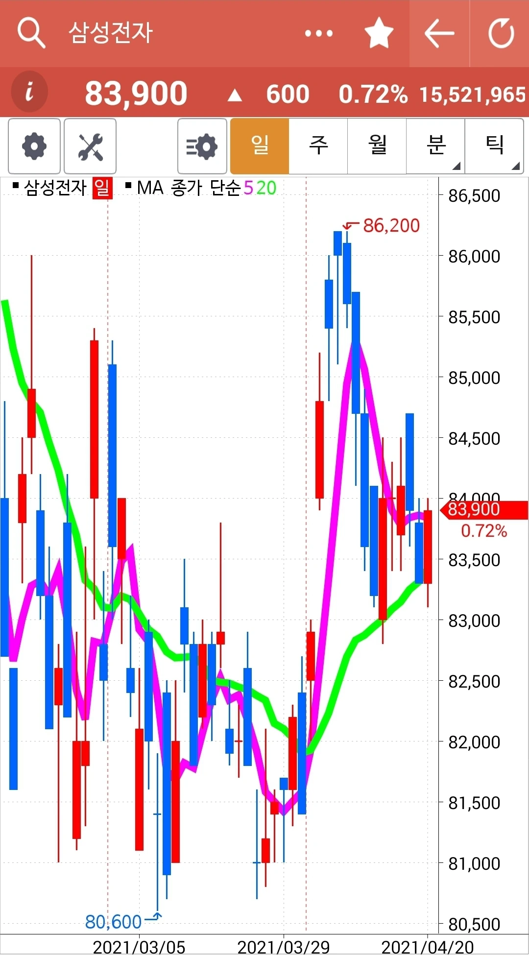 꾸준히 예쁘게 위로 올라가고 있다. 내가 아는 딱 하나. '난 아무것도 몰라요~ 5일선이 20일선을 뚫고 내려오면 매도할 뿐야요~' 그러므로 내가 행동할 건 아직 아무것도 없다. 하하.