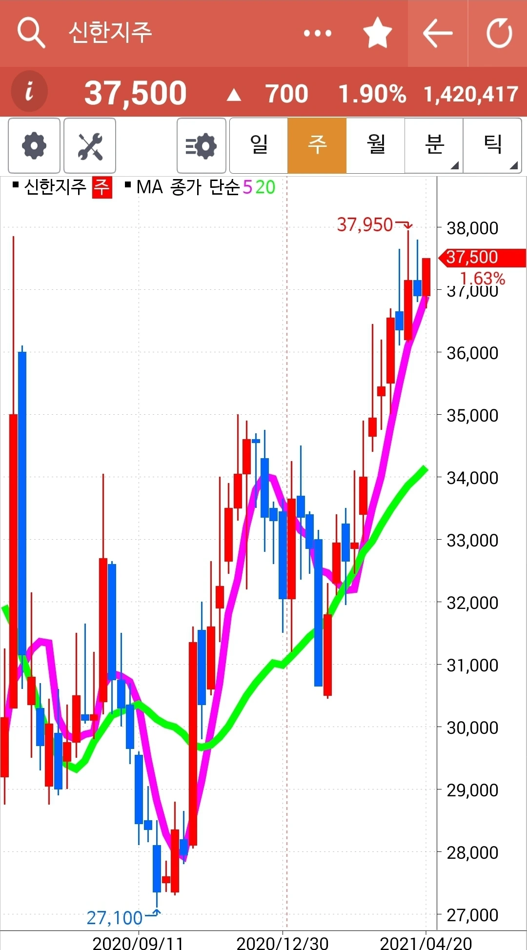 역시 20일선 딛고 위로 빵! 하하 예쁘게 굴곡을 이루며 올라가고 있는 신한지주. 파이팅!!!