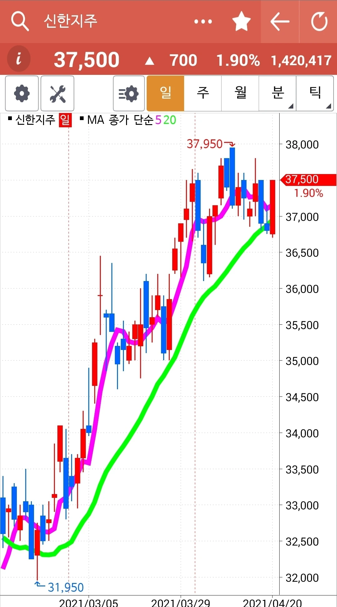 모 그렇게 빵!이라고 외칠 것까지는 없겠으나 그래도 아주 예쁘게 착착 올라가고 있는 신한지주에 나는 빵!이라는 제목을 달아주고 싶다. 바쁘니까 차트도 잘 못 보고 하루가 후딱 지나가지만 아직은 모두 5일선이 20일선 위에 있으므로 나의 행동을 요구하는 건 없다. 그러므로 차트만 휙 보고도 유지할 수 있다. 그래. 내가 할 줄 아는 건 딱 하나! 난 아무것도 몰라요~ 5일선이 20일선 아래로 뚫고 내려가면 매도할 뿐야요~ 파이팅! 푸하하하