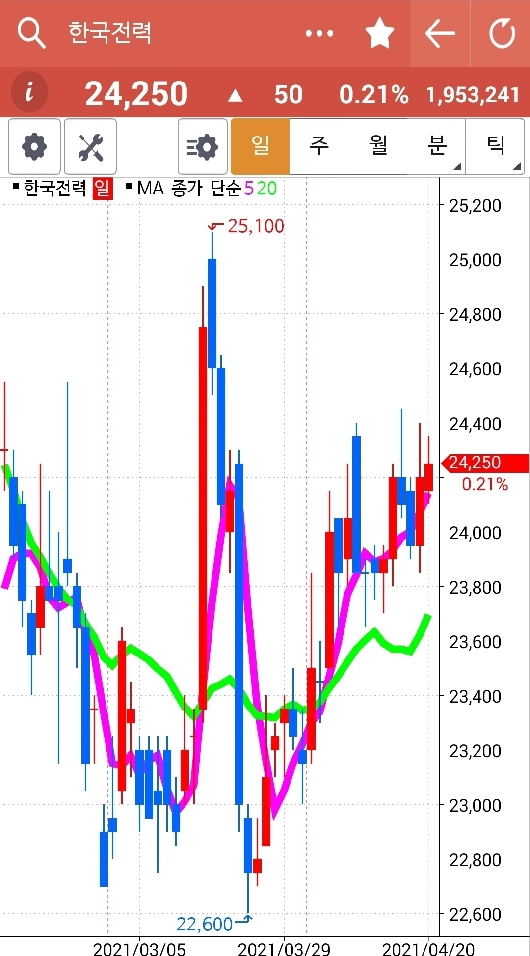 오케이. 20일선 부딪고 위로! 쭉쭉빵빵 계속 올라주소서~