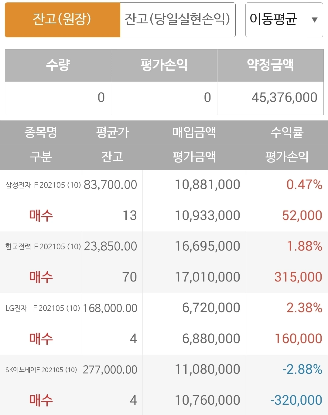 사진 2. 선물 주식. 모두 수익을 내고 있는데 갭 상승에 충동적으로 따라간 SK이노베이션만 손실 기록 중이다. 아무리 차트가 좋다고 해도 너무 심하게 오른 건 따라가지 않도록 하자꾸나. 파이팅!