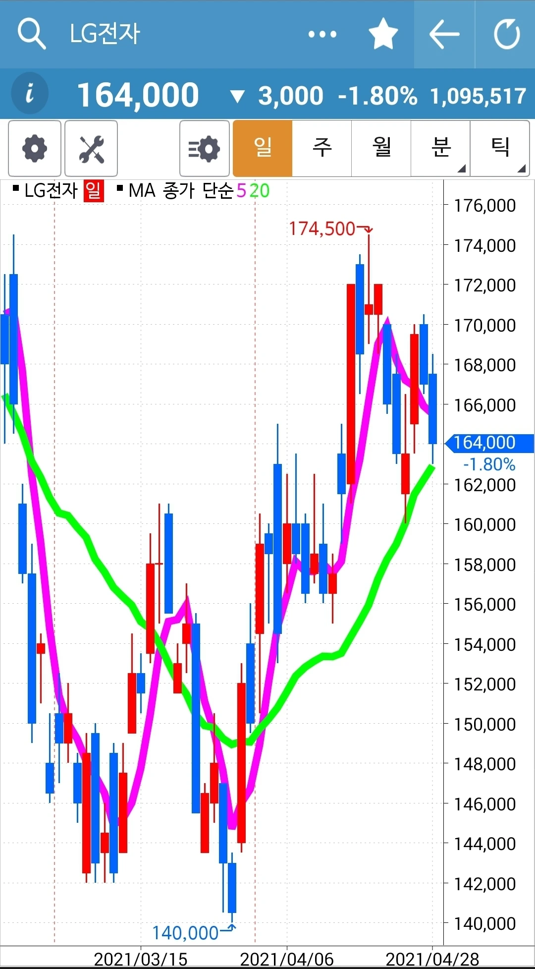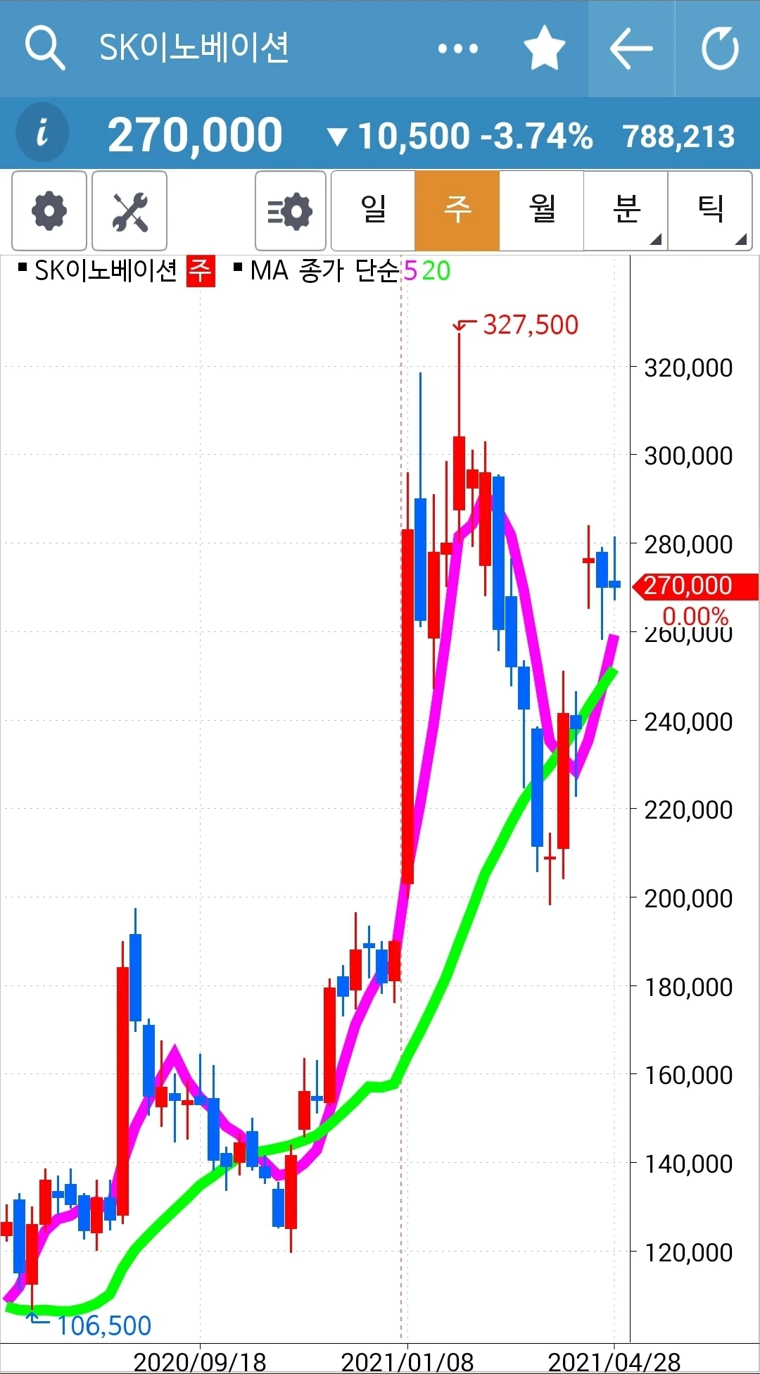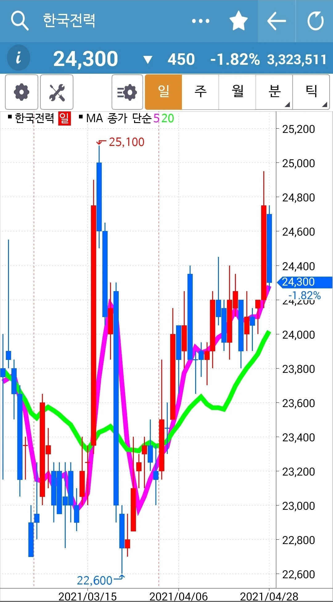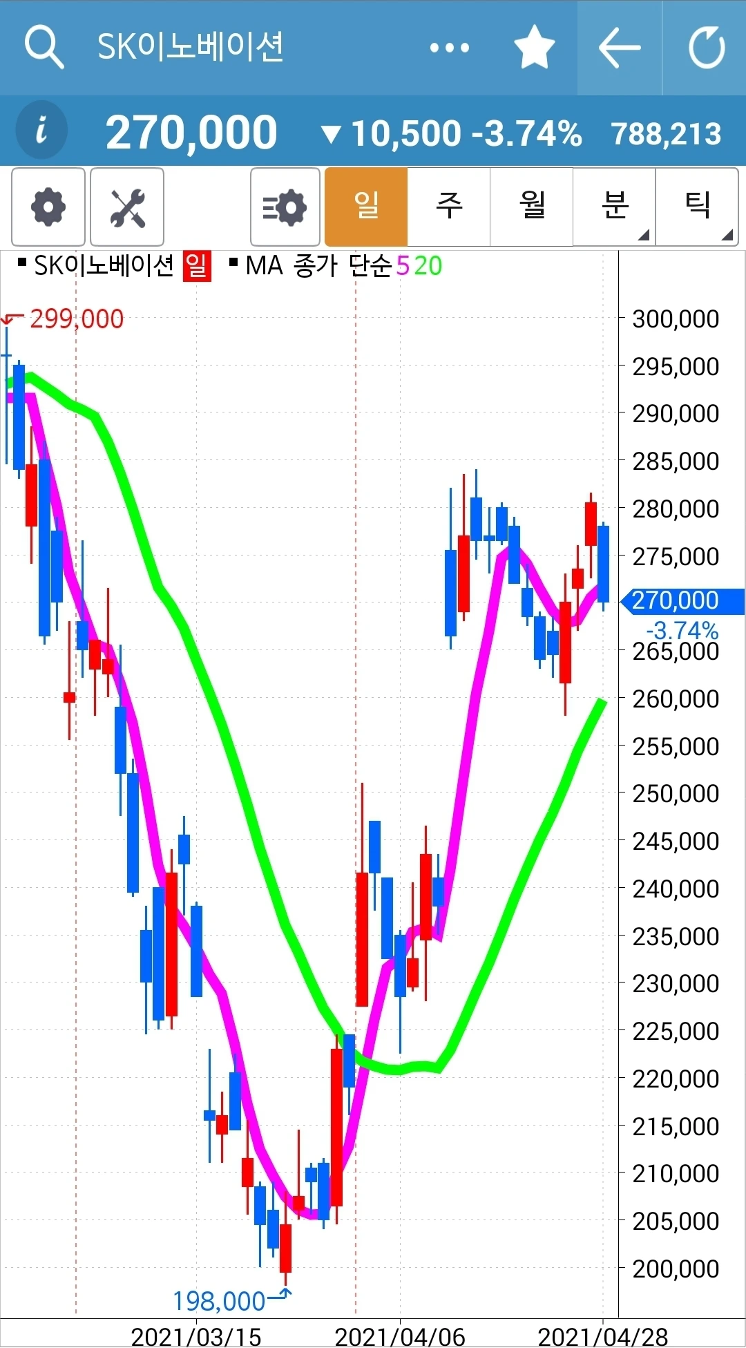 음봉은 음봉인가 보다. 전날 음봉이지만 고점 뚫고 저점 안 뚫어 괜찮다 했더니 오늘 저점을 확실하게 뚫었다. 종합지수가 비실대는데 이런 종목이 힘낼 수 있을까. 전고점을 뚫지 못하고 꺾이는 모습이니 많이 불안하다. 열심히 지켜보자. 나의 원칙에 어긋나는지 아닌지를. 파이팅!