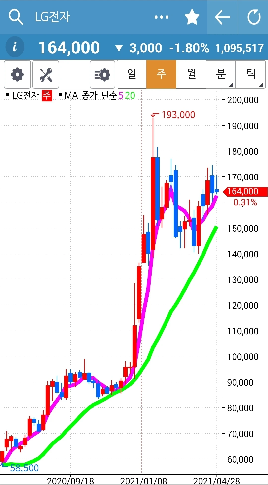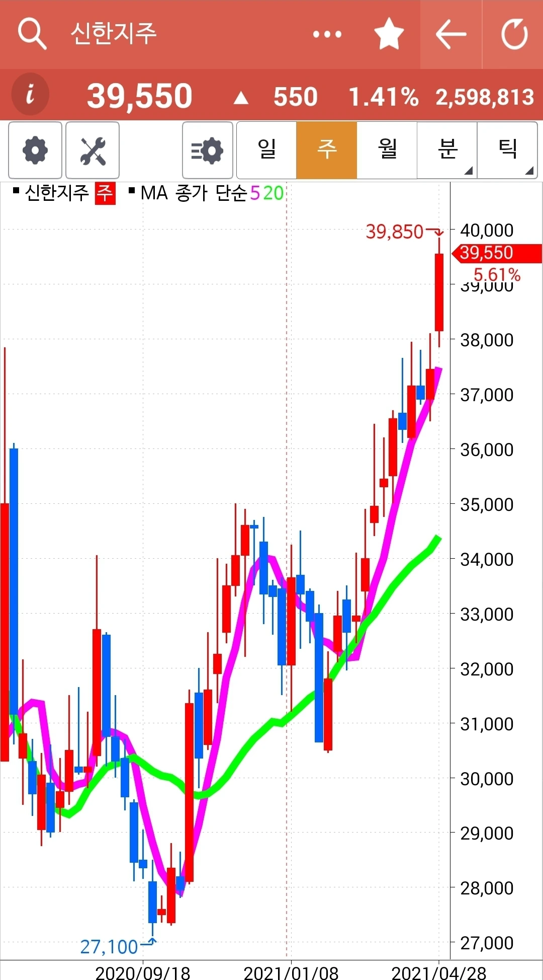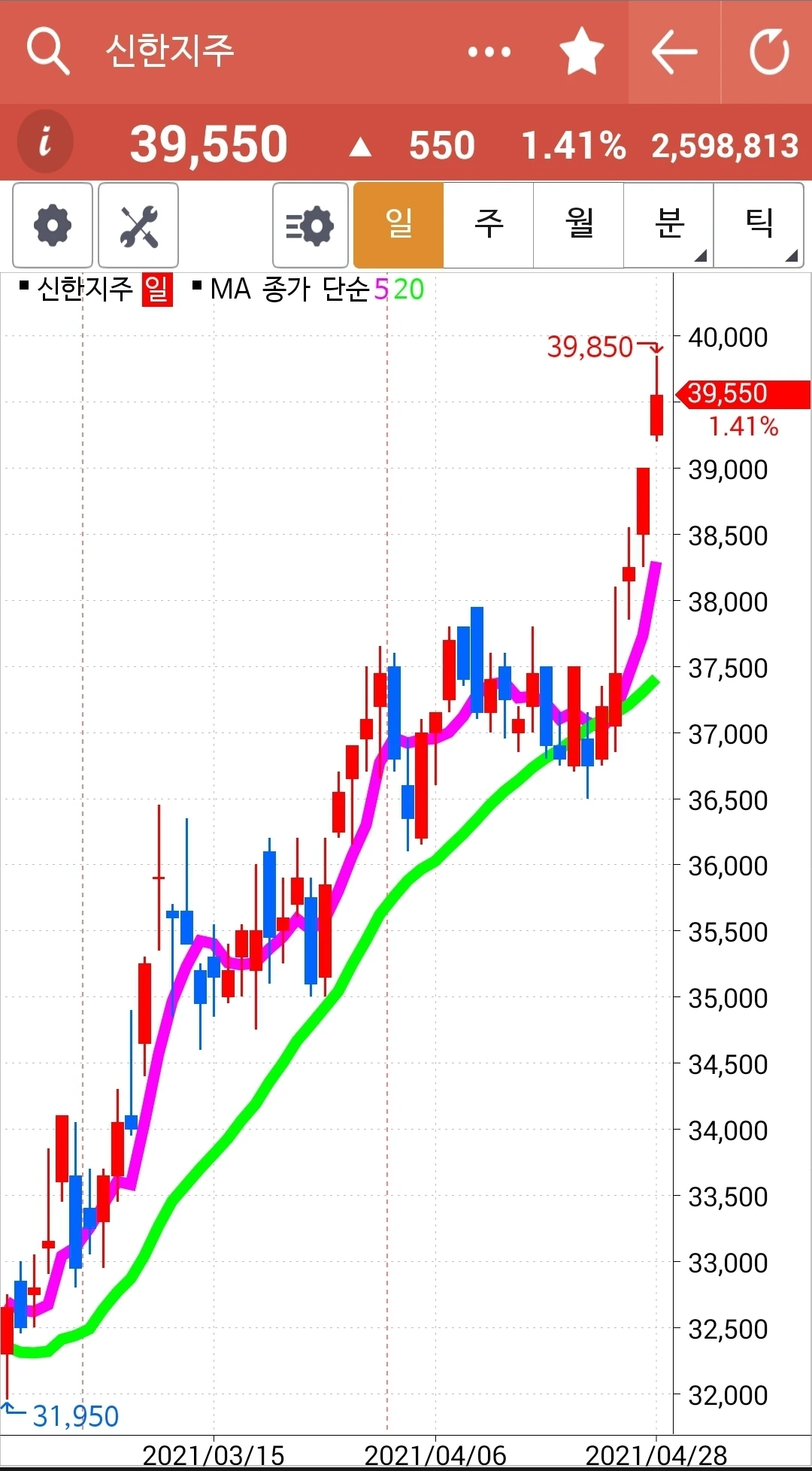나의 사랑을 바꿔야 할까? 푸하하하 예쁘게 멋지게 올라가고 있는 신한지주. 아 이뽀~ 쭉쭉빵빵 올라가고 있는 한 내가 할 일이란 아무것도 없다. 그저 기뻐만 하면 된다. 푸하하하 괜히 얼마까지 오를 거야. 이 정도에선 내려가겠지? 그런 예측을 할 필요가 없다. 난 그런 거 안 한다. 다만 내가 아는 딱 하나. '난 아무것도 몰라요~ 5일선이 20일선 아래로 내려가면 매도할 뿐야요~' 암. 요것만 지키면 오래오래 살아남을 수 있다. 생존만 하고 있으면 언제고 대박의 기회는 온다. 파이팅!!!