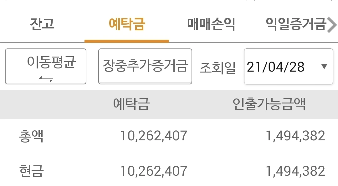 사진 3. 선물 주식 예탁금. 1,100만 원대로 올라섰던 게 다시 1,000만 원대가 간당간당하게 생겼다. 하이고.