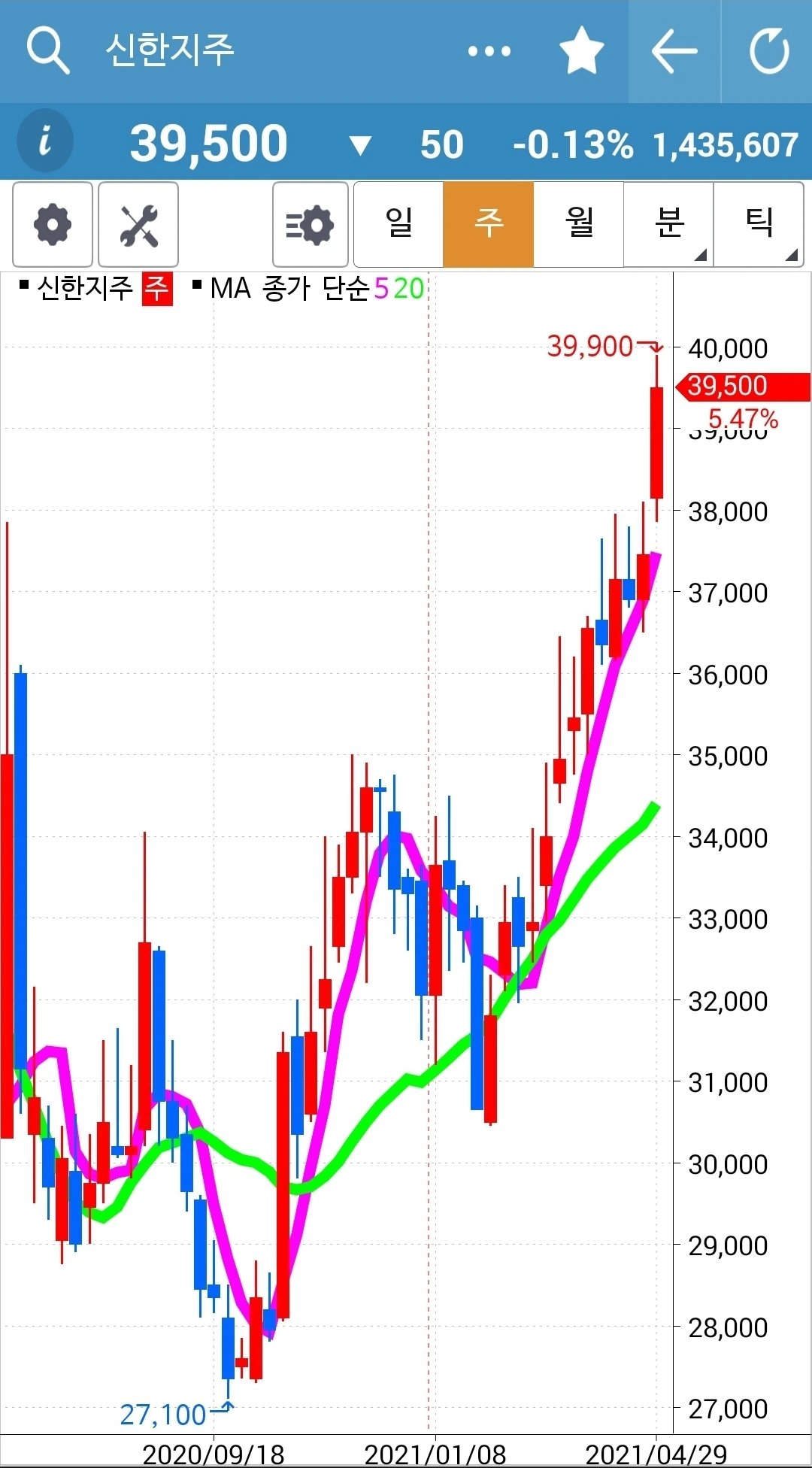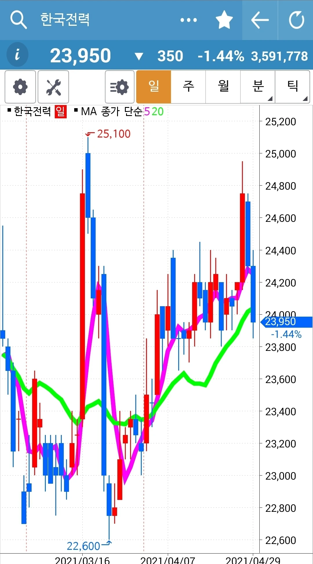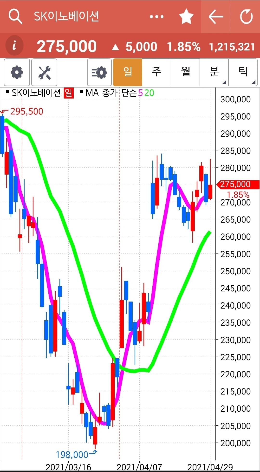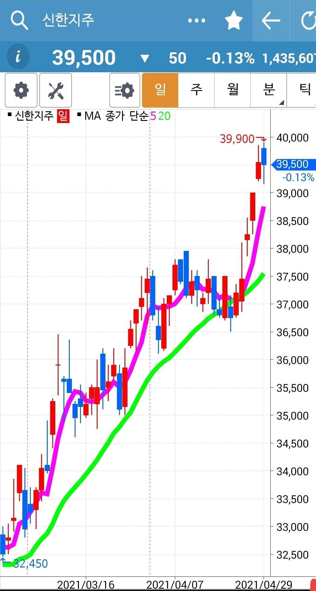 오늘의 효자종목. 나를 웃게 한 종목. 그러나 전고점을 넘기지 못하고 밀렸다는 건 좀 불안하다. 그래도 아직 짱짱하게 5일선 20일선 모두 위를 향하고 있으니 노 프라블럼. 파이팅!