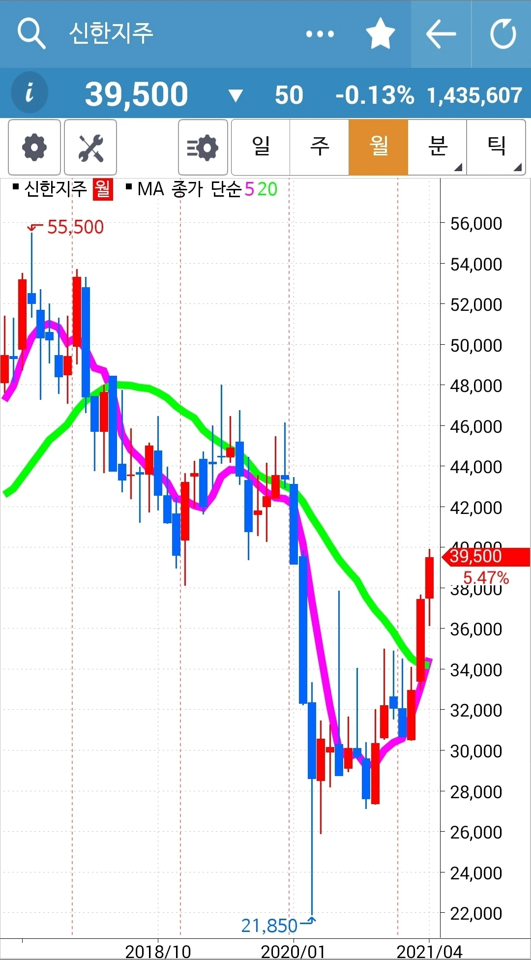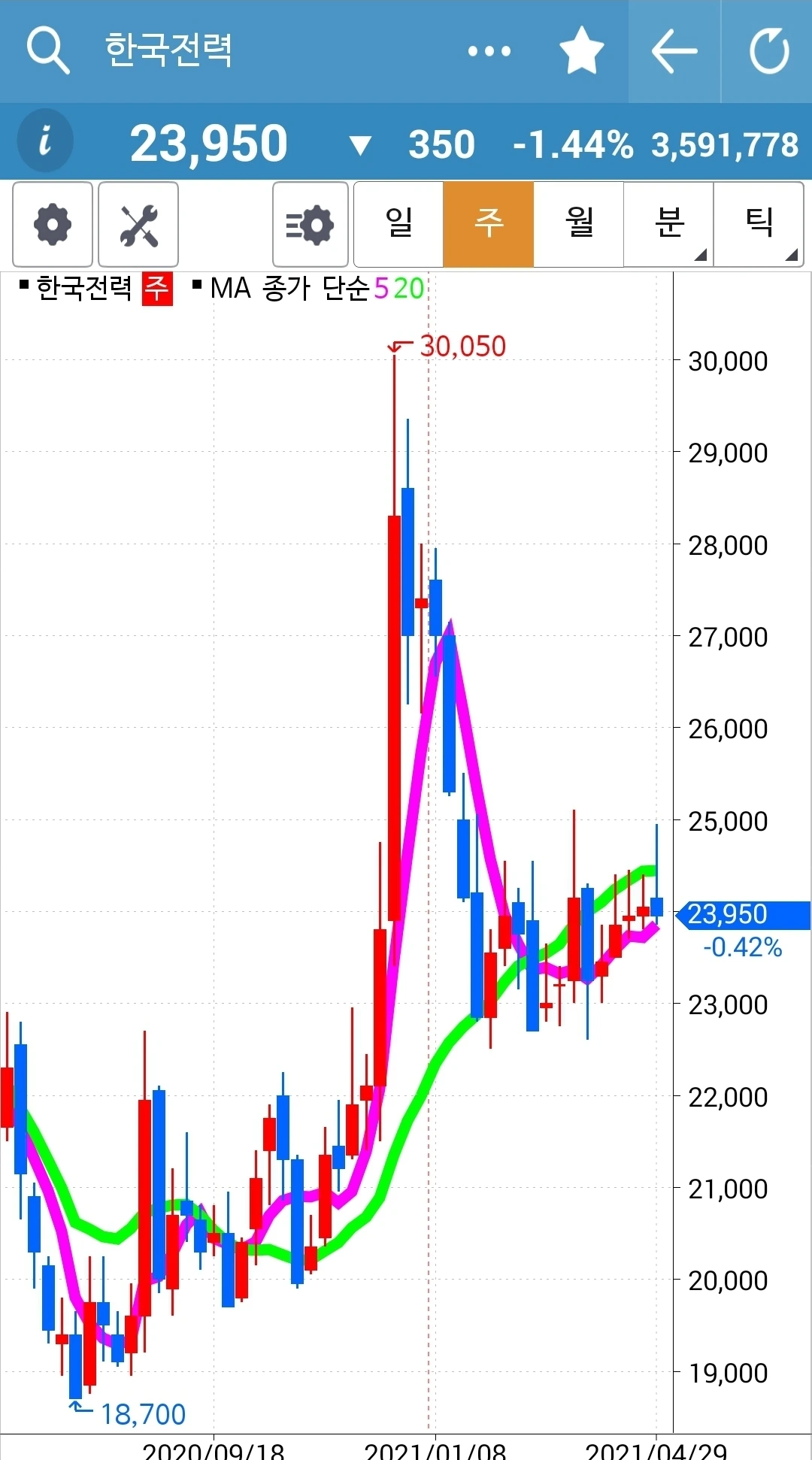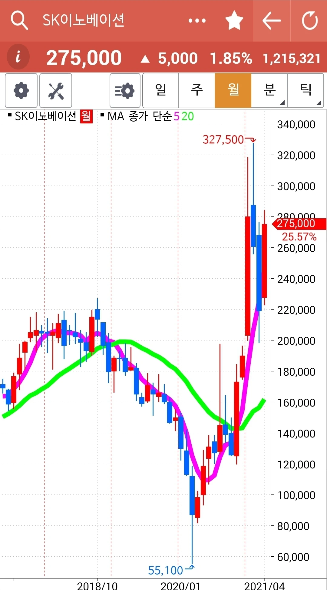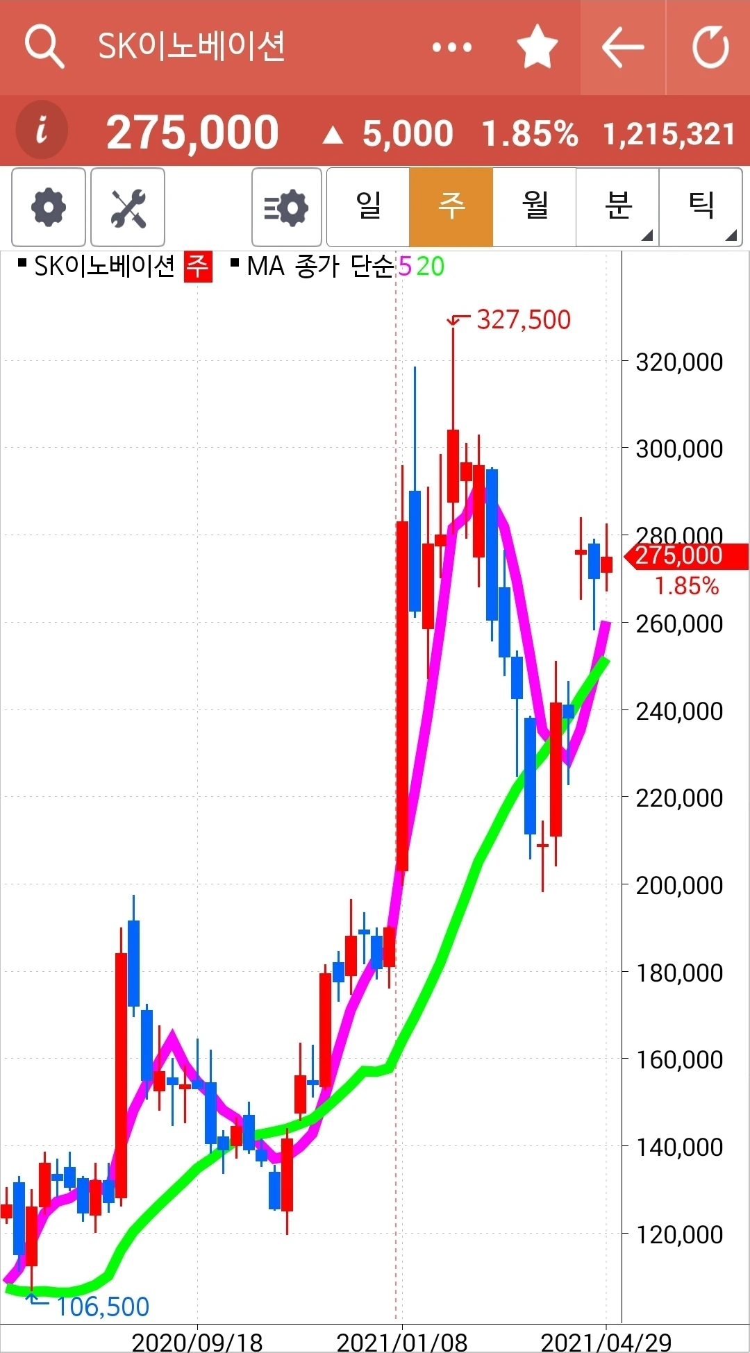 오늘의 효자종목. 나를 웃게 한 종목. 그러나 전고점을 넘기지 못하고 밀렸다는 건 좀 불안하다. 그래도 아직 짱짱하게 5일선 20일선 모두 위를 향하고 있으니 노 프라블럼. 파이팅!