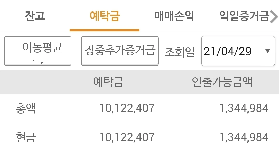 사진 3. 선물 주식 예탁금. 1,000만 원대도 간당간당. 하이고오오오~