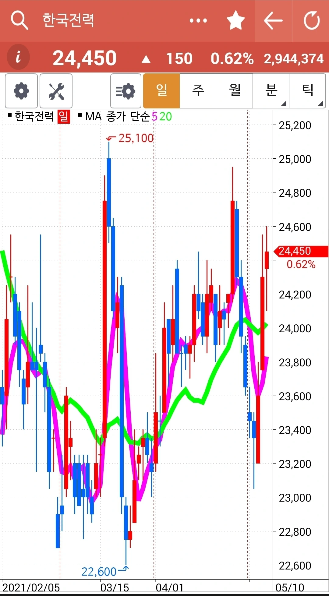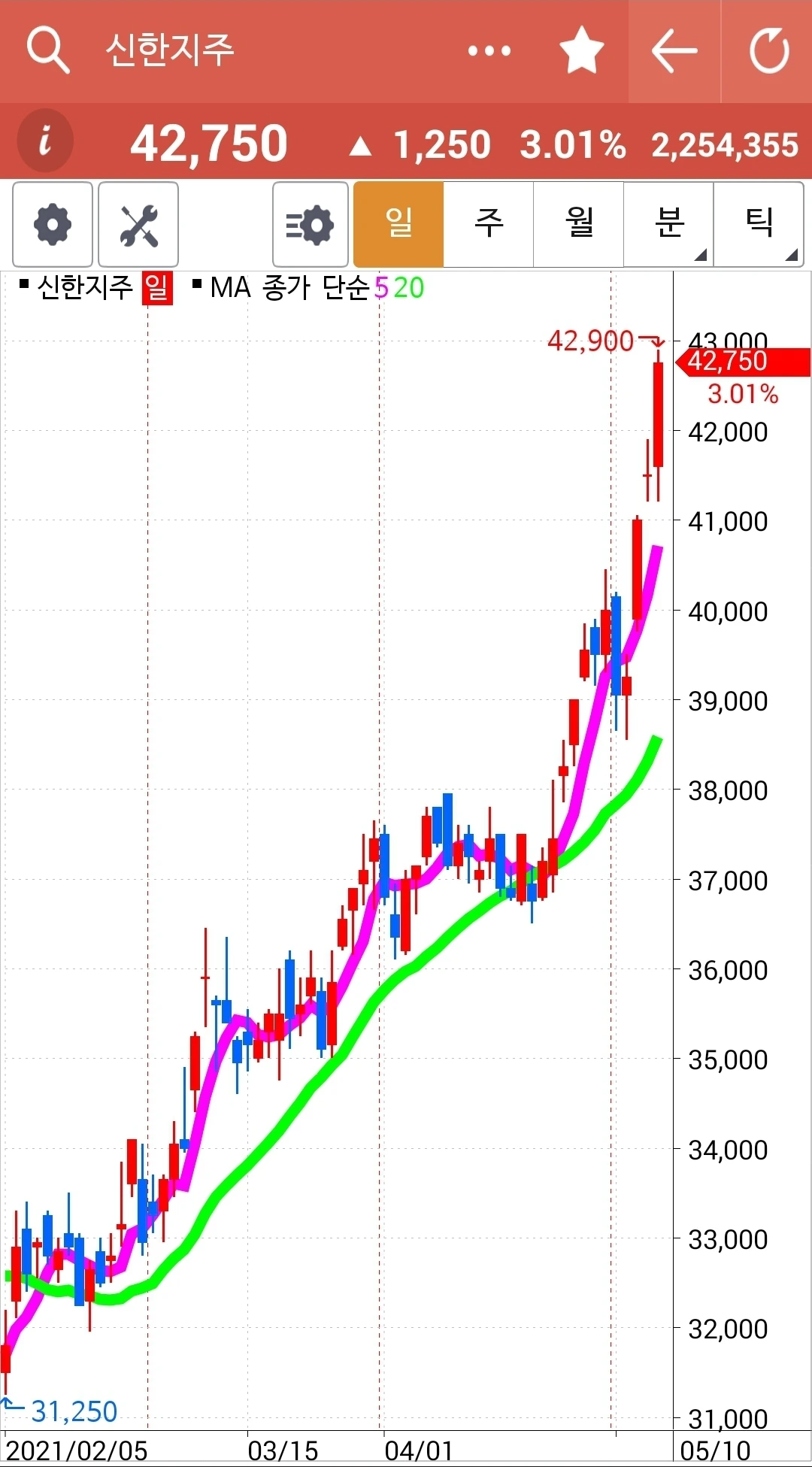 오홋. 이것 역시 파팍 올라 다시 5일선이 20일선을 뚫으려 하고 있다. 제발 다시 깡총 올라와주렴. 나의 합리화가 통할 수 있도록. 이번 한 번만 살려주면 다시는 원칙을 어기지 않으리. 약속합니다. 파이팅!