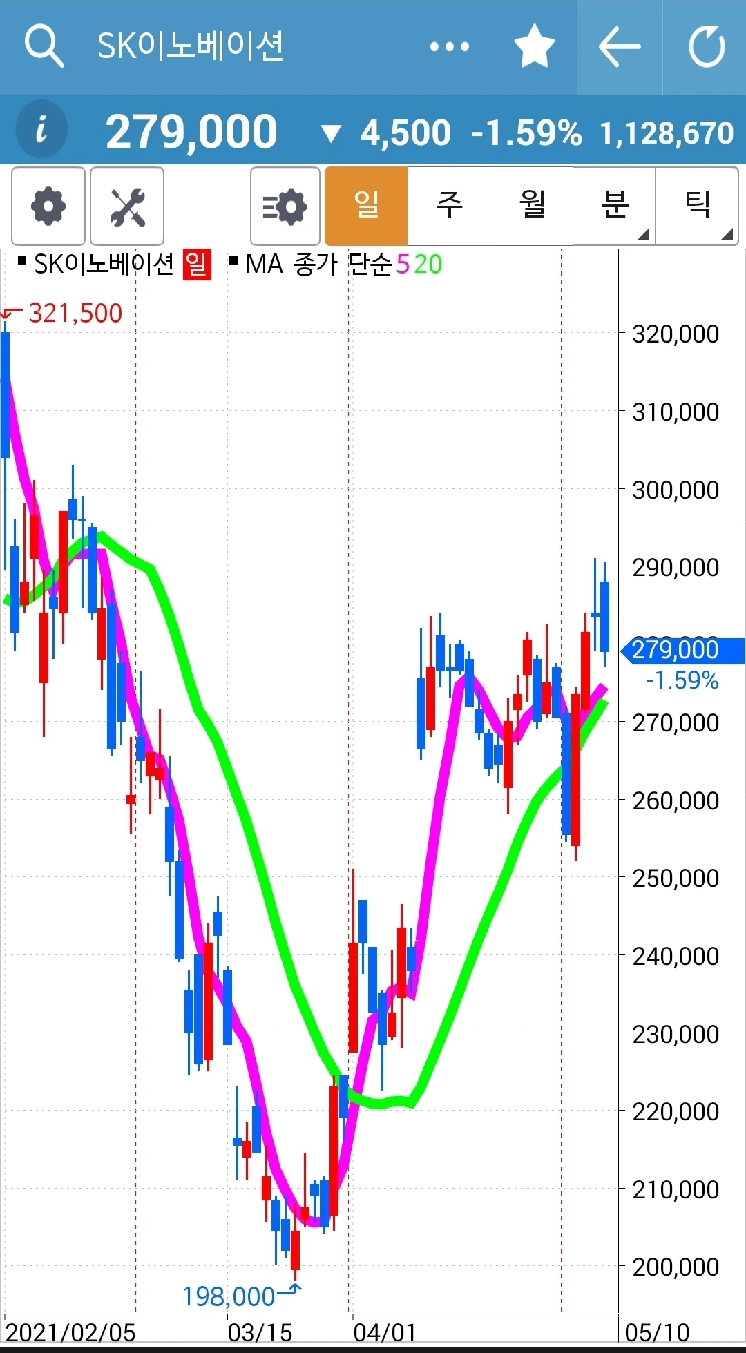 힘차게 올라가다 음봉 출현. 전일 저점을 깨고 고점은 못 깬 상태. 조정을 받으려나보다.