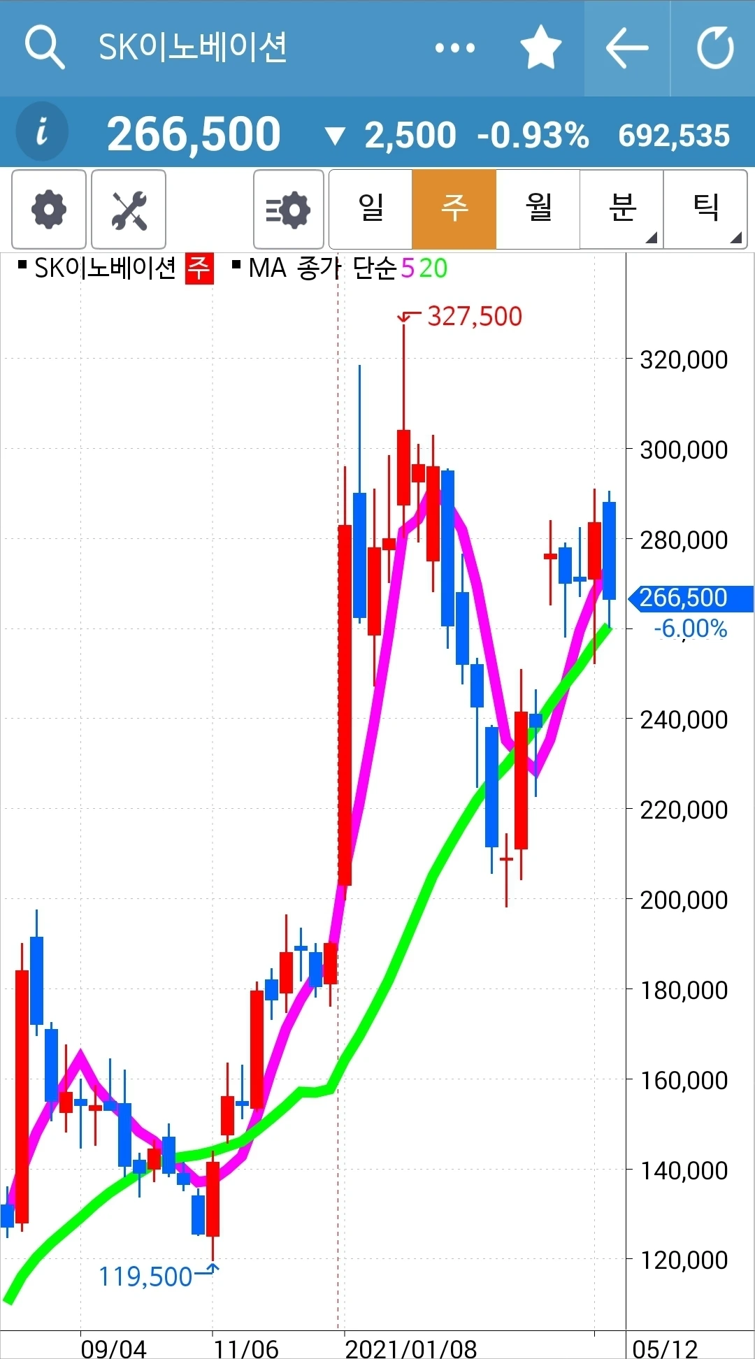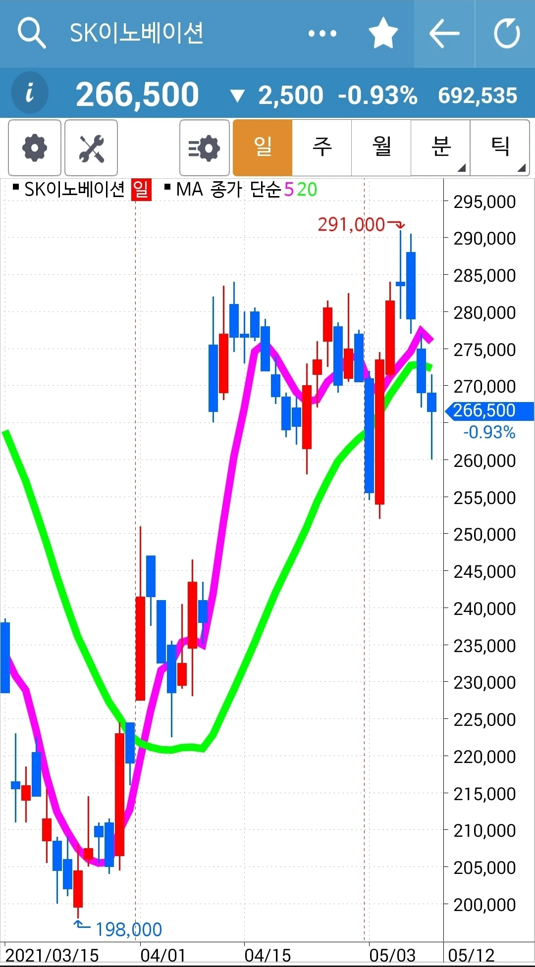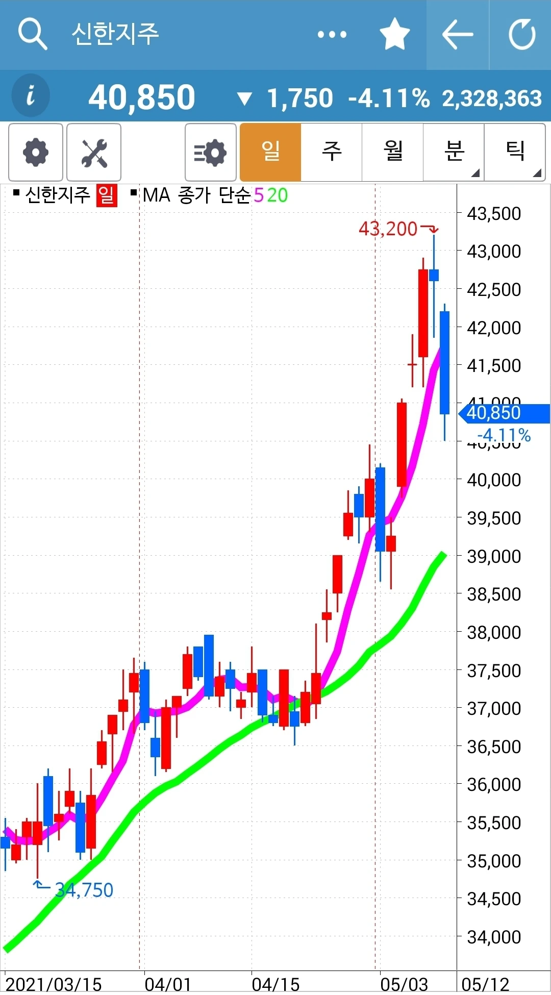 그렇게나 힘 좋게 고공행진을 하더니 아주 길고도 긴 음봉으로 확실하게 고개를 꺾을 것만 같은 모습을 보여준다. 오늘 또 심히 내려가겠지. 그래도 난 매도하지 못한다. 왜냐하면 이건 내가 그래도 원칙을 지키는 중이며 나의 원칙은 '난 아무것도 몰라요 5일선이 20일선 위로 가면 매도할 뿐야요~' 안 지킨 게 있을 지라도 내가 매달릴 건 이것밖에 없다.