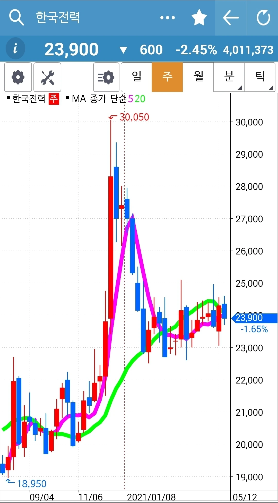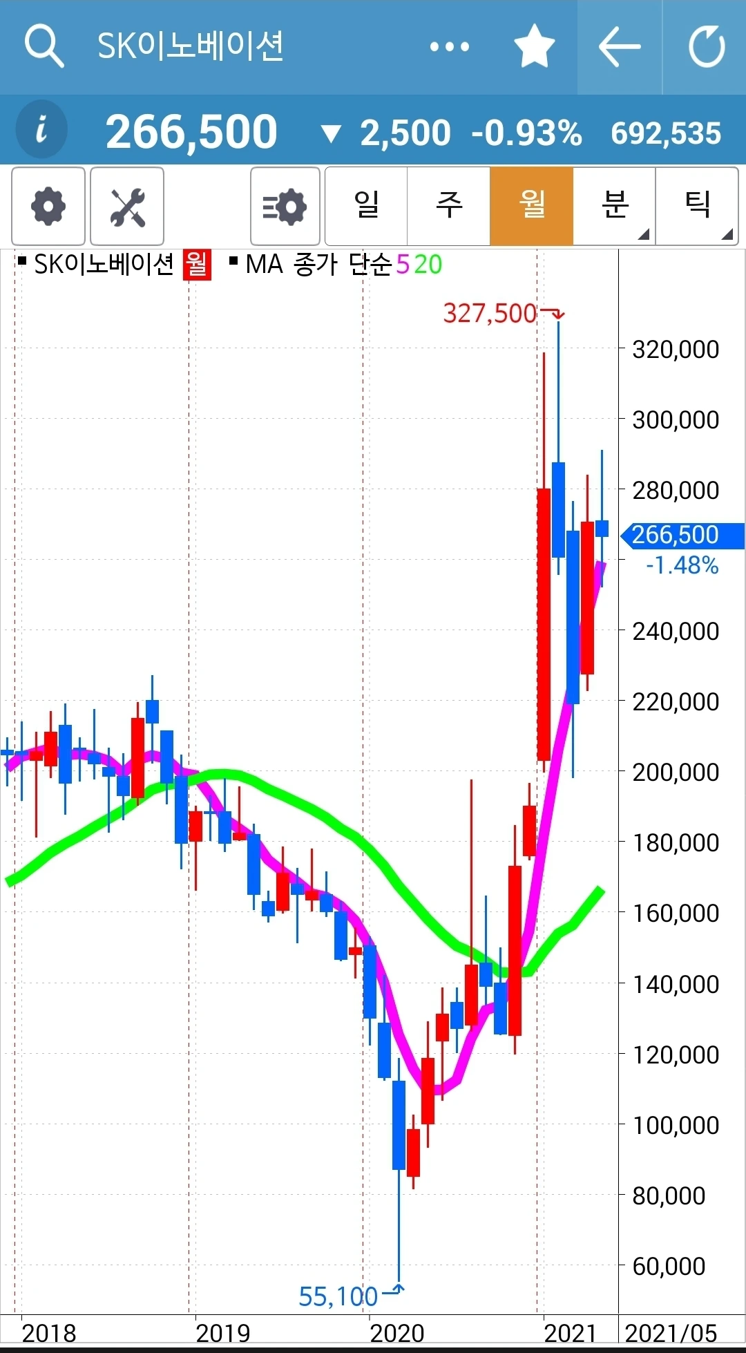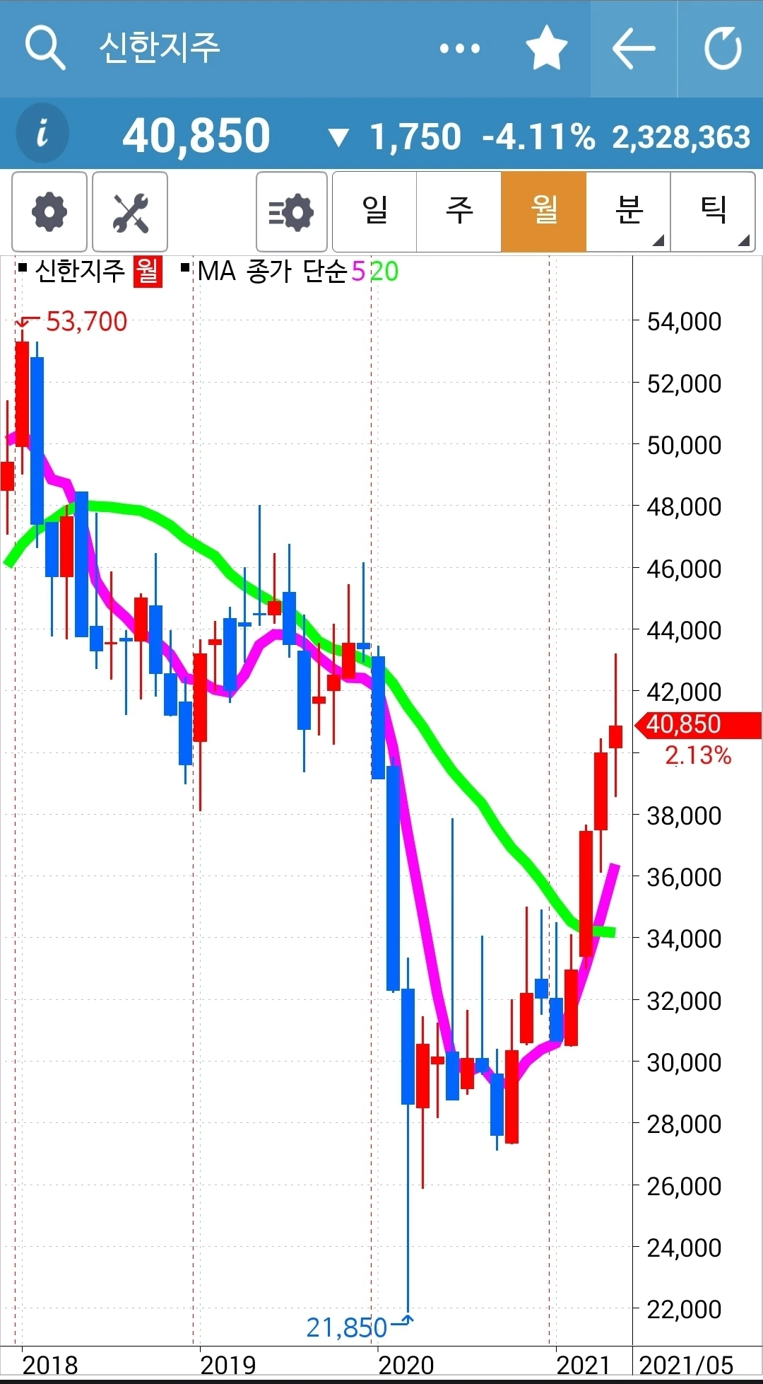 그렇게나 힘 좋게 고공행진을 하더니 아주 길고도 긴 음봉으로 확실하게 고개를 꺾을 것만 같은 모습을 보여준다. 오늘 또 심히 내려가겠지. 그래도 난 매도하지 못한다. 왜냐하면 이건 내가 그래도 원칙을 지키는 중이며 나의 원칙은 '난 아무것도 몰라요 5일선이 20일선 위로 가면 매도할 뿐야요~' 안 지킨 게 있을 지라도 내가 매달릴 건 이것밖에 없다.