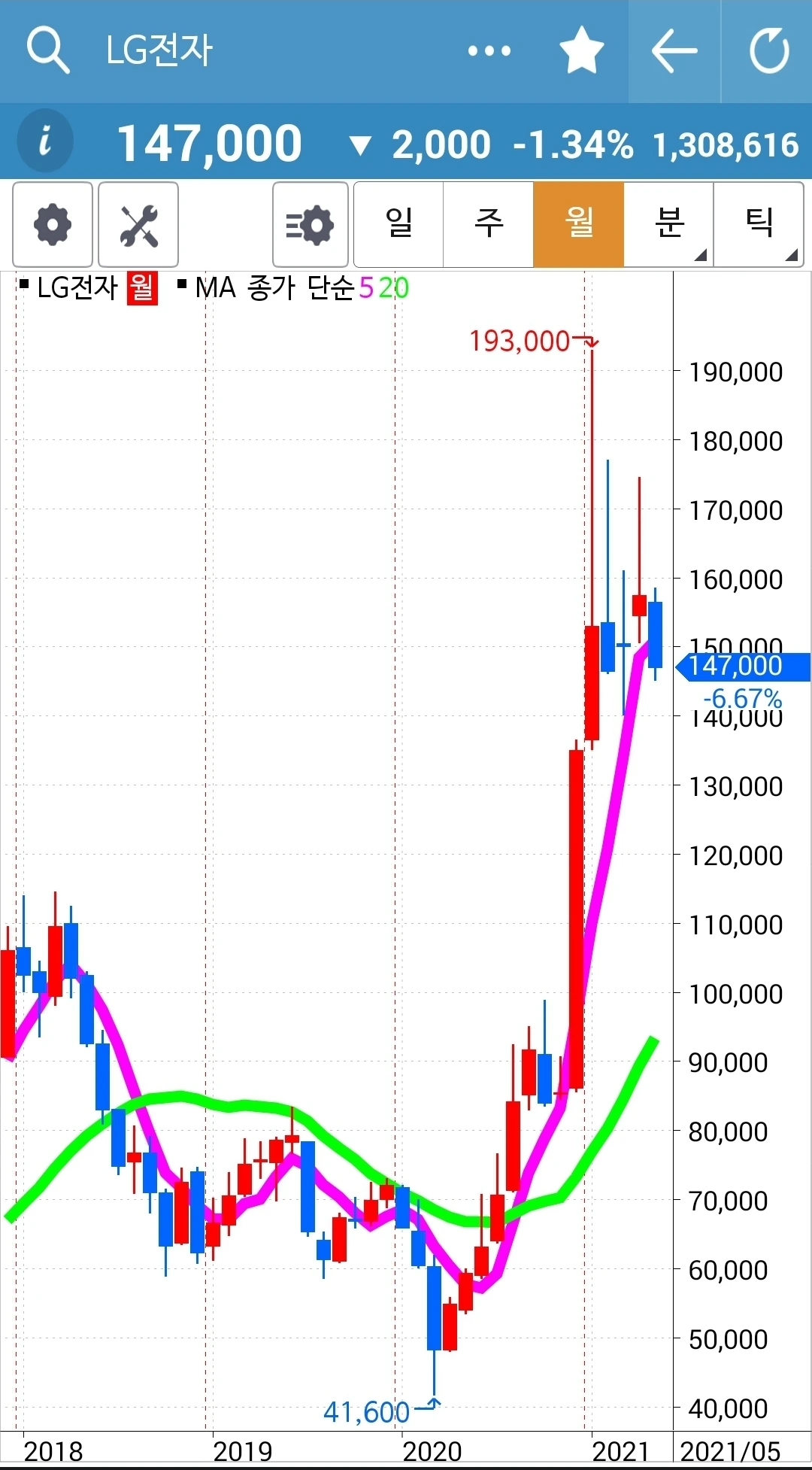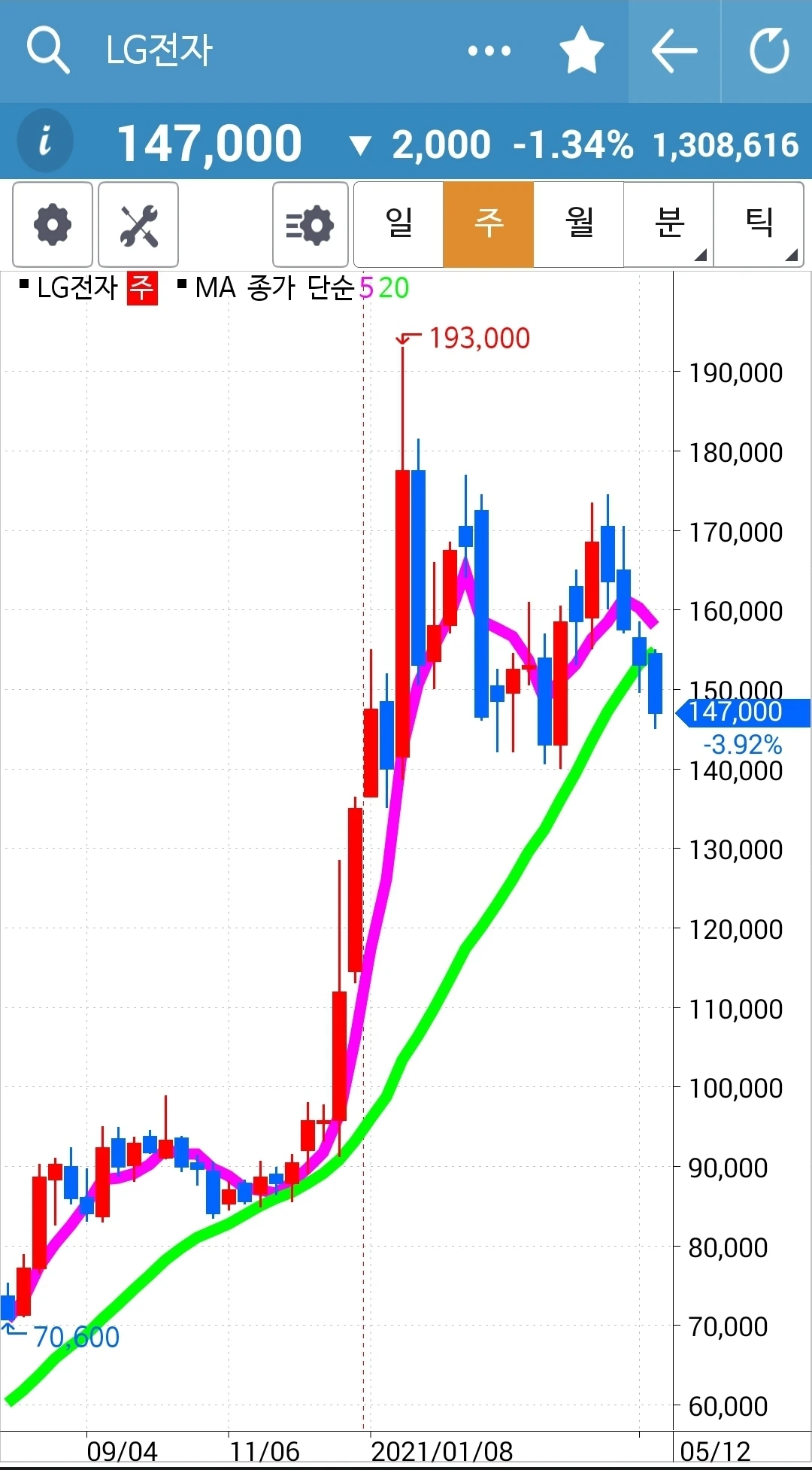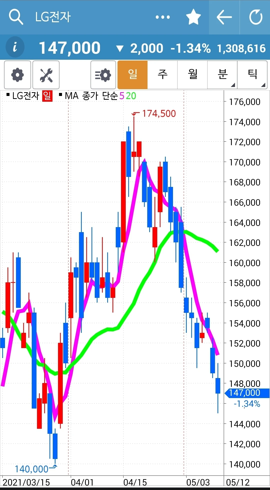 한번 삐끗하여 원칙을 안 지키니 막무가내다. 기회를 주어도 못 나온다. 더 좋은 값이 와도 처음을 놓치면 절대 할 수 없다. 매도할 명분을 찾을 수 없기 때문이다. 이렇게 하염없이 내려가는데 왜 놓지를 못할까? LG전자 나의 사랑? 흥! 개뿔이다. 주식투자에 나의 사랑이 어디 있냐. 그 어느 주식에도 사랑을 주어선 안된다. 냉철하게 원칙이 어긋나는 순간 놔라!!! 탈락시켰어야 했다. 매매시간이 지났다면 그다음 날 시초가에라도 행했어야만 했다.