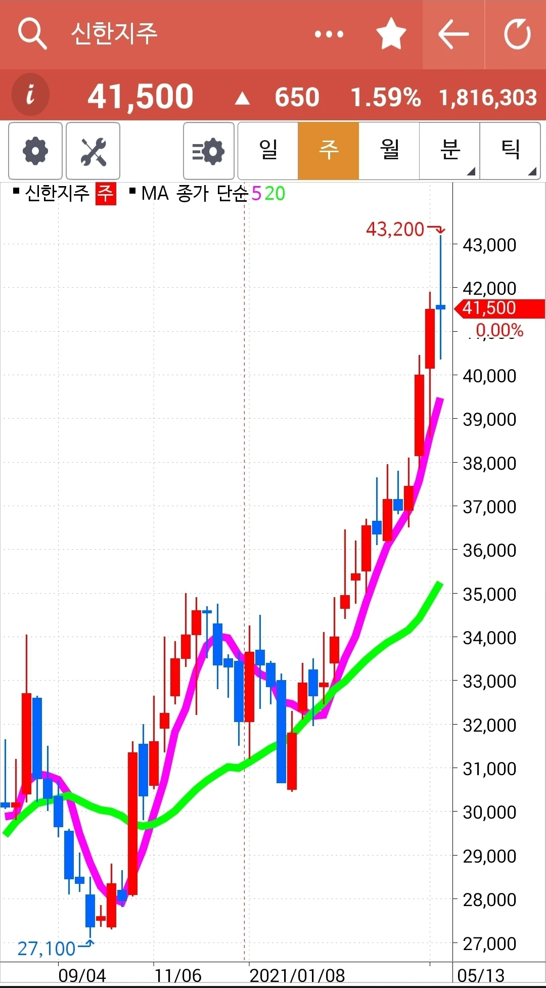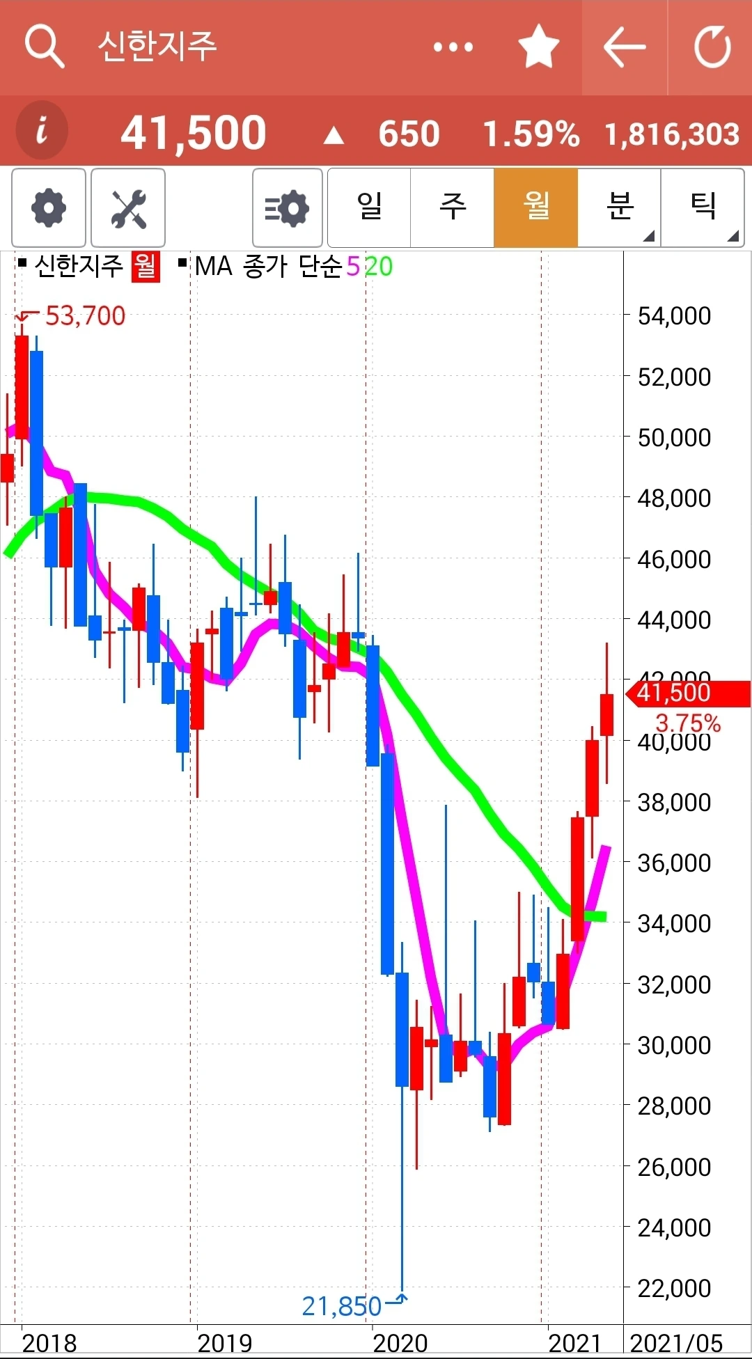 사진 1. 현물 주식. 신한지주 하나가 5일선이 20일선 아래로 내려가지 않아 아직 들고 있다. 현물 주식은 이렇게 지금까지의 원칙을 고수하기로 한다. 다만 일봉 주봉 월봉 어느 걸 기준할지는 좀 더 생각해보기로 하자.