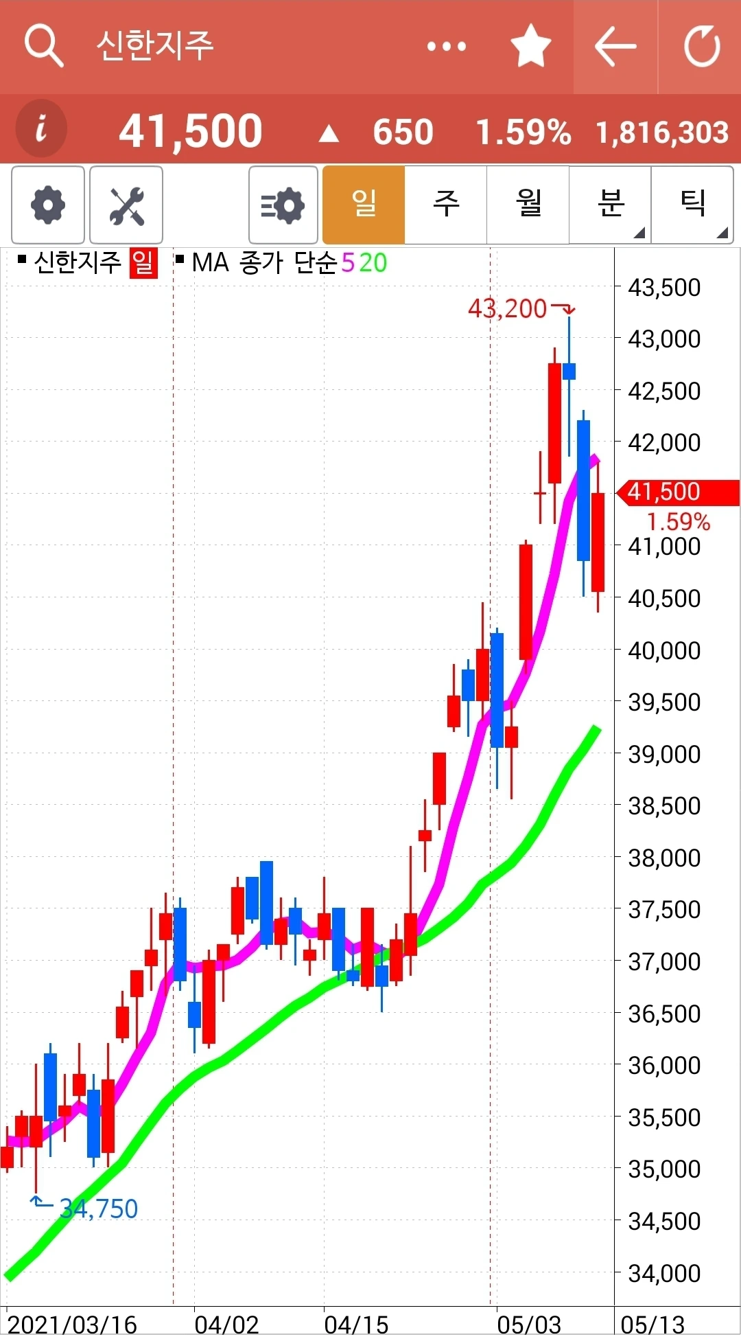 일봉을 기준으로 해서 아직 20일선을 건드리지 않고 올라가고 있다. 5일선이 20일선을 꽝 뚫고 내려올 때 그때 생각하기로 하자. 그대로 일봉 기준을 따를지 주봉으로 할지 월봉으로 할지를. 그래. 현물 주식은 장기전으로 간다. 파이팅!