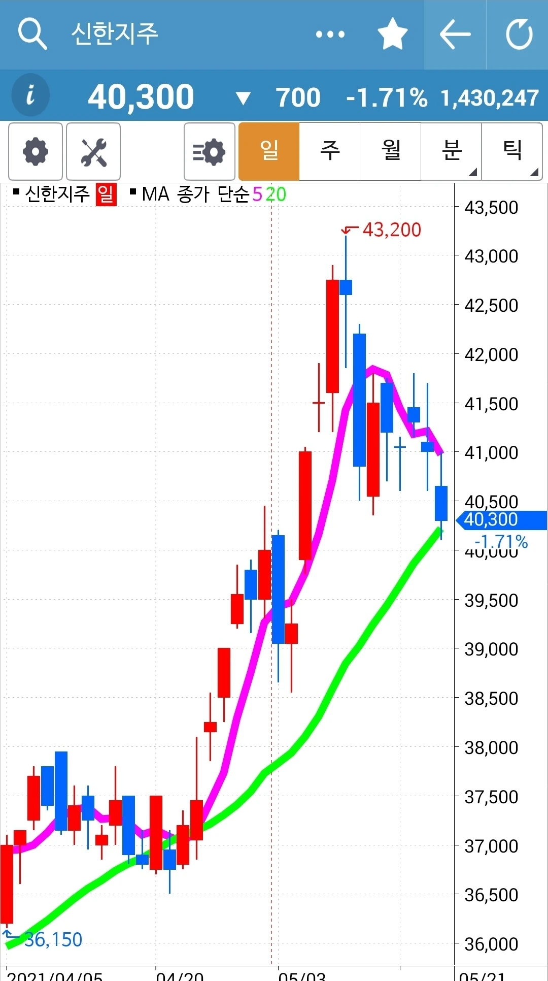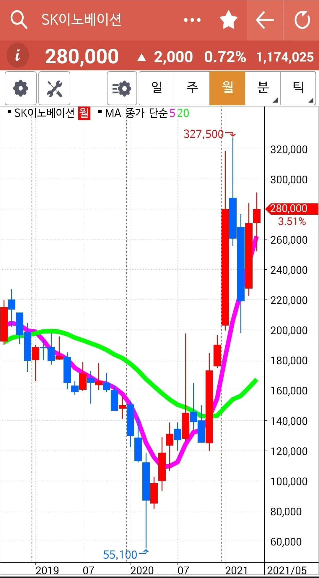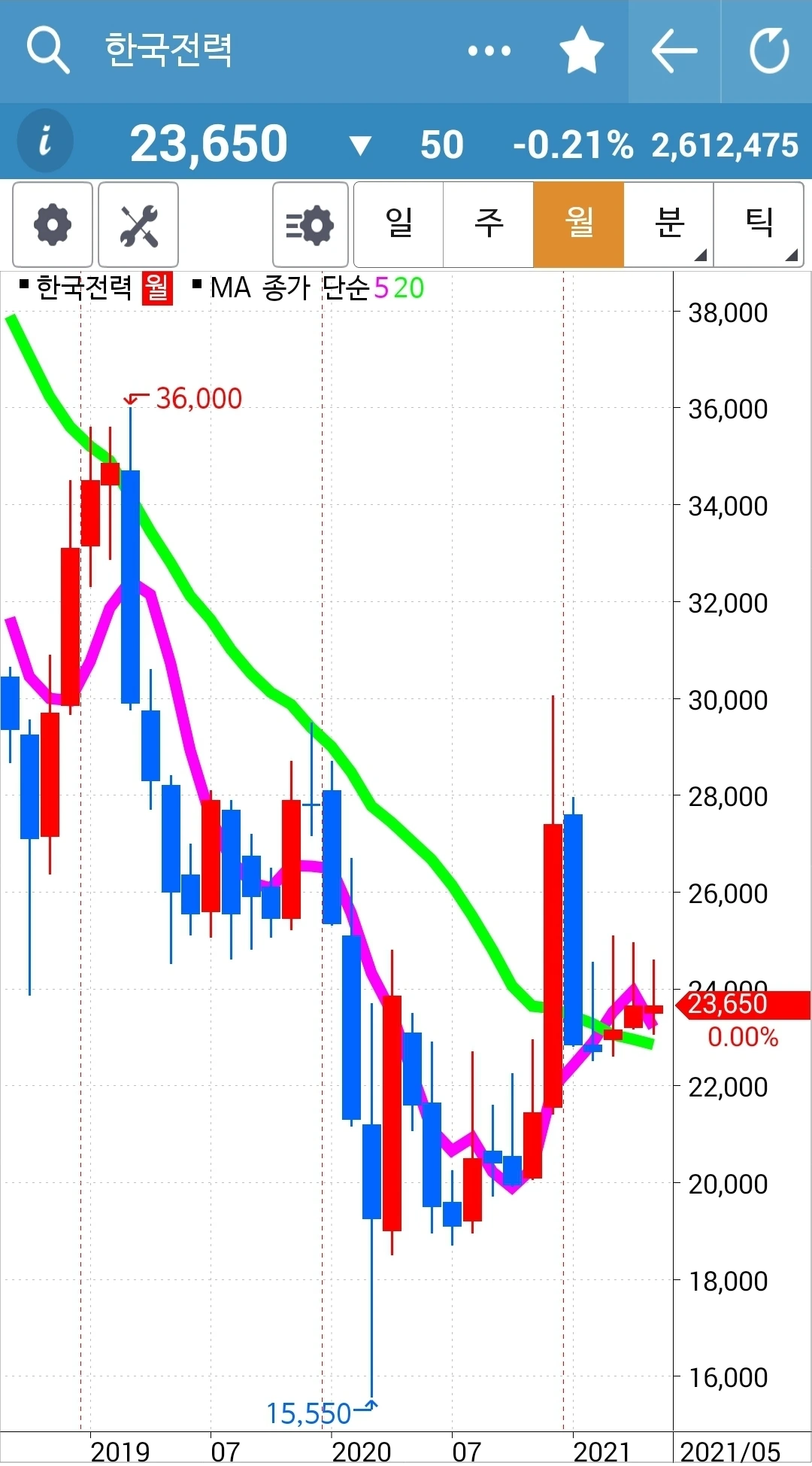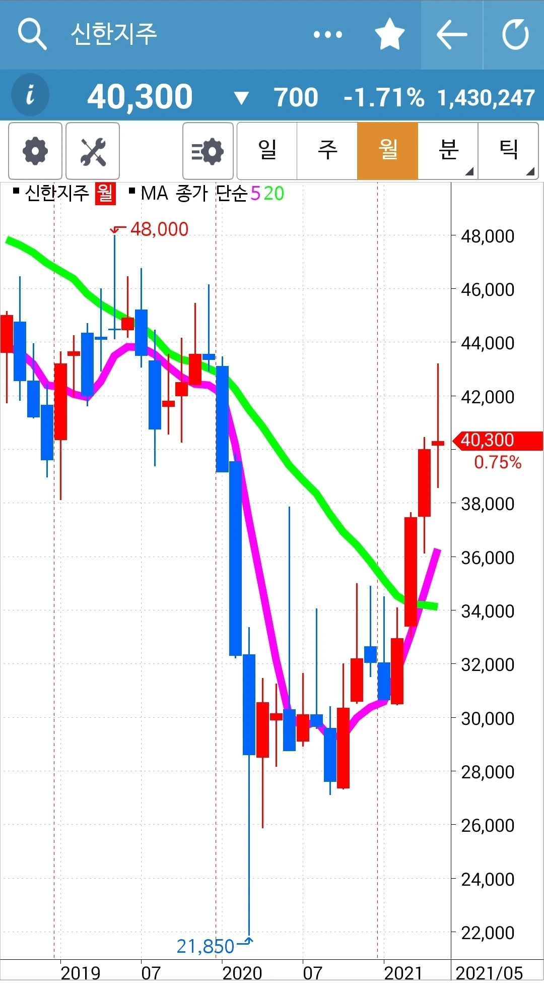 5일선이 20일선 아래로 내려갔지만 월봉이 매력적이라 가지고 있기로 했다. 현물 주식이기 때문에 가능하다.