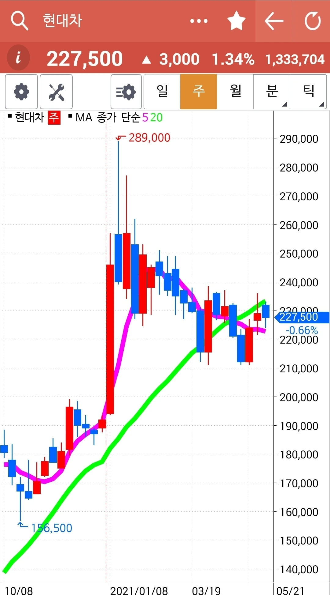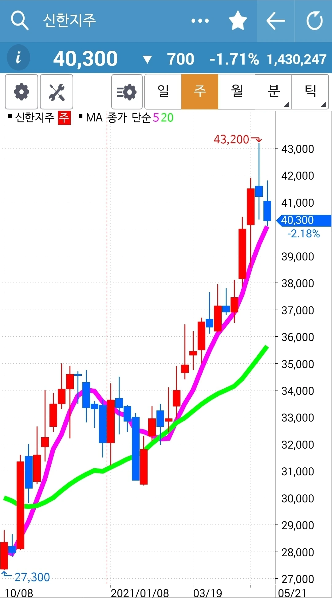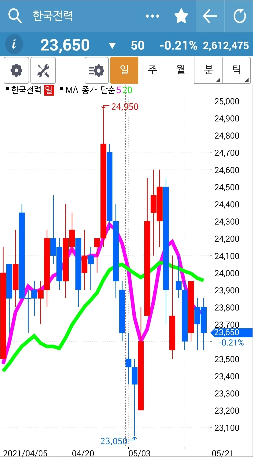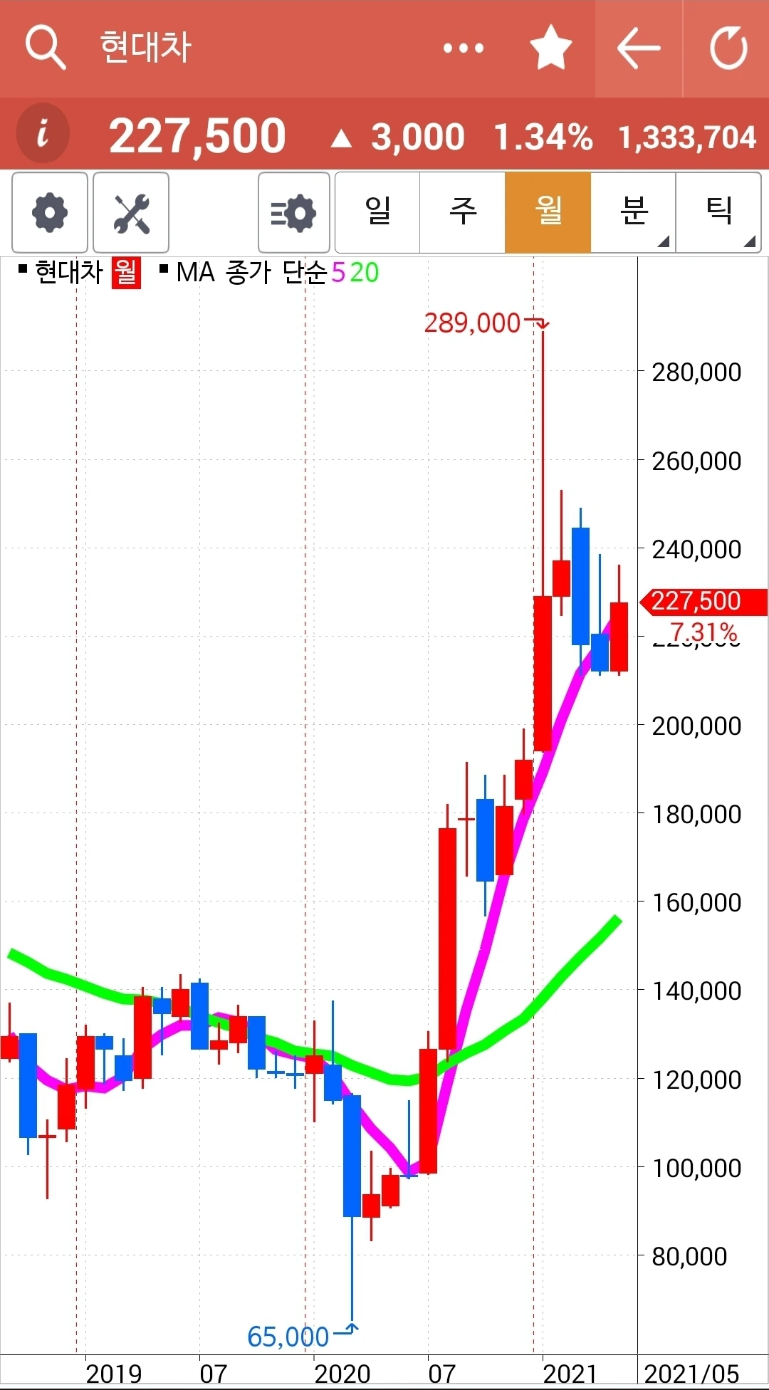 5일선이 20일선 아래로 내려갔지만 월봉이 매력적이라 가지고 있기로 했다. 현물 주식이기 때문에 가능하다.