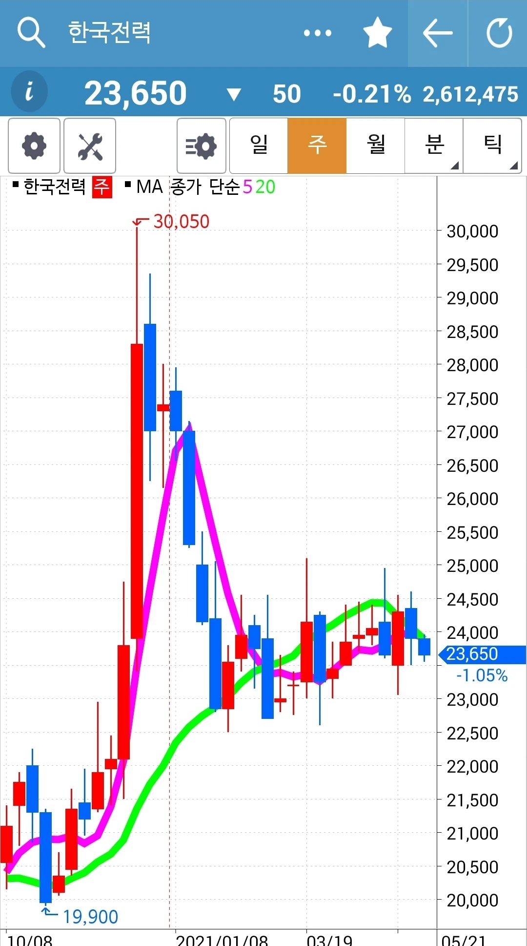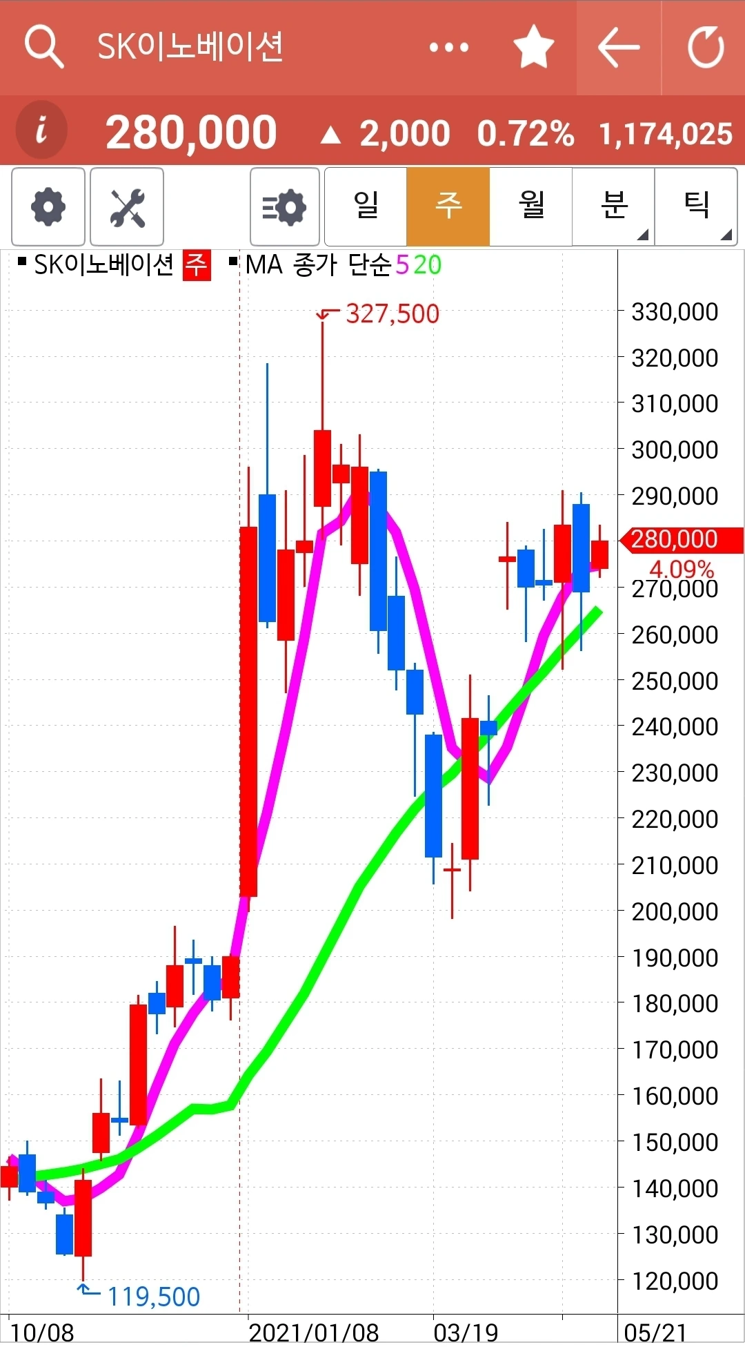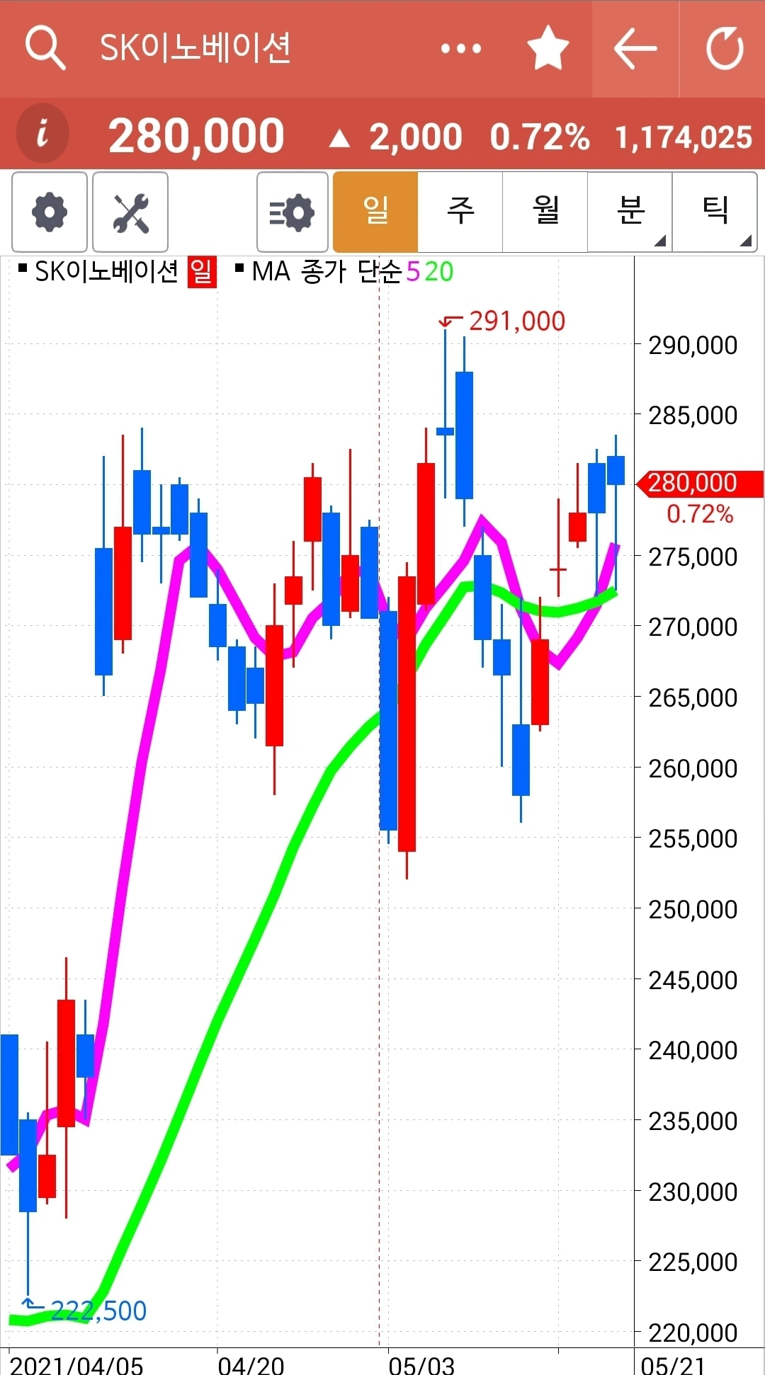 주가가 20일선 근처까지 왔다. 신나게 올라가더니 조정을 한참 받는다. 이것 역시 현물 주식이니 여유롭게 지켜본다.