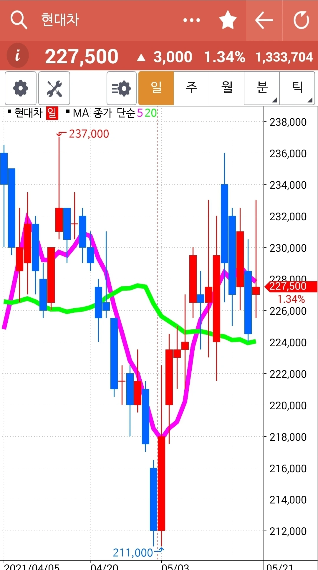 비록 얼마 안 되지만 데드크로스가 난 포스코를 정리하고 남겨진 현금으로 난 또 새로운 걸 찾아 바빴다. 그렇게 골라낸 것 현대차와 SK이노베이션. 모두 5일선이 위에 있기 때문이다. 현대차는 5일선이 20일선 위에 있으면서 주가가 20일선 근처를 찍었기 때문에 내려가지 않는다면 희망이 있다 생각해 선택했고 SK이노베이션은 밑으로 내려갔던 5일선이 빠꼼히 고개를 내밀었기 때문에 선택했다.