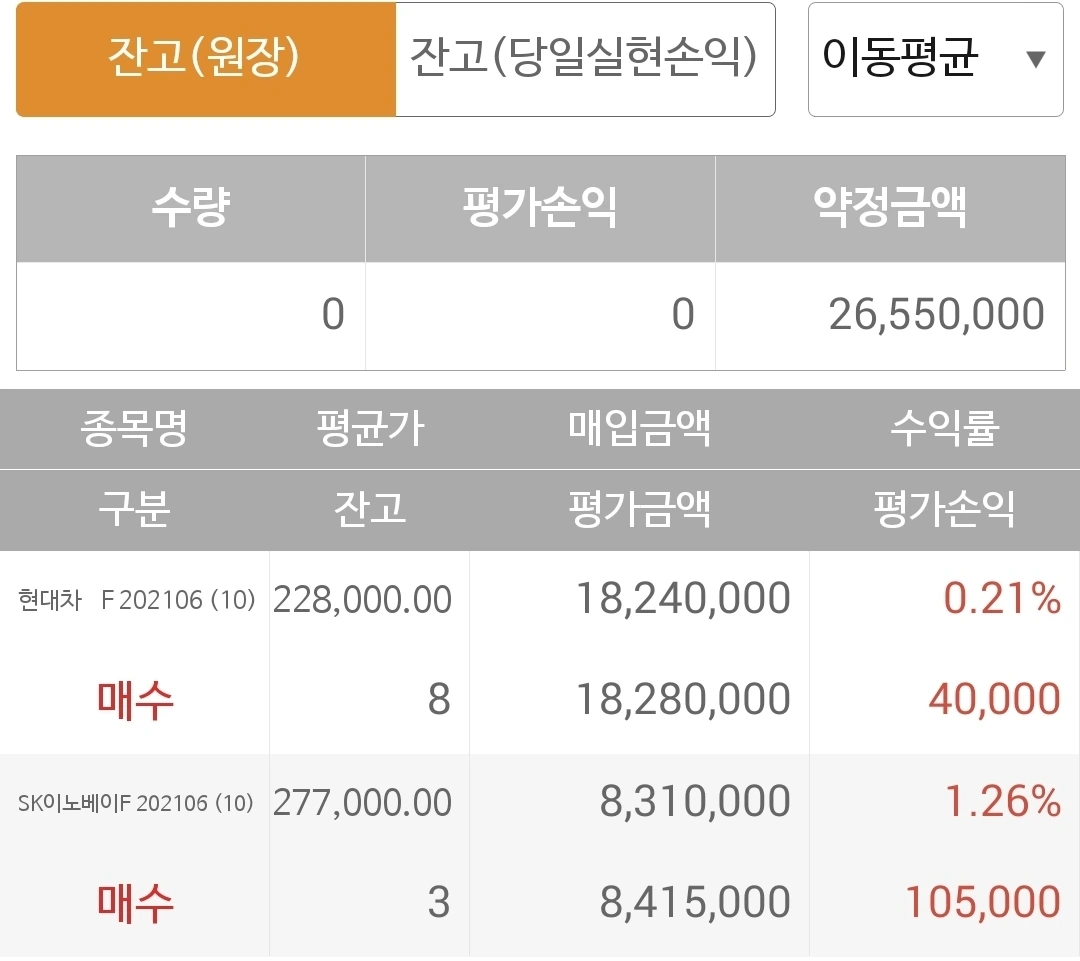 사진 2. 선물 주식. 현대차와 SK이노베이션으로 채워 넣은 모습