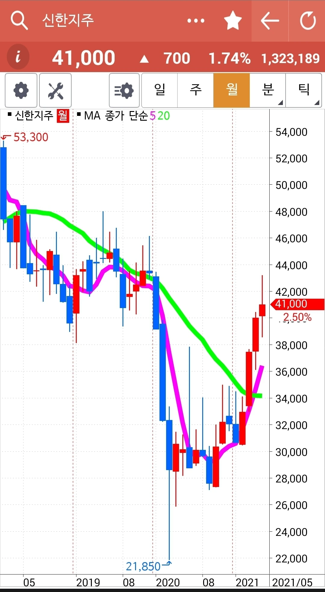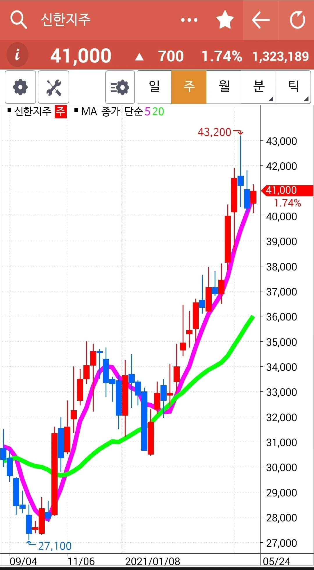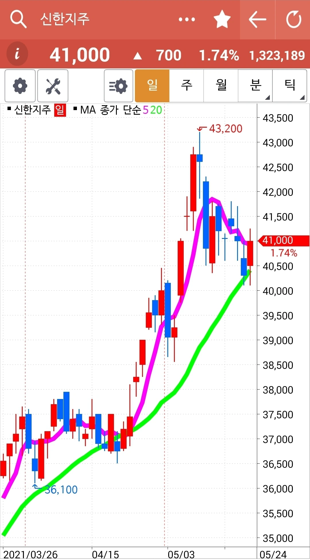 20일선에서 역시 빵! 뛰어올랐다. 그냥 쭉쭉빵빵 올라가는 것보다 이렇게 굴곡을 이루며 올라가는 것이 훨씬 오래갈 수 있으므로 파이팅!! 굴곡을 아주 예쁘게 만들며 가고 계십니다~ 하하