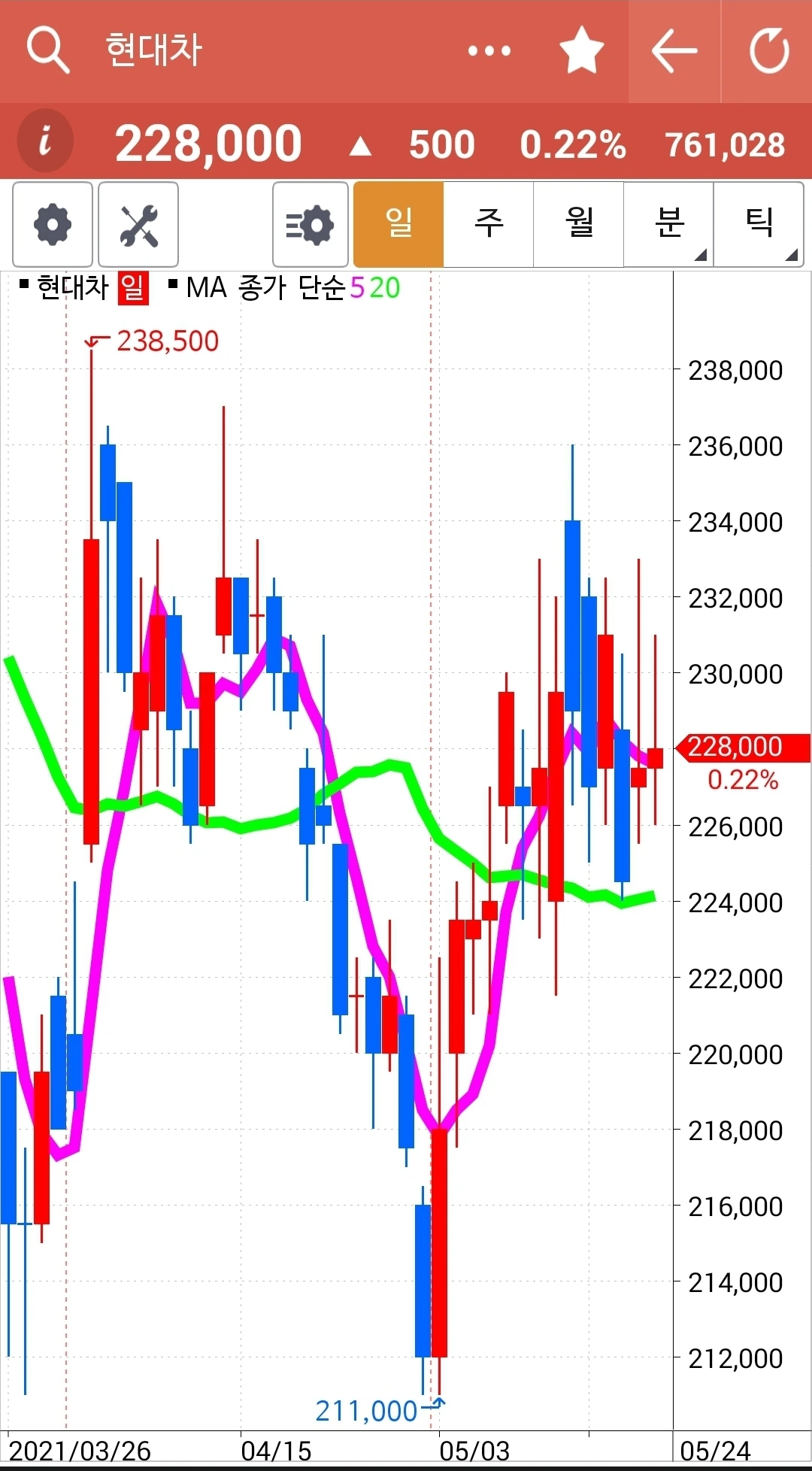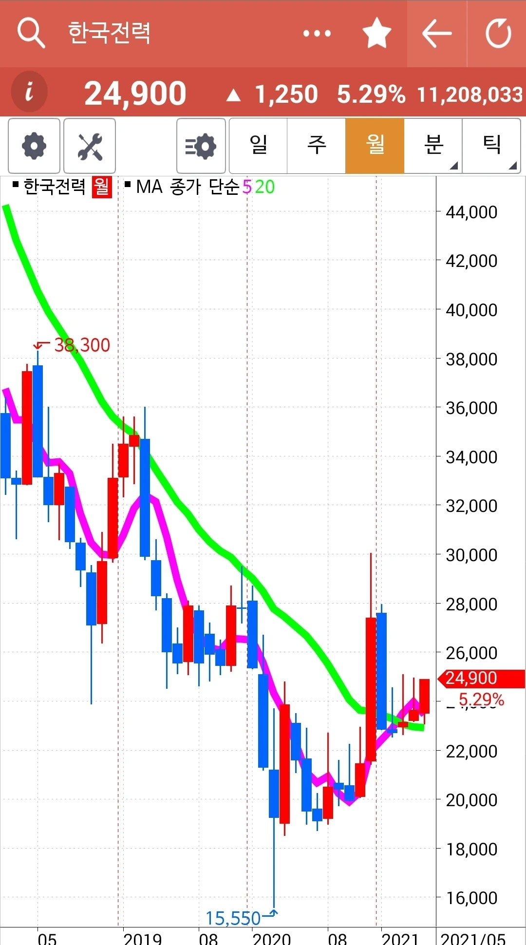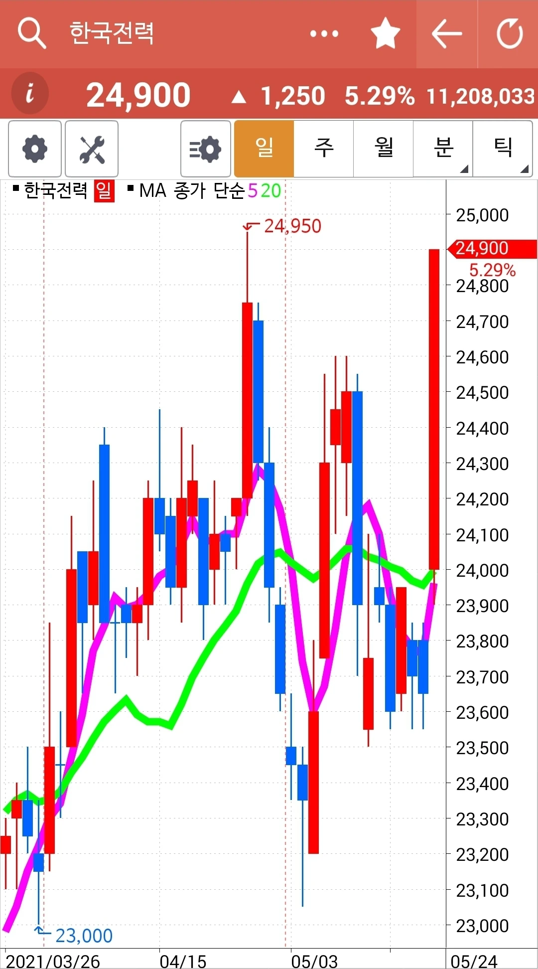 하핫 한국전력 빵! 빵빵! 월봉이 너무 매력적이라 가지고 있던 한국전력이 빵! 빵빵! 솟았다. 오홋. 이렇게 기쁠 수가. 그러나 좋은 일만 있는 건 아니다. 5일선이 20일선 위에 있다고 골라낸 종목 중 SK이노베이션은 매우 떨어졌기 때문이다. 게다가 그건 선물주식이니 더욱 타격이 크다. 잘 지켜보다 5일선이 아래로 가면 탈락시켜야 한다. 그것만이 내가 할 일이다.