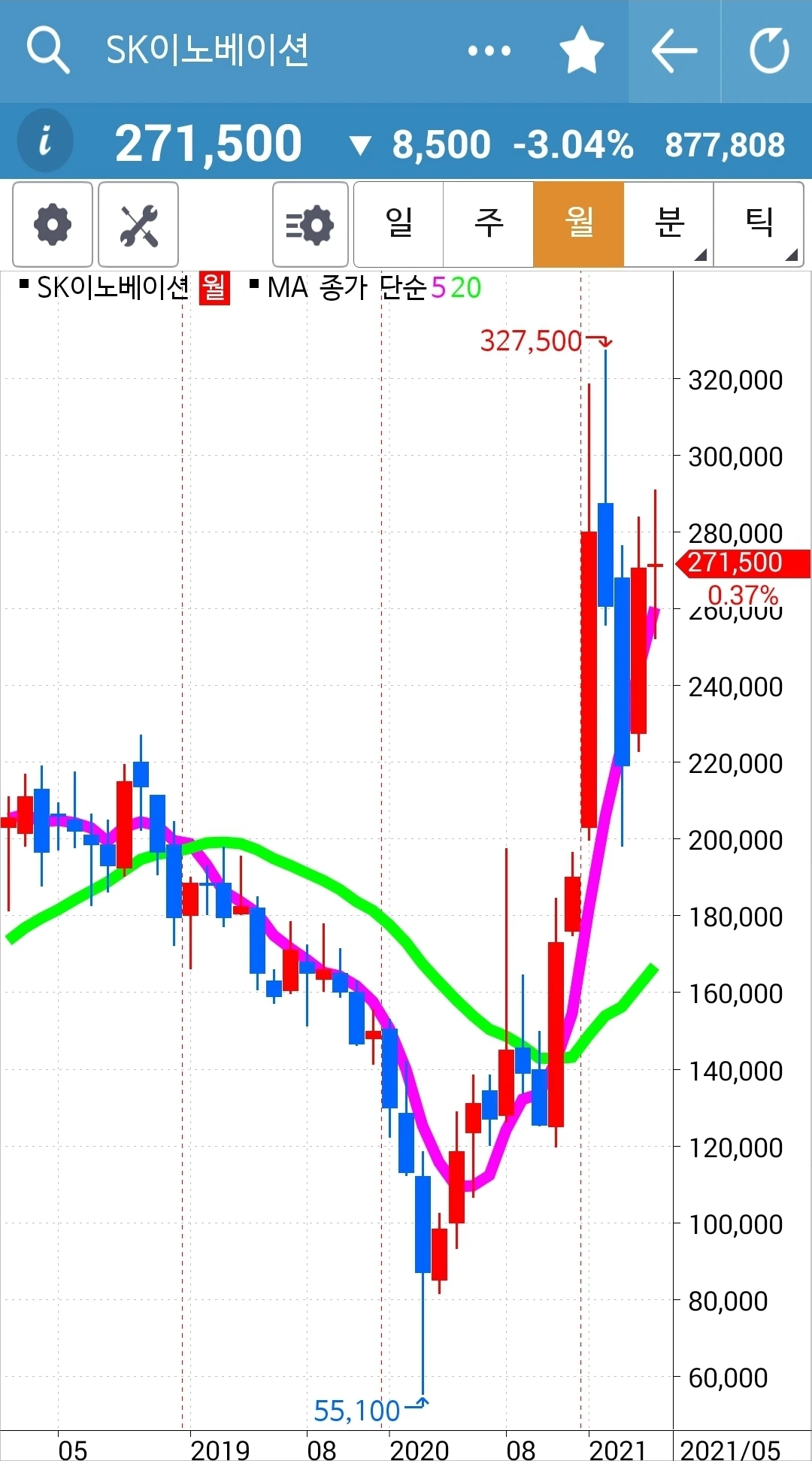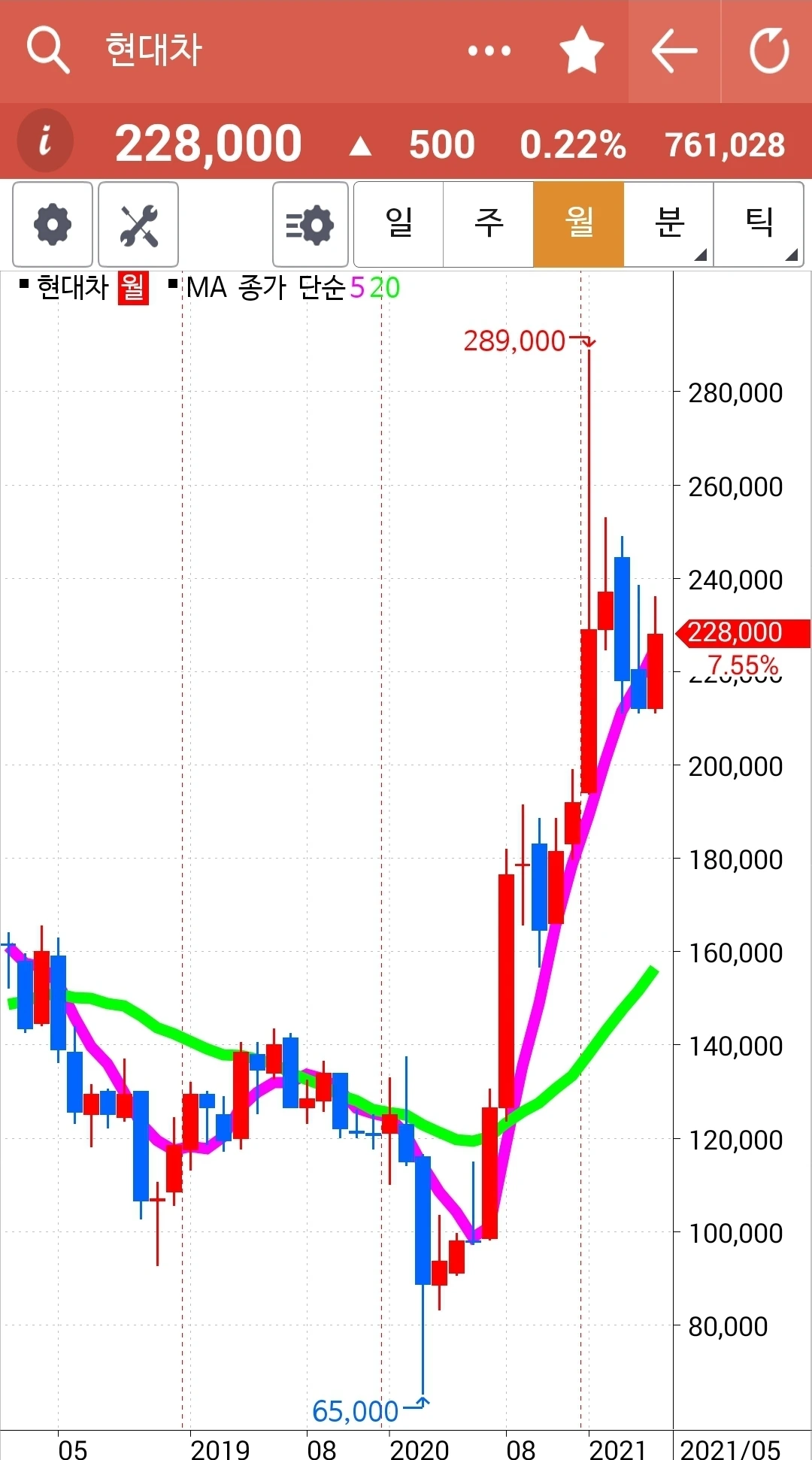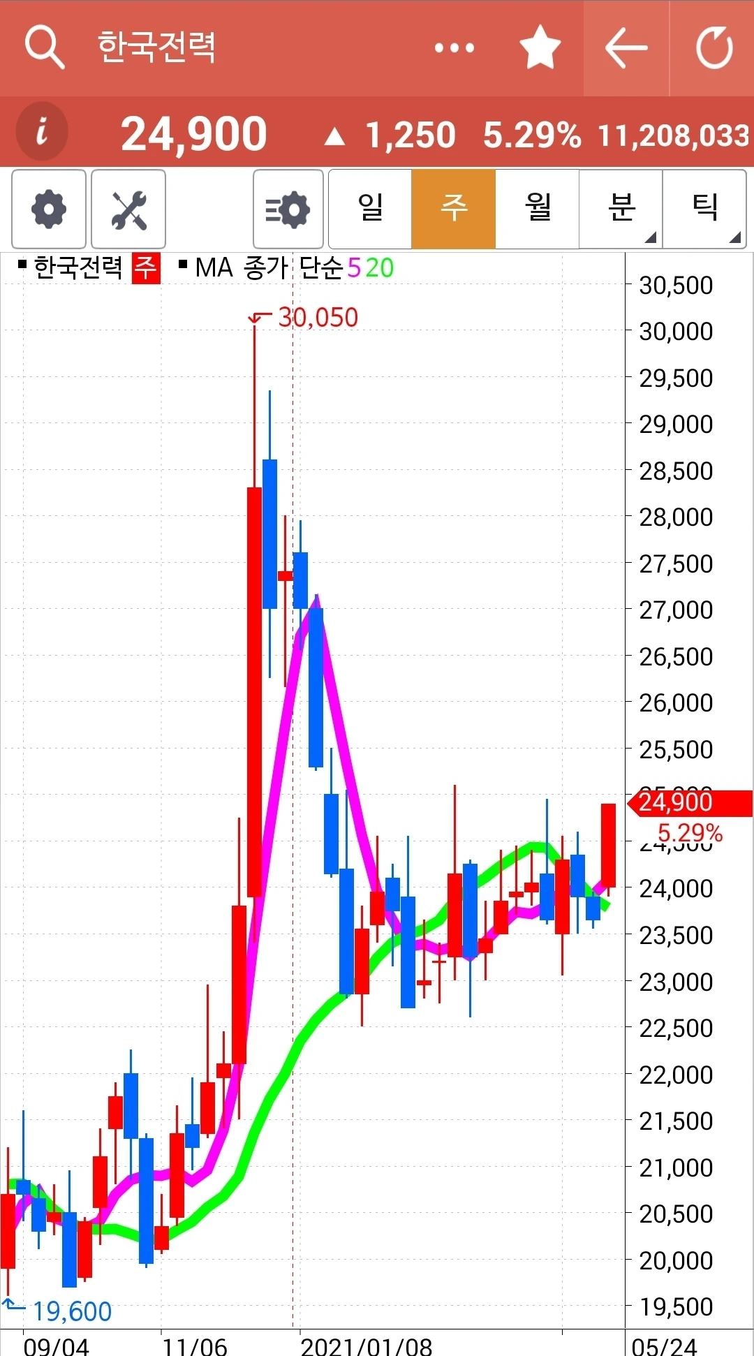 하핫 한국전력 빵! 빵빵! 월봉이 너무 매력적이라 가지고 있던 한국전력이 빵! 빵빵! 솟았다. 오홋. 이렇게 기쁠 수가. 그러나 좋은 일만 있는 건 아니다. 5일선이 20일선 위에 있다고 골라낸 종목 중 SK이노베이션은 매우 떨어졌기 때문이다. 게다가 그건 선물주식이니 더욱 타격이 크다. 잘 지켜보다 5일선이 아래로 가면 탈락시켜야 한다. 그것만이 내가 할 일이다.