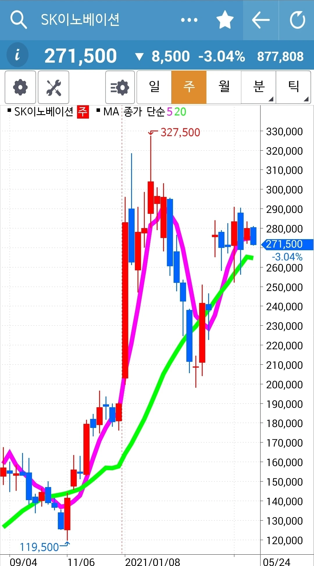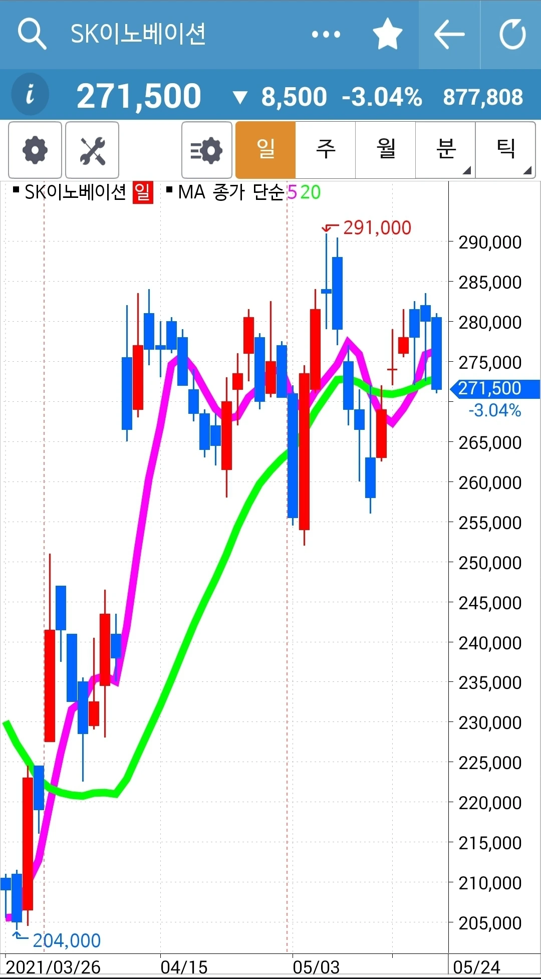 선물주식이므로 5일선과 20일선에 민감해야만 한다. 바로 요거. '난 아무것도 몰라요 5일선이 20일선 아래로 가면 매도할 뿐야요~'를 여기선 무슨 일이 있어도 꼭 지켜야만 한다. 옛쏠!!!