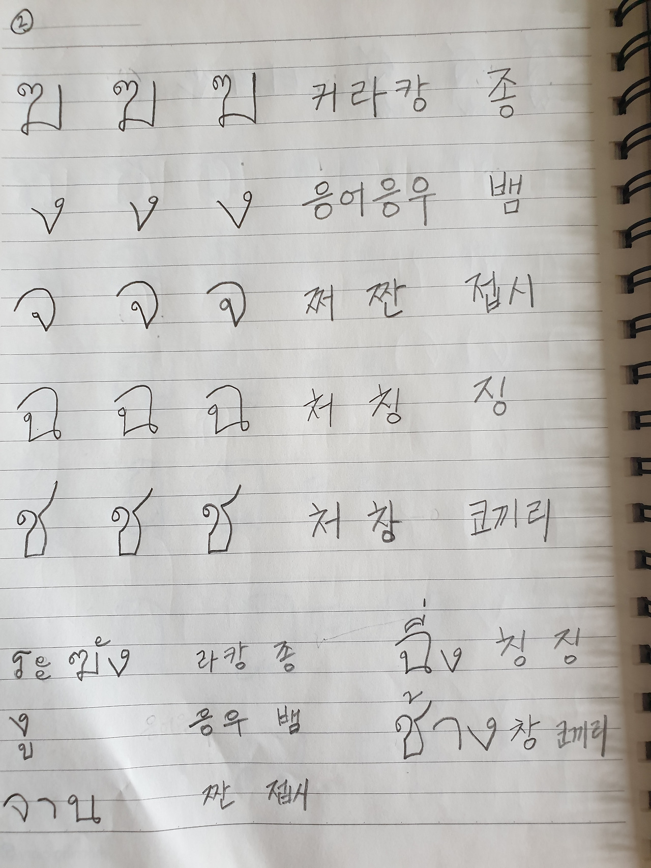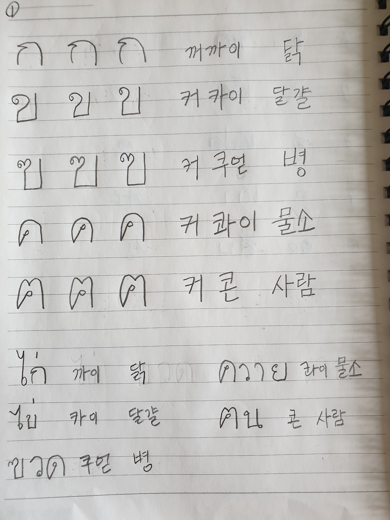 하하 무슨 그림 그리는 것 같다. 태국어 키보드가 없으니 방법이 없다. 내가 노트에 적어 사진 찍어 올리는 수밖에. 이런 식으로 하루에 조금씩 하다 보면 자음 다 알고 단어도 알아가고 그리고 겨울에 태국에 가면 그래도 조금이라도 말도 해보고 간판도 읽어볼 수 있지 않을까.
