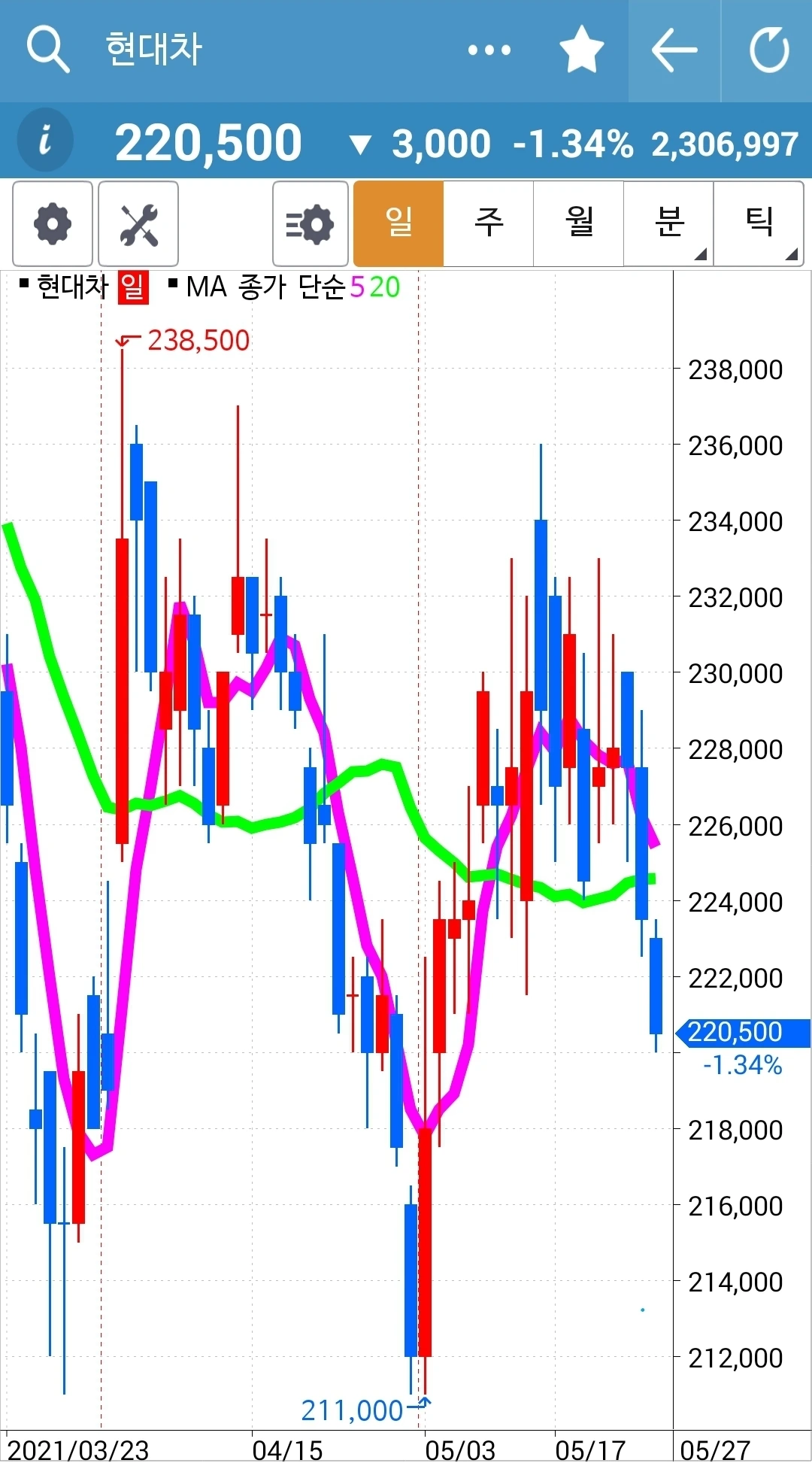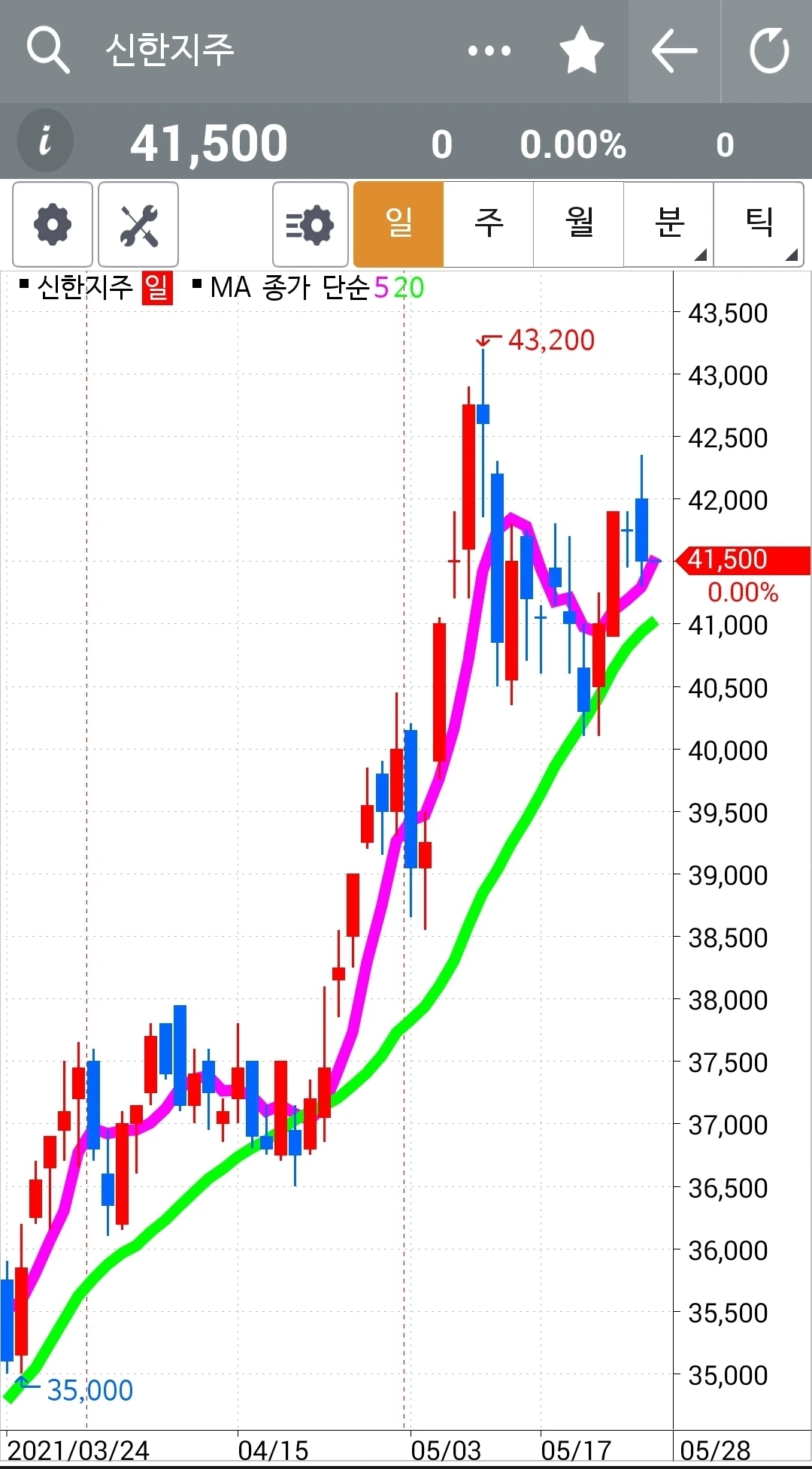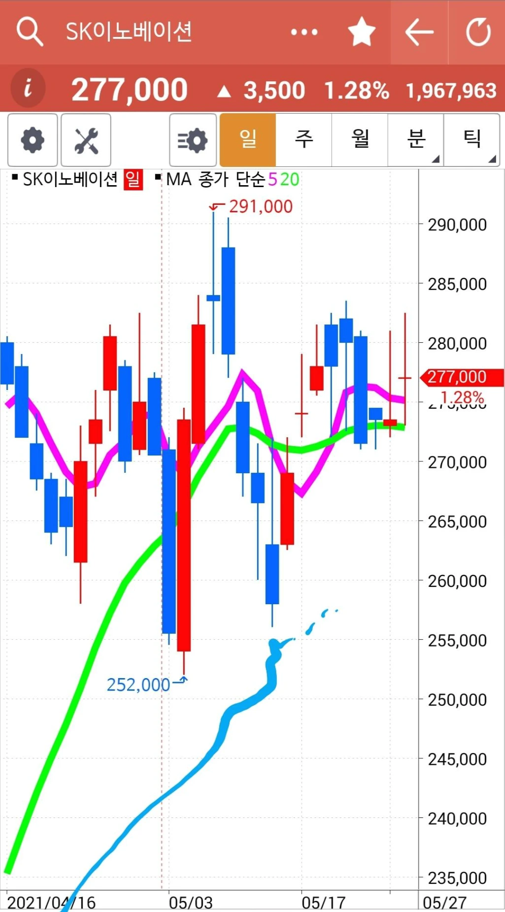 전일 고점도 뚫고 저점도 뚫고 좀 멈추어가려는가. 그래도 5일선이 20일선 위에 있으므로 고우 고우 게다가 현물 주식이니 안달할 것도 없습니다. 안전하니까. 파이팅!