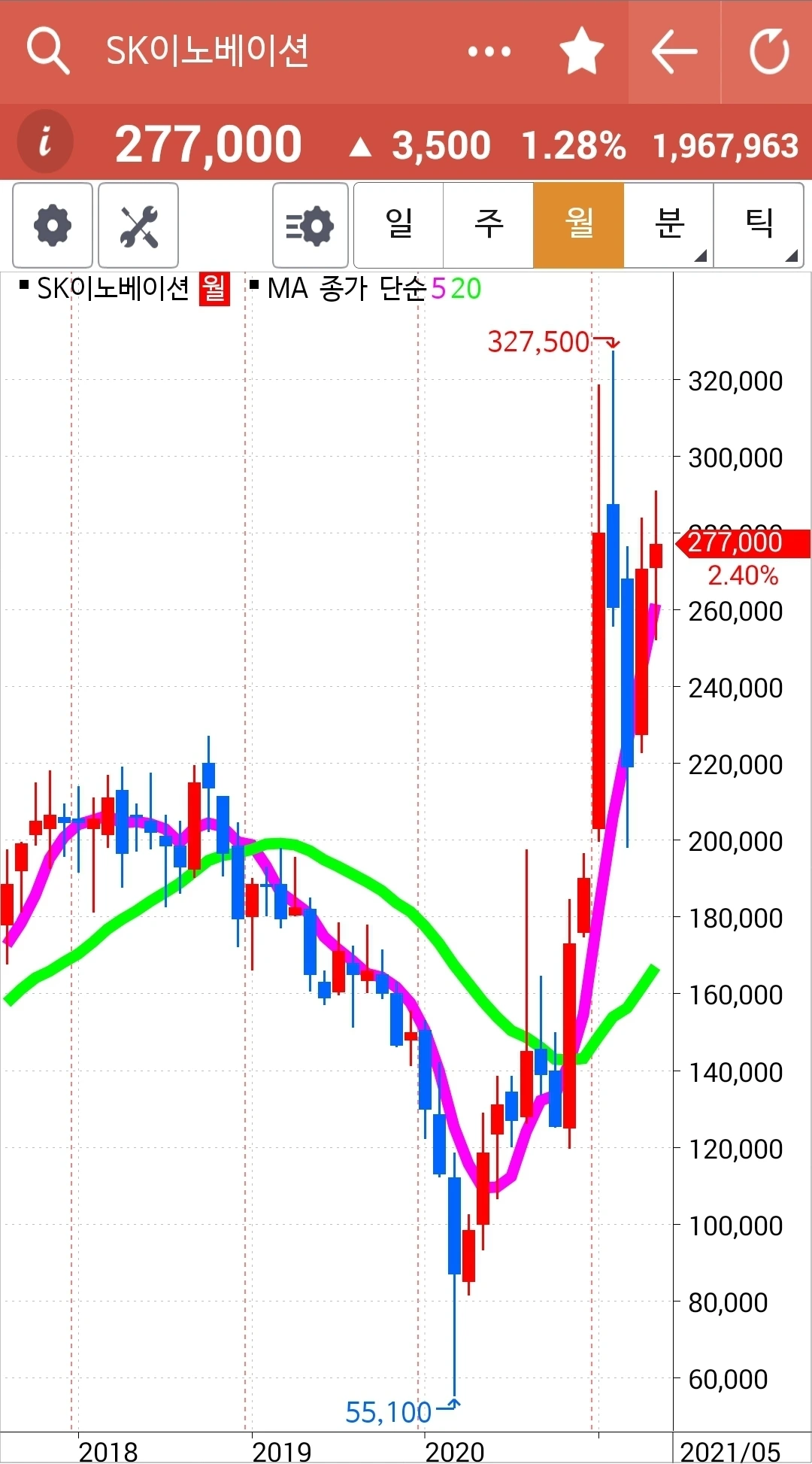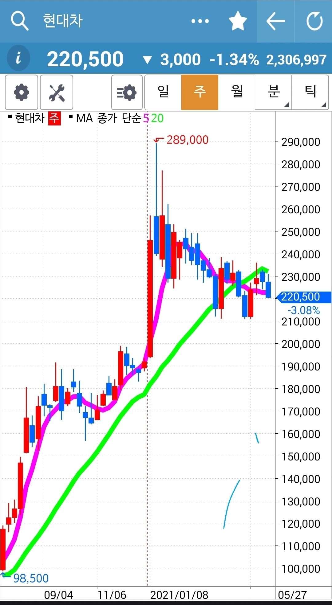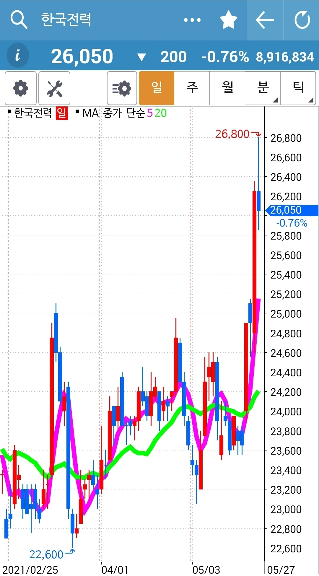 전일 고점도 뚫고 저점도 뚫고 좀 멈추어가려는가. 그래도 5일선이 20일선 위에 있으므로 고우 고우 게다가 현물 주식이니 안달할 것도 없습니다. 안전하니까. 파이팅!