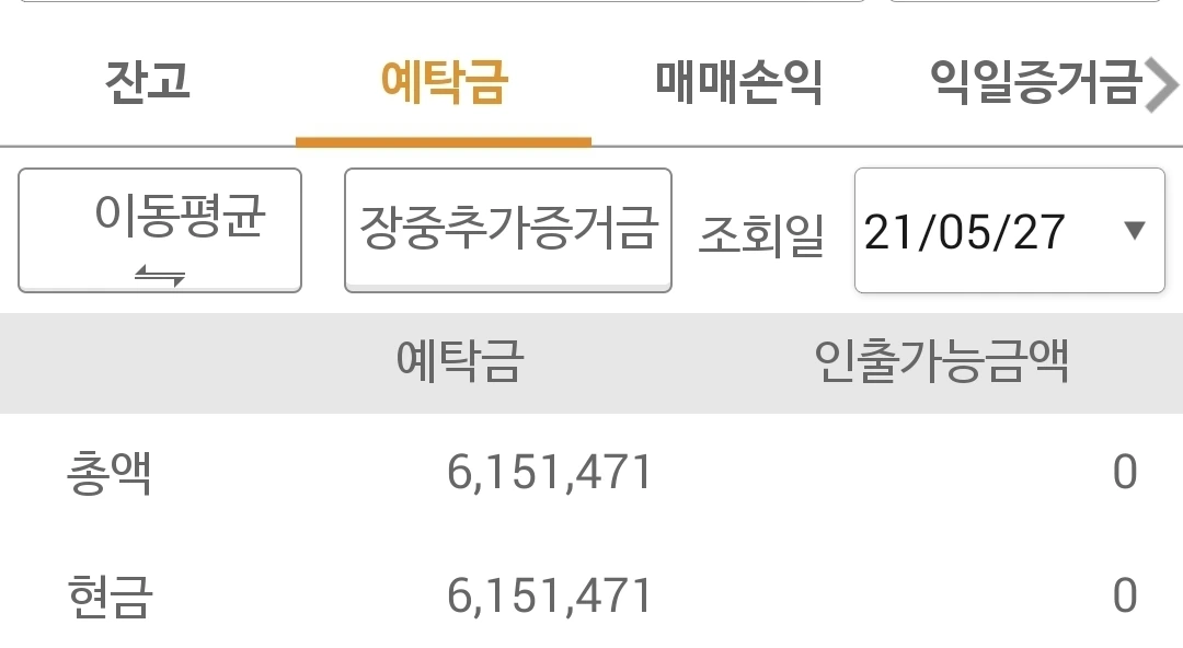 사진 3. 선물 주식 예탁금. 615만 원이라니. 투자원금이 850만 원인데 무려 235만 원의 손실을 기록하고 있다. 파이팅!!!