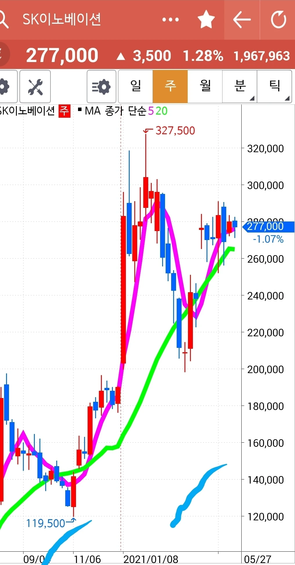 5일선이 20일선과 평행을 그리며 나란히 그래도 위를 유지하고 있으므로 이 종목 역시 고우 고우. 밑에 예술가가 그린 듯 파란 꼬불탕 선이 보이시나요? 무엇일까요? 푸하하하 글은 아침에 쓴다 해도 차트는 모두 전날 밤 12시 이전에 정리해두어야 내려가면 내려간 대로 올라가면 올라간 대로 빨간색 파란색 차트를 얻을 수가 있답니다. 밤늦게야 안 한 걸 알고 졸려 죽겠는데 그래도 차트는 저장해두어야 한다며 캡처하다 졸아 손이 맘대로 눌러져 그림이 그려진 것이랍니다. 하하 졸음의 흔적.