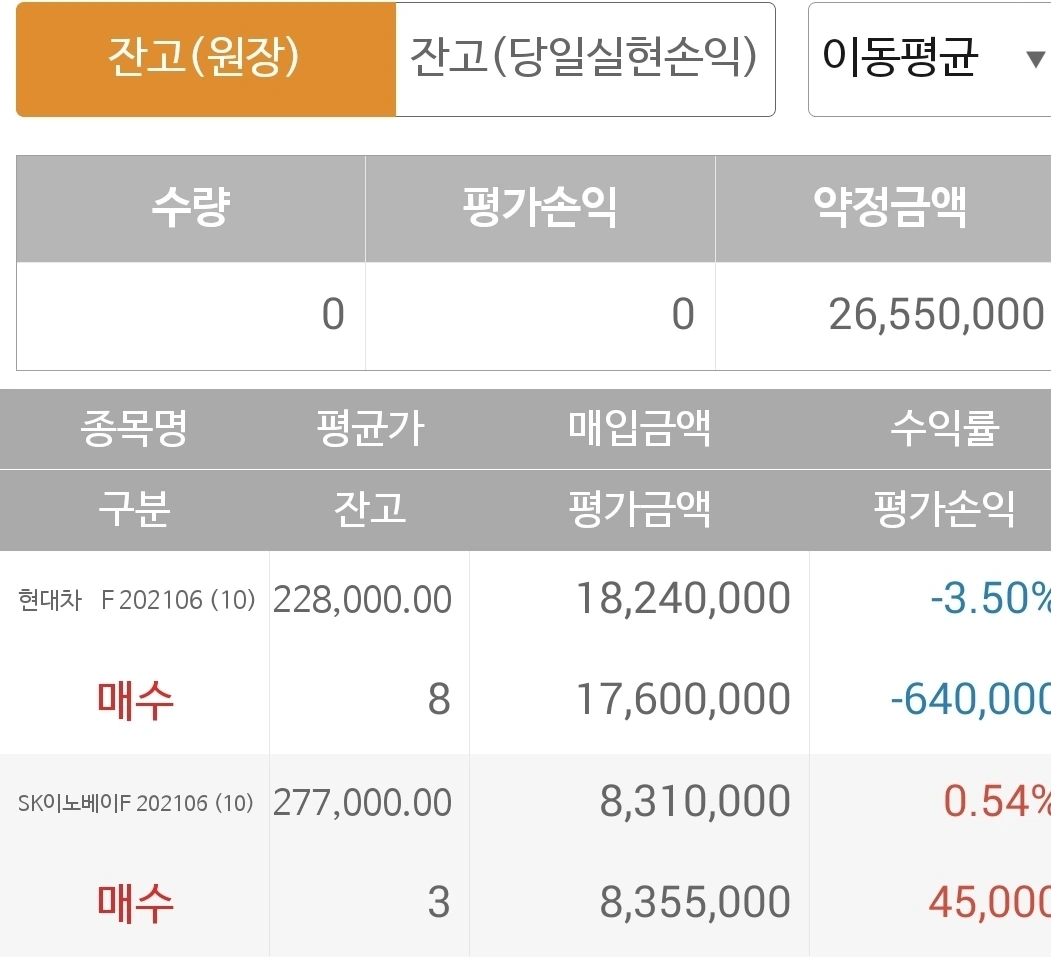 사진 2. 선물 주식. 그야말로 처참하다. 파이팅해도 모자랄 판에 새로 들어간 현대차가 저리도 큰 손실을 기록하고 있으니 말이다. 에고.