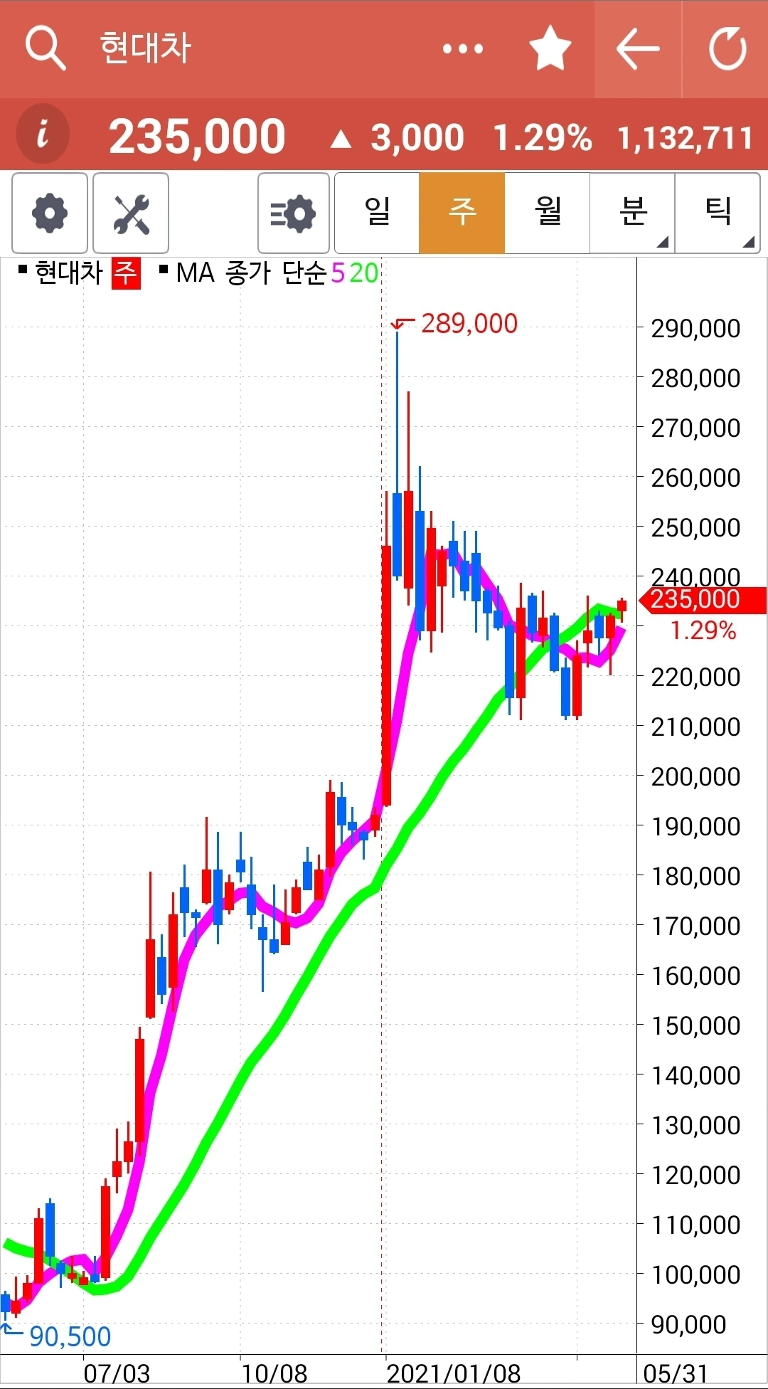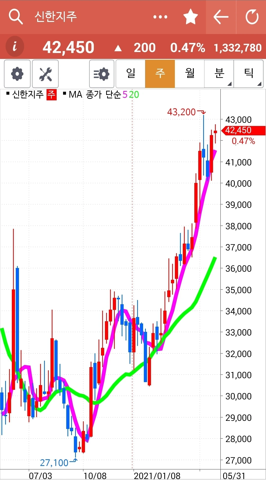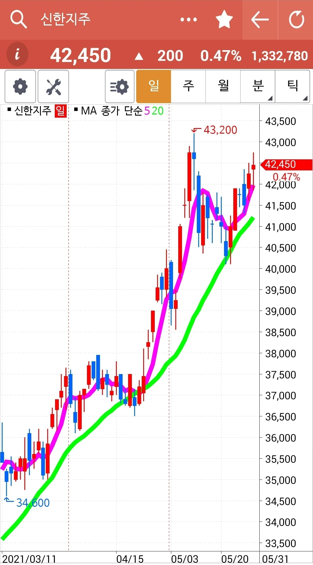 역시 예쁘게 올라가고 있다. 꼭지는 알 수 없다. 다만 난 5일선이 20일선 아래로 내려오는가만 지켜볼 뿐이다. 파이팅!!!