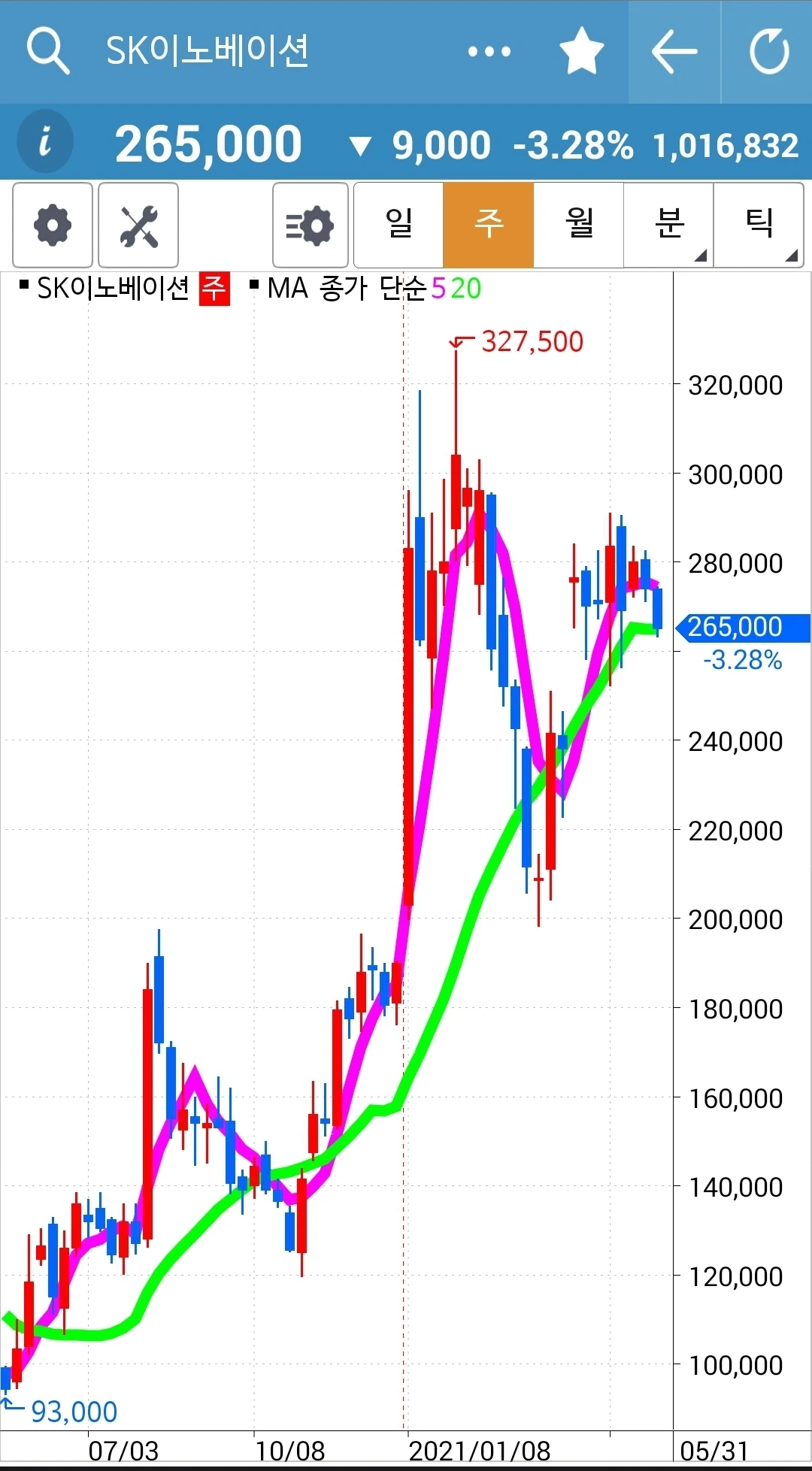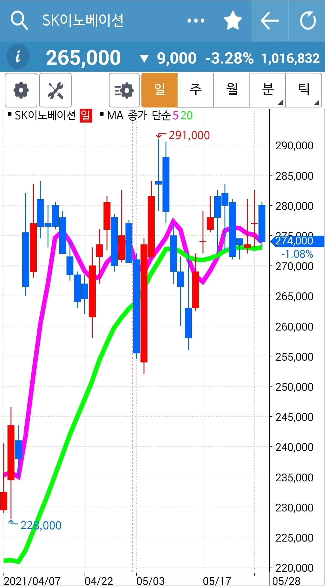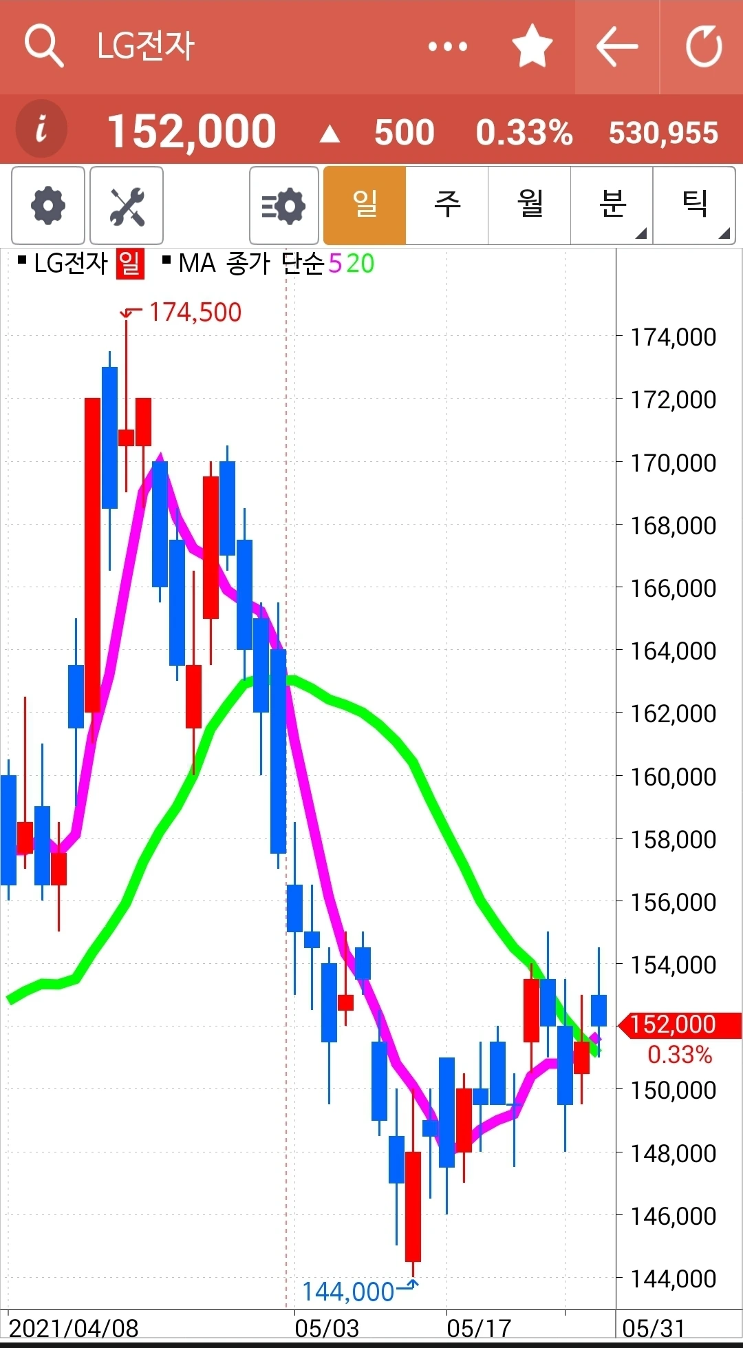 캬~ 어쩜 이럴 수가. 배신을 때려도 유분수지. 도약을 위한 웅크림으로 보았건만 그게 아니라 작정하고 내려갈 준비였나 보다. SK이노베이션이 그야말로 뚝! 뚝뚝!이다. 5일선이 20일선에 닿은 것도 같다. 눈을 동그랗게 뜨고 확대해보았다. 아슬아슬 아직 5일선이 20일선 위에 있다. 그래서 살아남았지만 너! 오늘 올라가지 못하면 그대로 탈락이야. 대신 나의 사랑 LG전자 5일선이 빠꼼히 20일선 위로 고개를 내밀었다. 절로 손가락이 움직였지만 나에겐 현금이 없다. 그래도! 가능 최대수를 눌러보니 1개를 살 수 있다 한다. 하하 오케이. 단 한 개지만 무조건 산다. '난 아무것도 몰라요 5일선이 20일선 위로 올라오면 매수할 뿐야요~' 니까. SK이노베이션 듣거라. 오늘 올라가지 못하면 5일선은 결국 20일선을 침범하게 될 것이요 그렇다면 난 너를 버릴 수밖에 없다는 것을. 그 돈으로 난 나의 사랑 LG전자로 몽땅 갈아탈 것이니 단디 하레이. 푸하하하 파이팅!!!