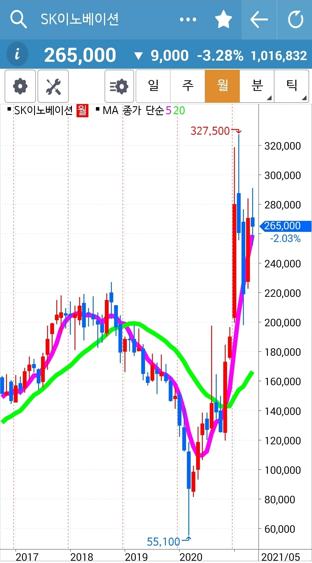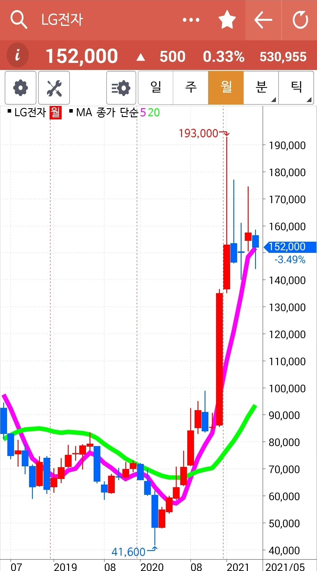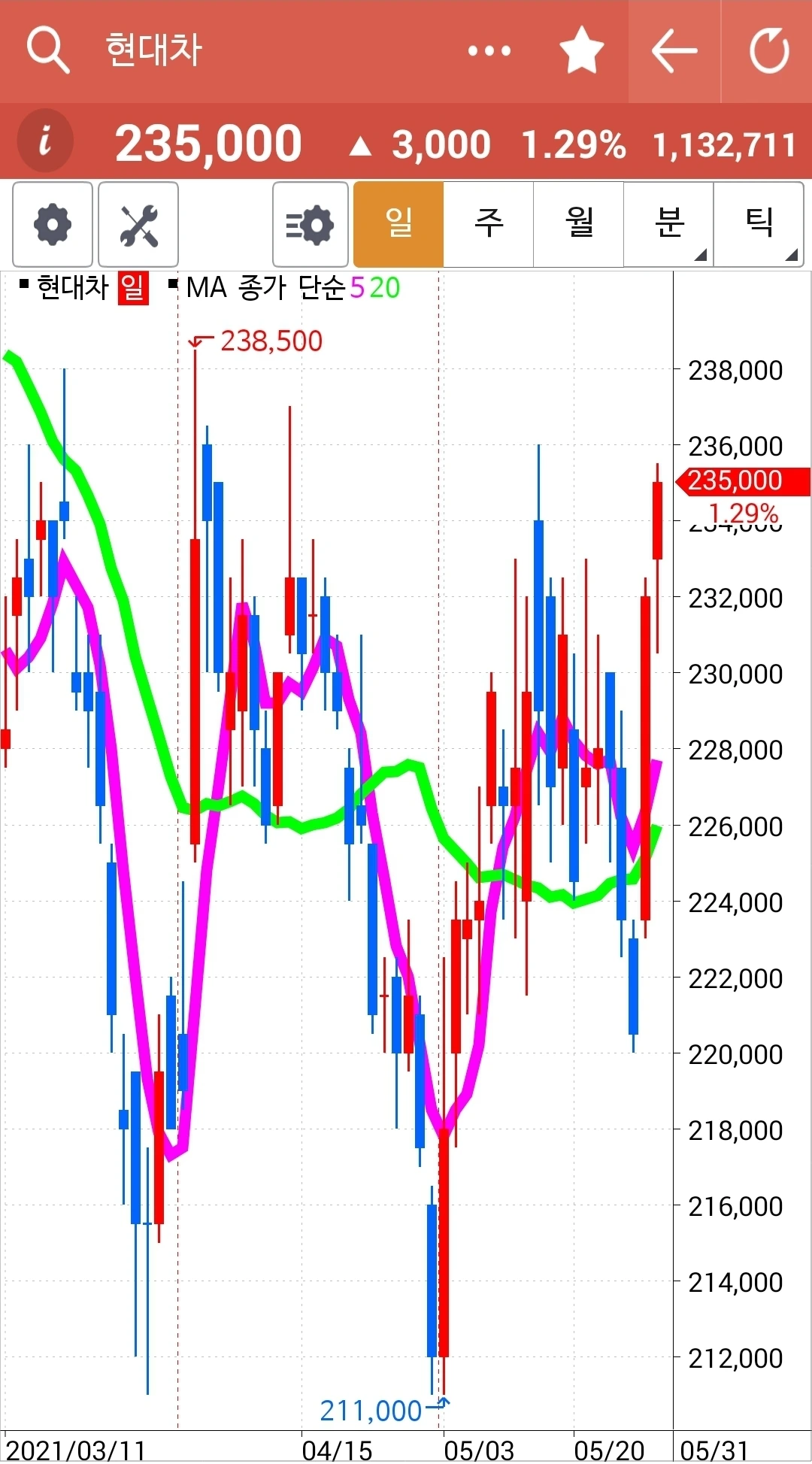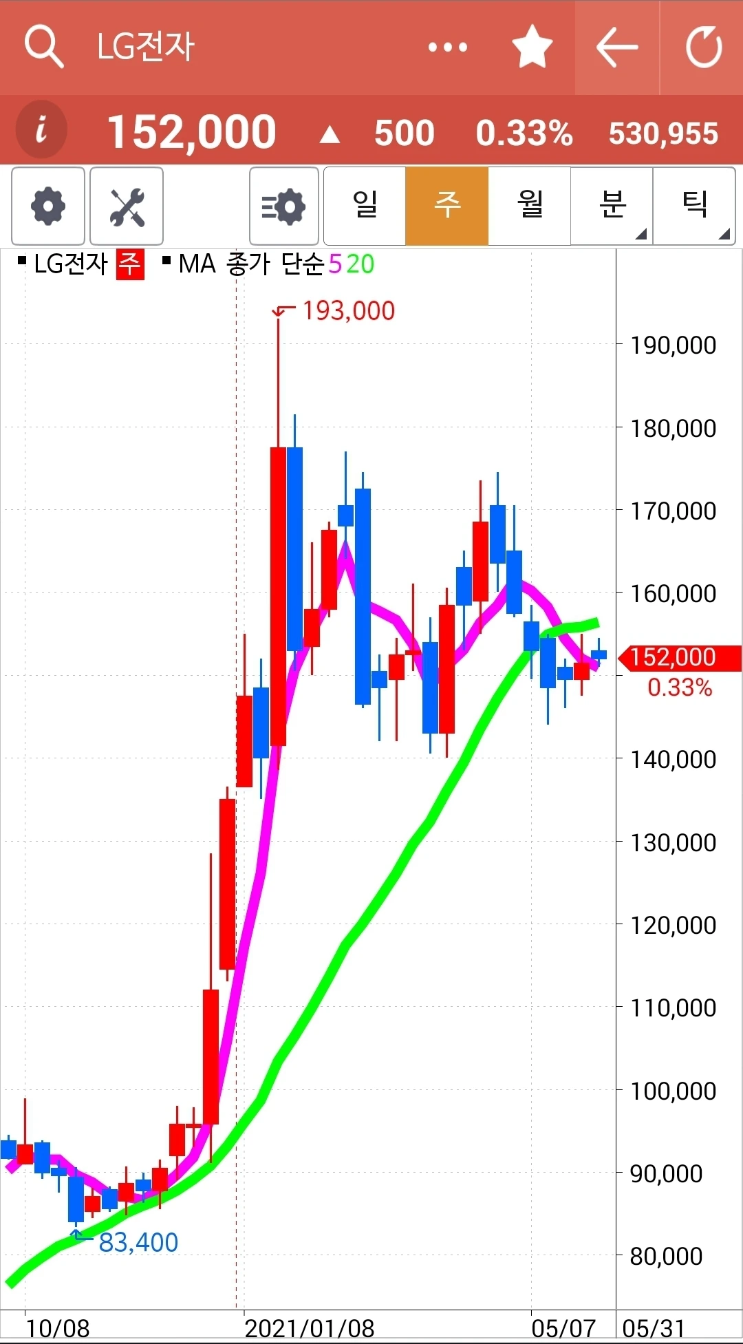 캬~ 어쩜 이럴 수가. 배신을 때려도 유분수지. 도약을 위한 웅크림으로 보았건만 그게 아니라 작정하고 내려갈 준비였나 보다. SK이노베이션이 그야말로 뚝! 뚝뚝!이다. 5일선이 20일선에 닿은 것도 같다. 눈을 동그랗게 뜨고 확대해보았다. 아슬아슬 아직 5일선이 20일선 위에 있다. 그래서 살아남았지만 너! 오늘 올라가지 못하면 그대로 탈락이야. 대신 나의 사랑 LG전자 5일선이 빠꼼히 20일선 위로 고개를 내밀었다. 절로 손가락이 움직였지만 나에겐 현금이 없다. 그래도! 가능 최대수를 눌러보니 1개를 살 수 있다 한다. 하하 오케이. 단 한 개지만 무조건 산다. '난 아무것도 몰라요 5일선이 20일선 위로 올라오면 매수할 뿐야요~' 니까. SK이노베이션 듣거라. 오늘 올라가지 못하면 5일선은 결국 20일선을 침범하게 될 것이요 그렇다면 난 너를 버릴 수밖에 없다는 것을. 그 돈으로 난 나의 사랑 LG전자로 몽땅 갈아탈 것이니 단디 하레이. 푸하하하 파이팅!!!