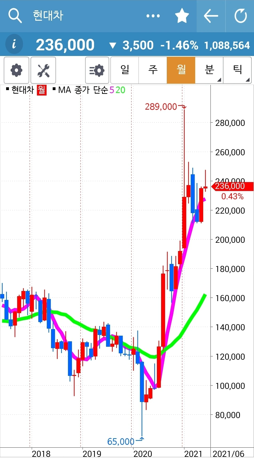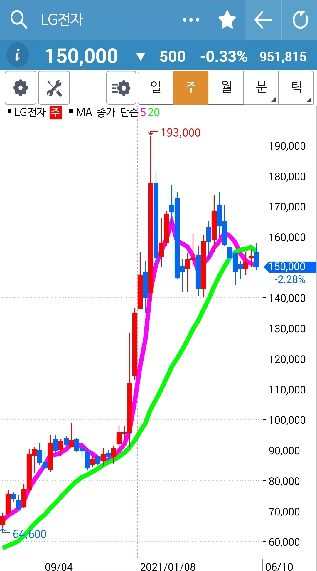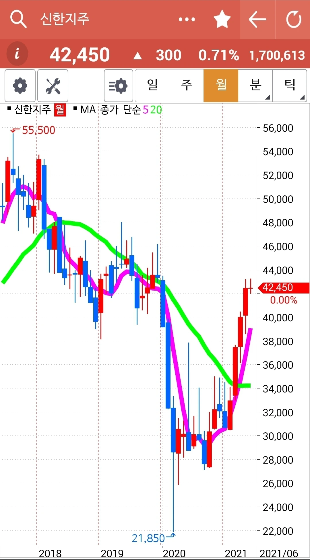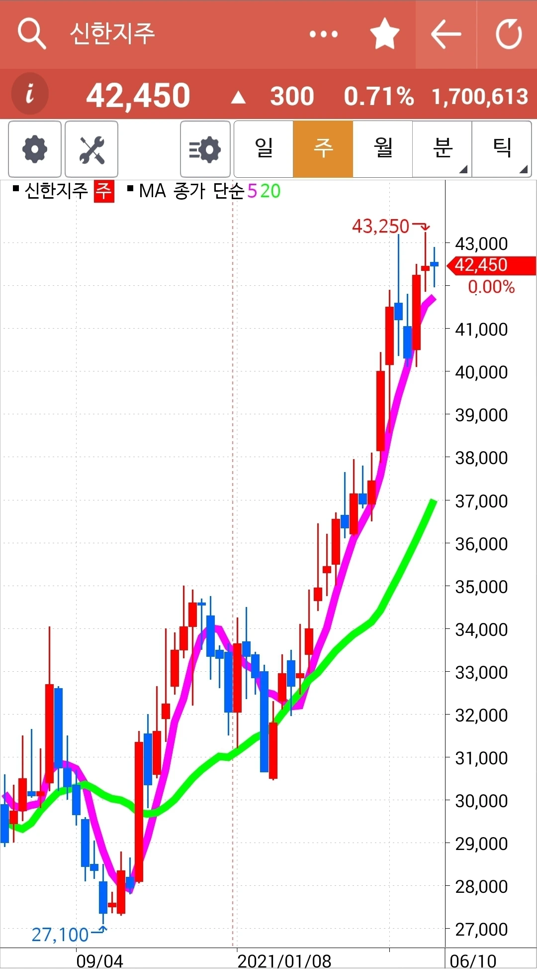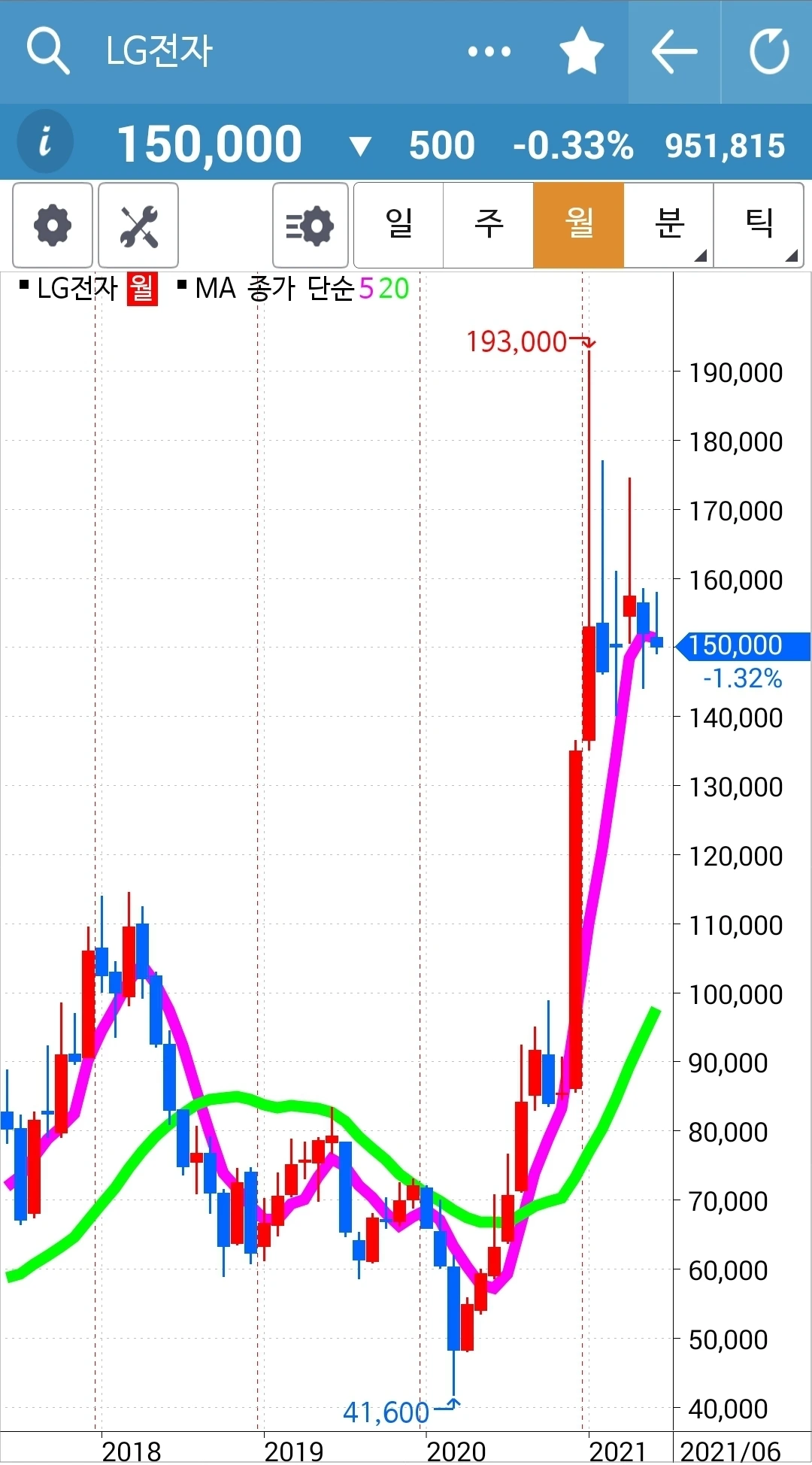 이것 역시 모두 즉 5일선, 5 주선, 5개월선이 20일선, 20 주선 20개월선 위에 있으므로 오케이다. 게다가 현물 주식이므로 급할 거 없다. 파이팅.