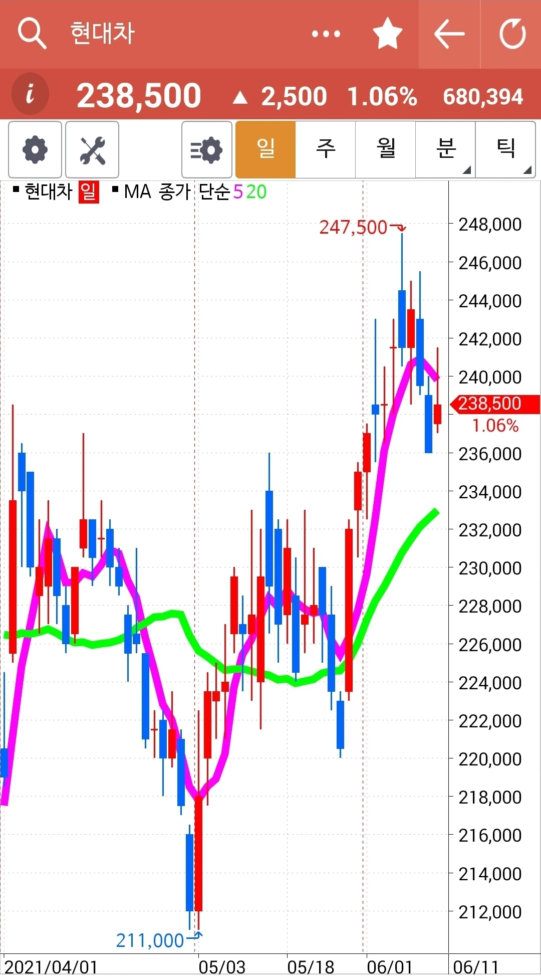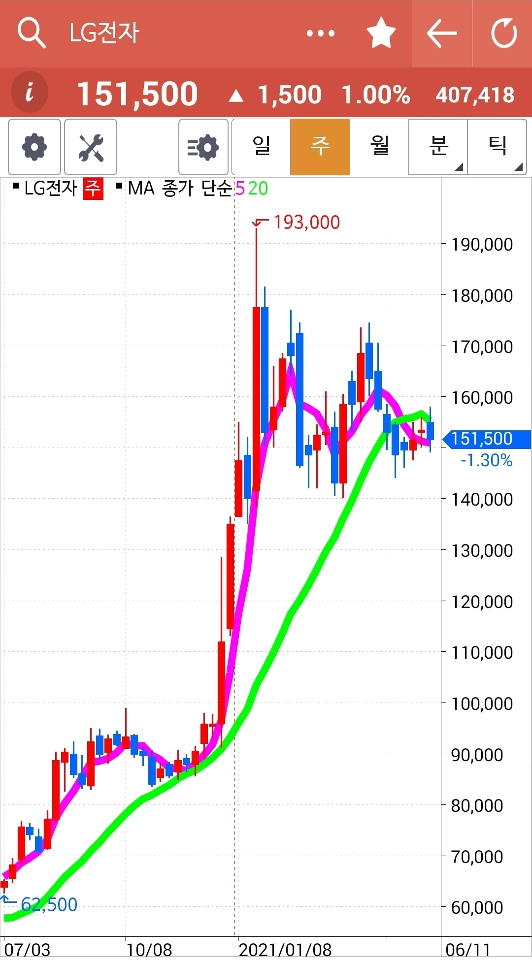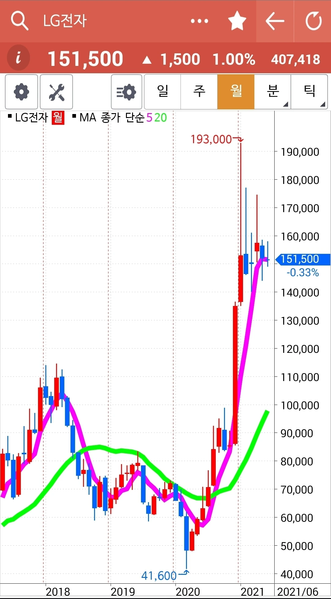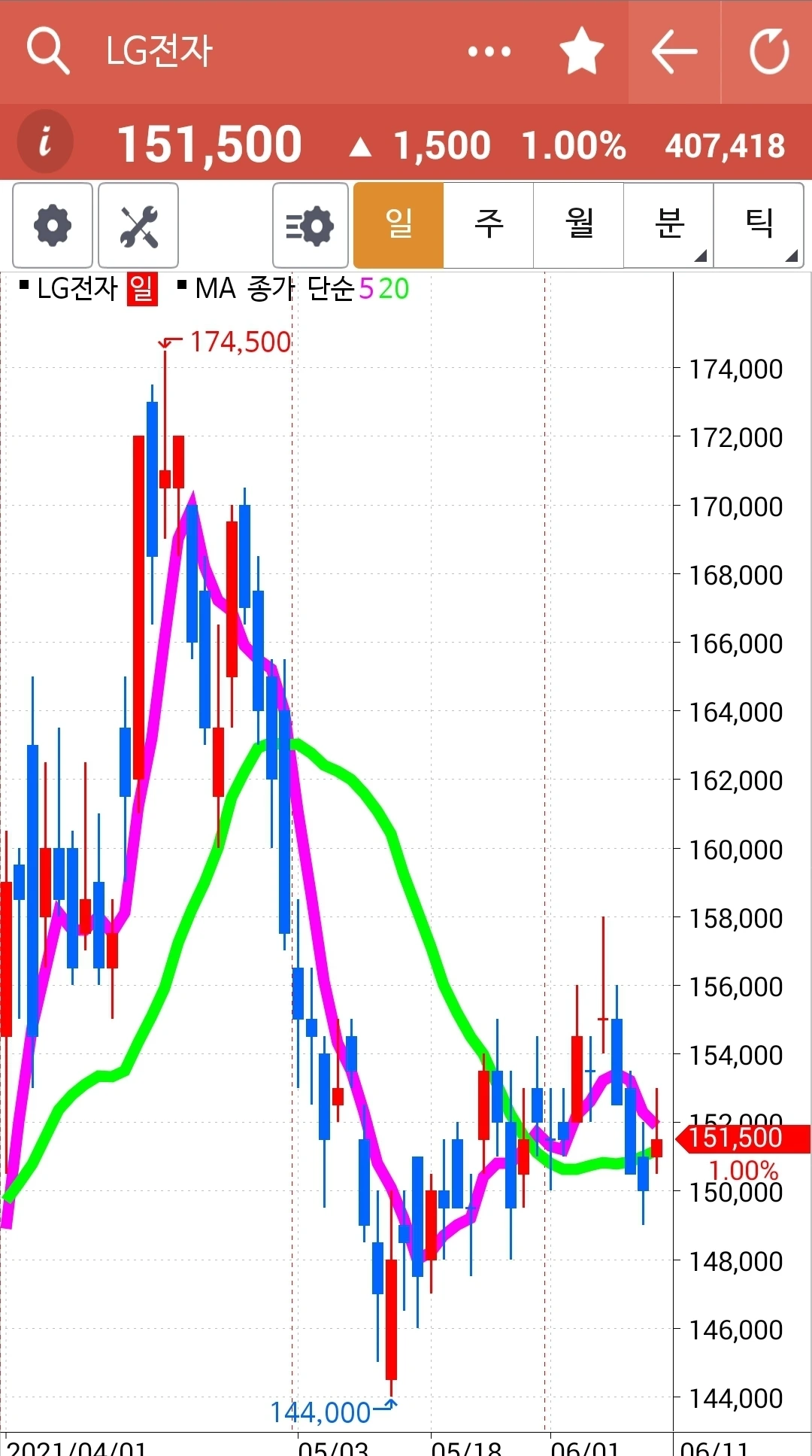 하하 LG전자가 그렇게 빵! 올라간 것은 아니다. 그저 살짝 20일선을 딛고 위로 향하기에 기특하여 제목을 LG전자 빵!으로 했다. 그야말로 LG전자 빵 빵빵! 올라가면 좋겠다.