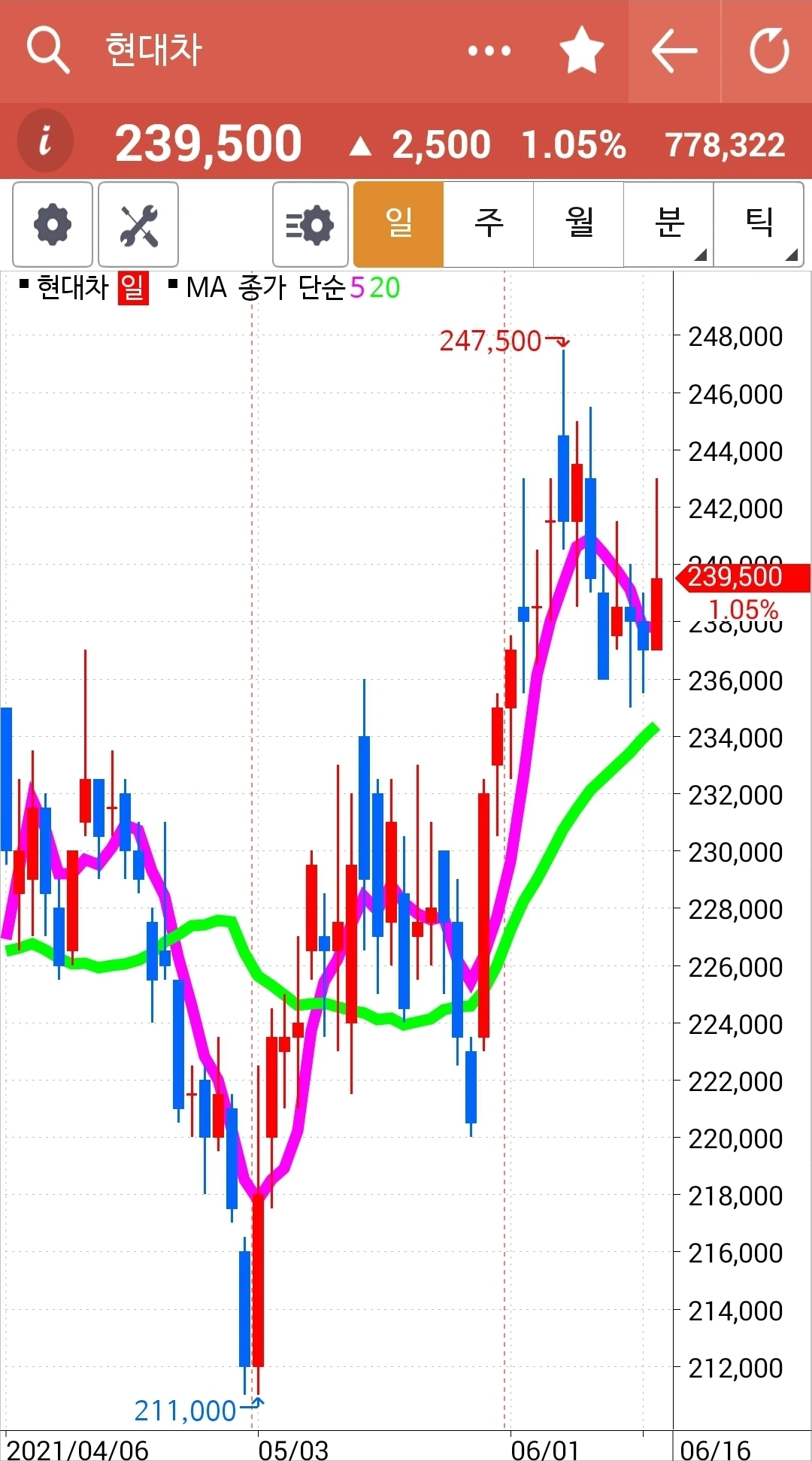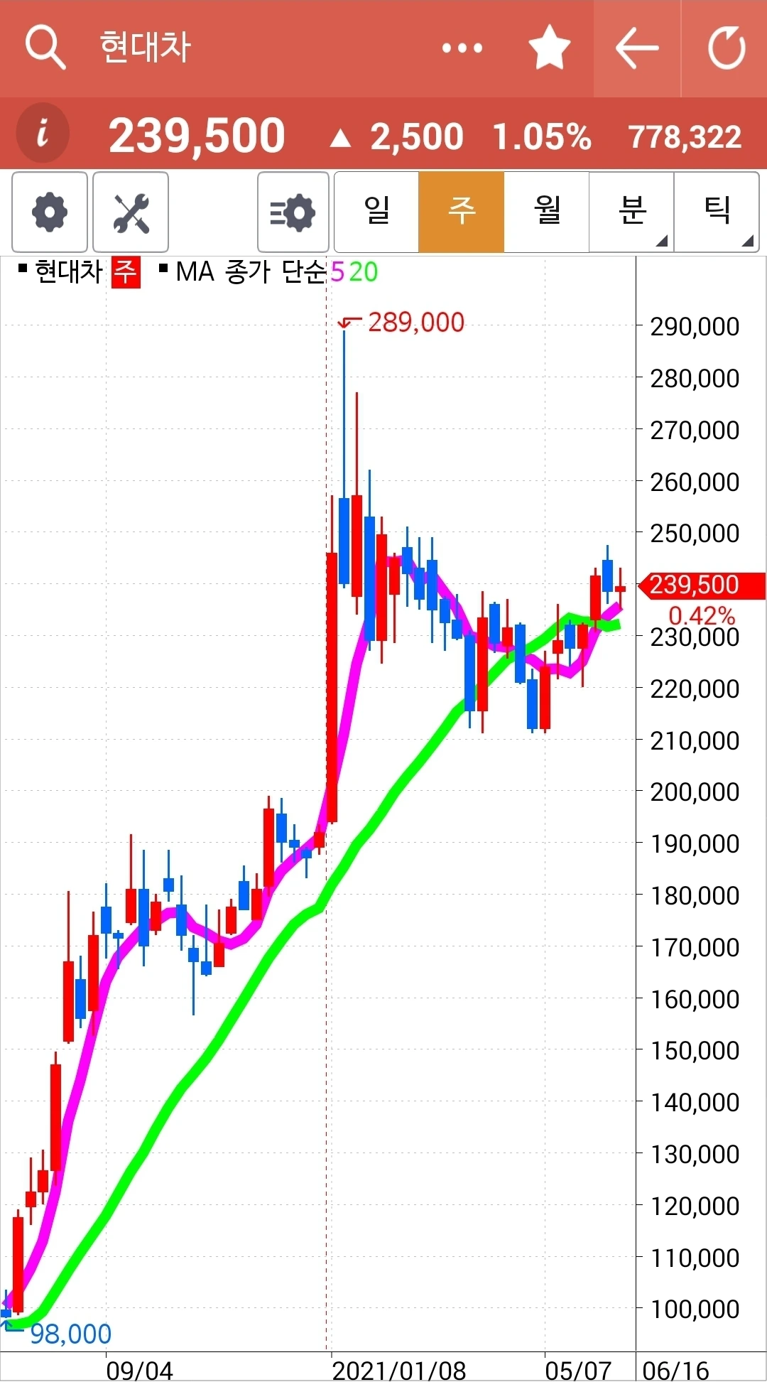 사진 1. 현물 주식. 꽉꽉 막히는 길 종종 멈추는 차 안에서 살짝살짝 장을 봤다. 그리고 신한지주 빠진 자리에 현대차를 사넣었다. 와이? 5일선이 20일선 위에 있고 그리고 다시 20일선 근처까지 조정받은 후 다시 신나게 위로 쭉쭉 올라가고 있으니까. 그런데 끝에 이렇게 밀릴 줄이야. 에고.
