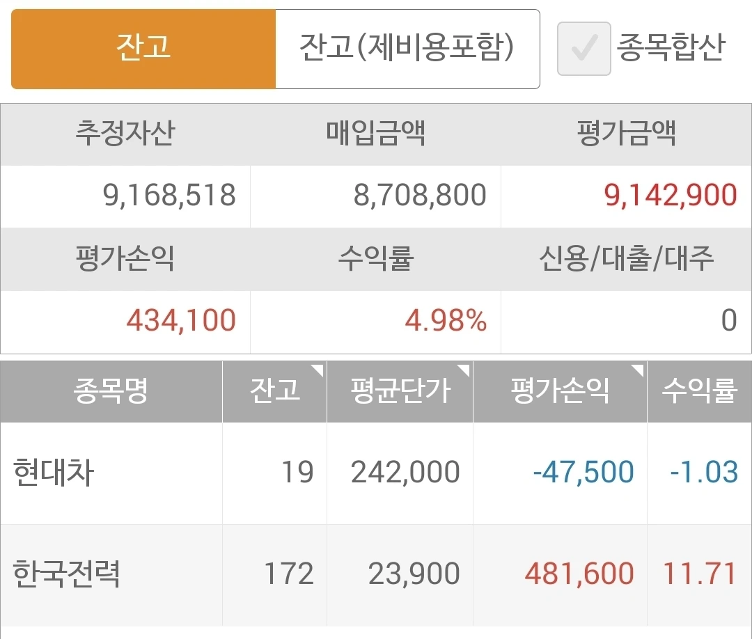사진 2. 선물주식. 한전과 현대차. 현물 주식에 있는 것들을 사넣었다. 차트 여러 개 안 보려고. 푸하하하