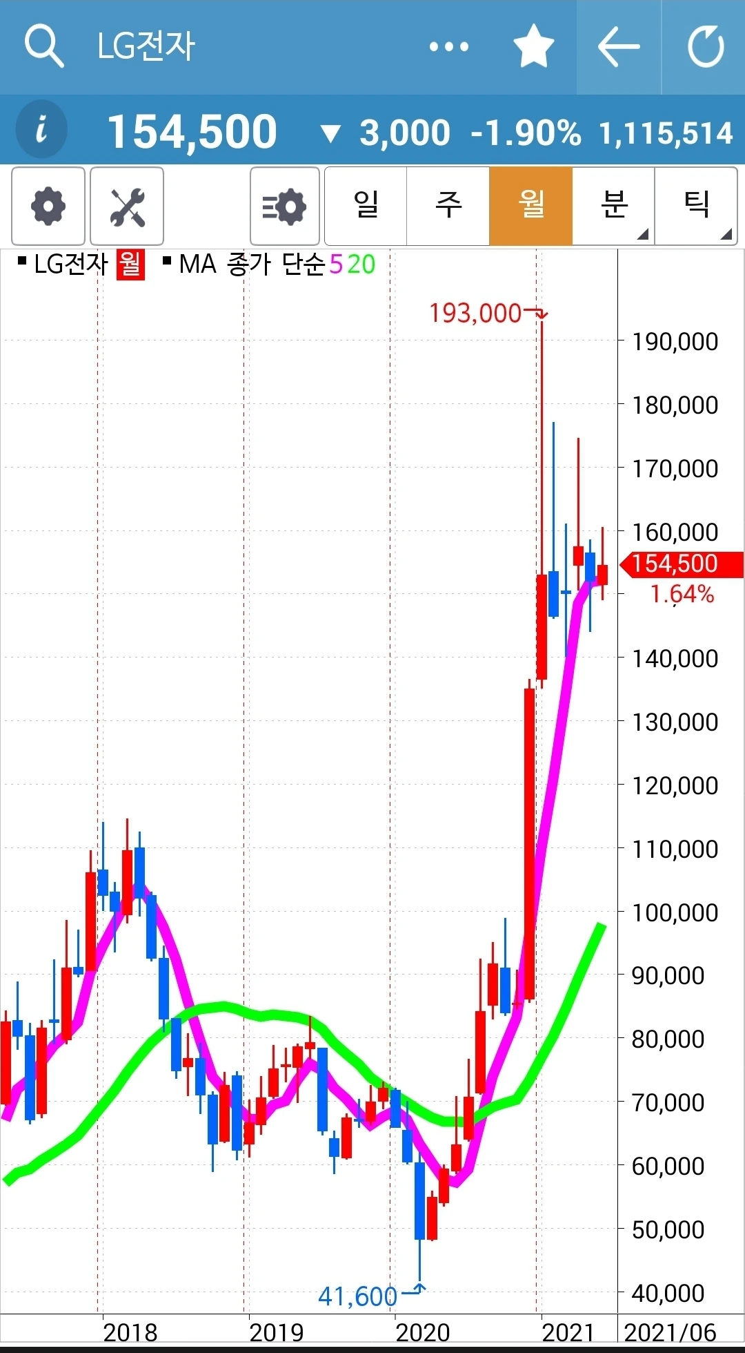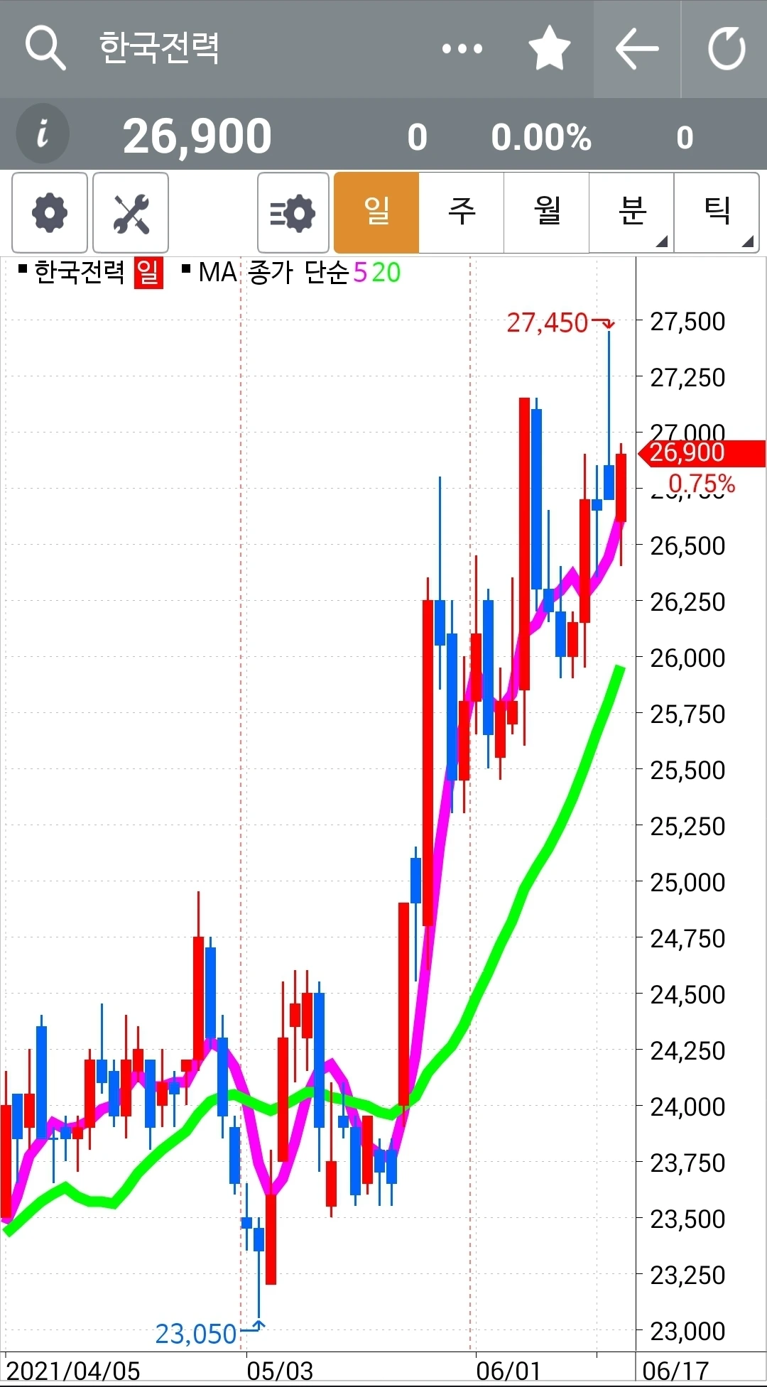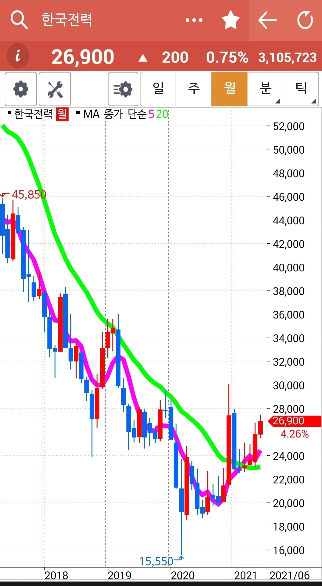 일봉만 윗부분이 회색. 요건 와이 그러냐~ 항상 당일 밤 12시 이전에 차트를 몽땅 저장하고 다음날 장이 시작되기 전 남편 몰래 일찍 일어나 글을 쓴다. 그런데 어제 그 어떤 깜빡이 있었는지 오늘 쓰려고 보니 주봉 월봉 월봉이다. 월봉만 두 개! 그래서 부랴부랴 차트로 달려가니 오늘 되면서 위가 싹 바뀌었다. 무덤덤 회색으로. 그래서 일봉만 회색이다. 어쨌든 어제 양봉이니 오늘 기대해본다.