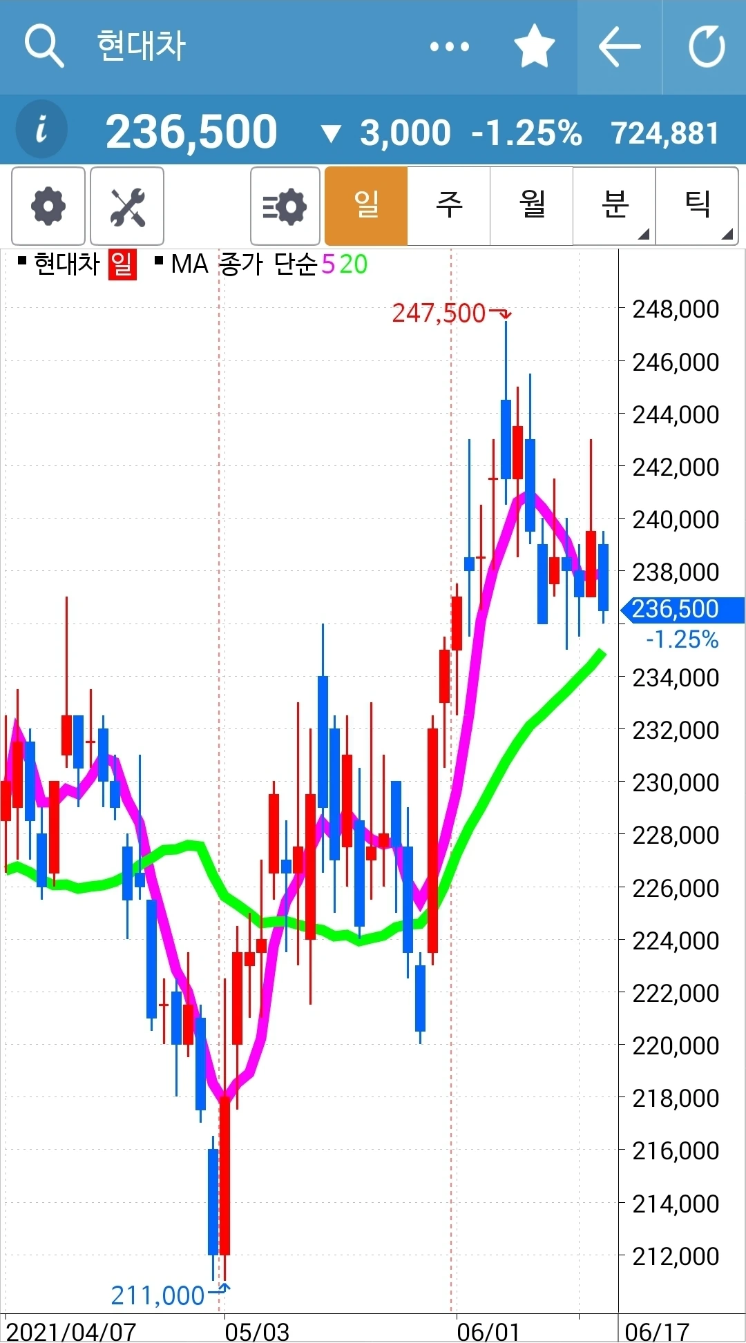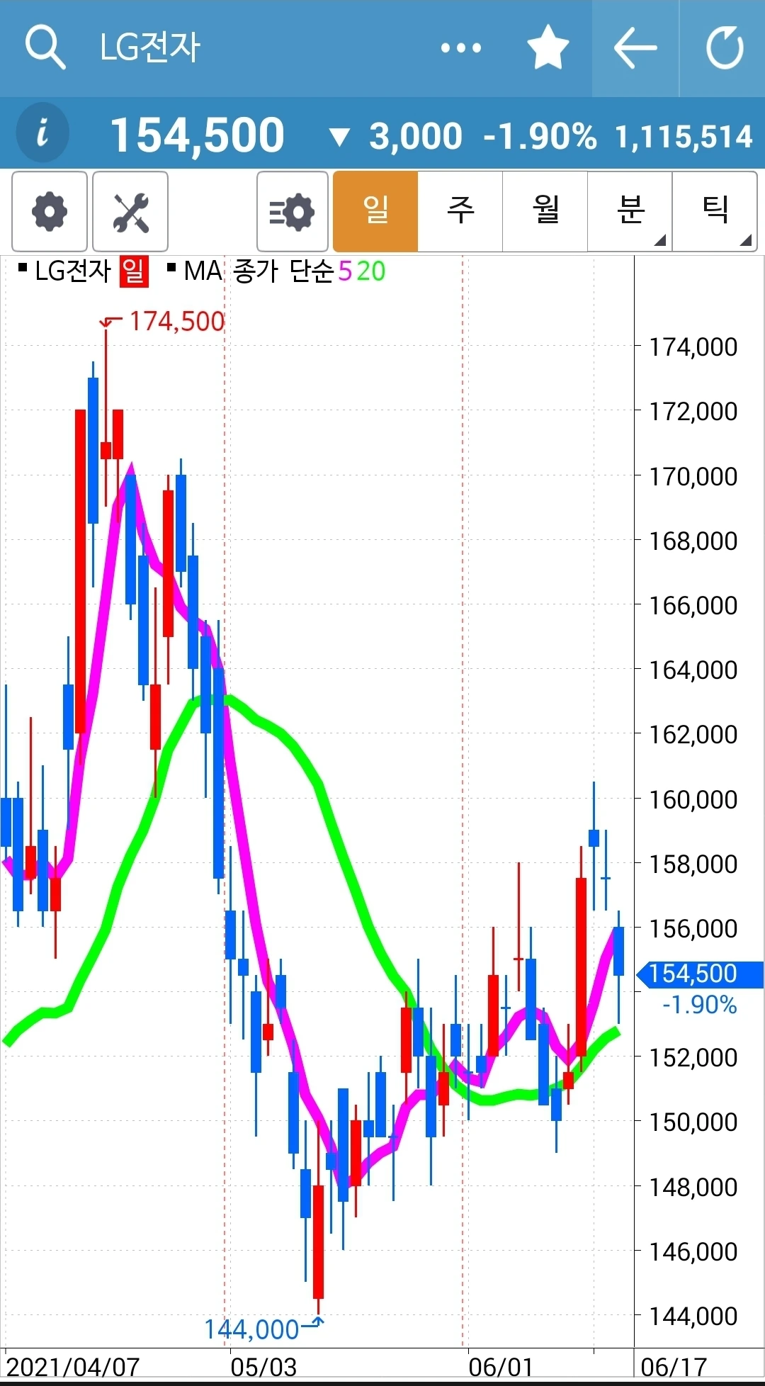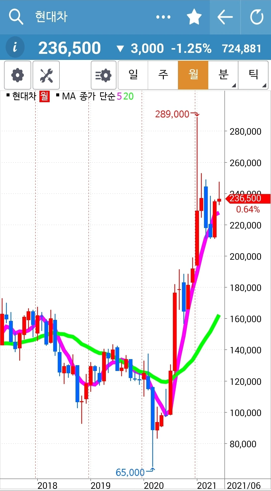 일봉만 윗부분이 회색. 요건 와이 그러냐~ 항상 당일 밤 12시 이전에 차트를 몽땅 저장하고 다음날 장이 시작되기 전 남편 몰래 일찍 일어나 글을 쓴다. 그런데 어제 그 어떤 깜빡이 있었는지 오늘 쓰려고 보니 주봉 월봉 월봉이다. 월봉만 두 개! 그래서 부랴부랴 차트로 달려가니 오늘 되면서 위가 싹 바뀌었다. 무덤덤 회색으로. 그래서 일봉만 회색이다. 어쨌든 어제 양봉이니 오늘 기대해본다.