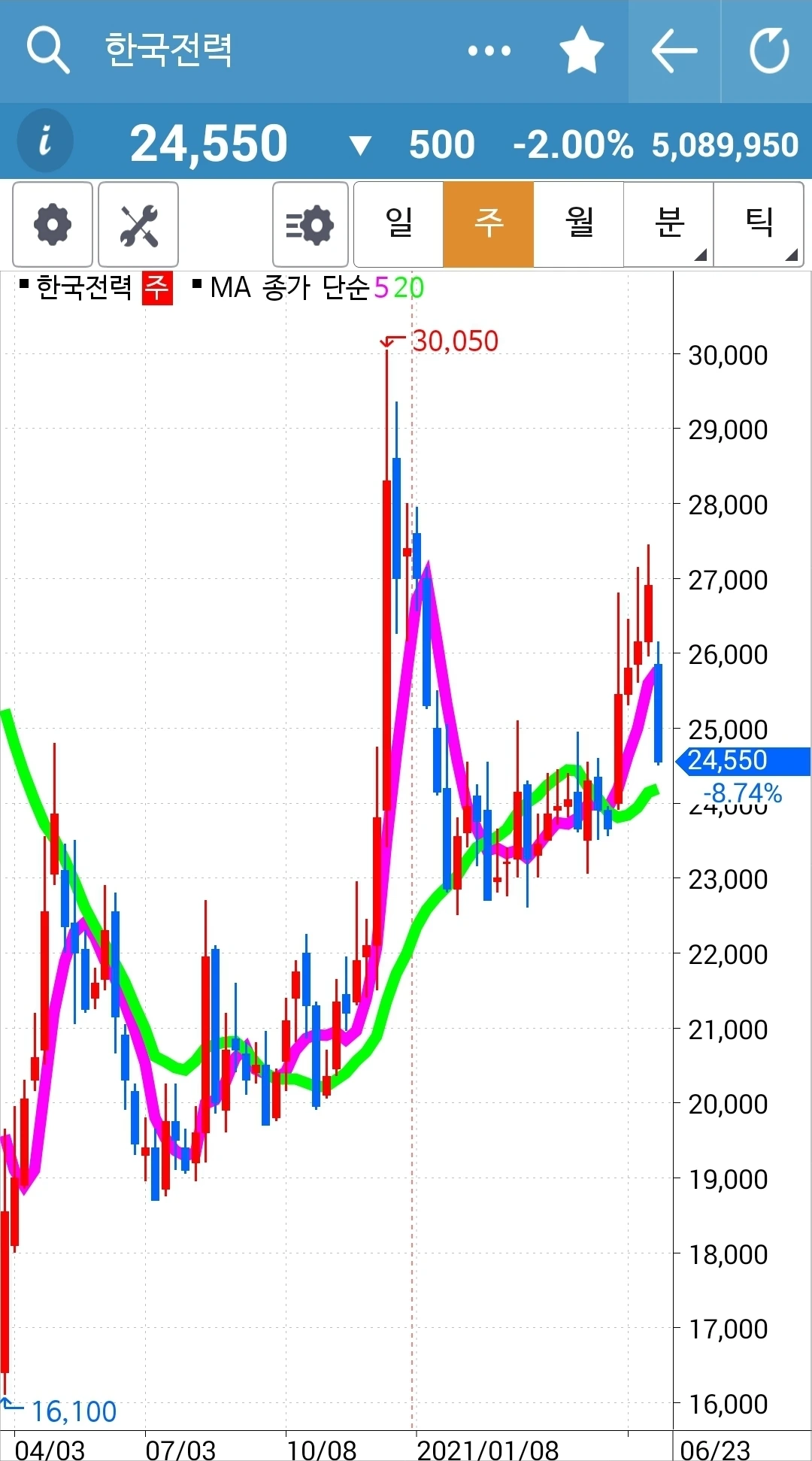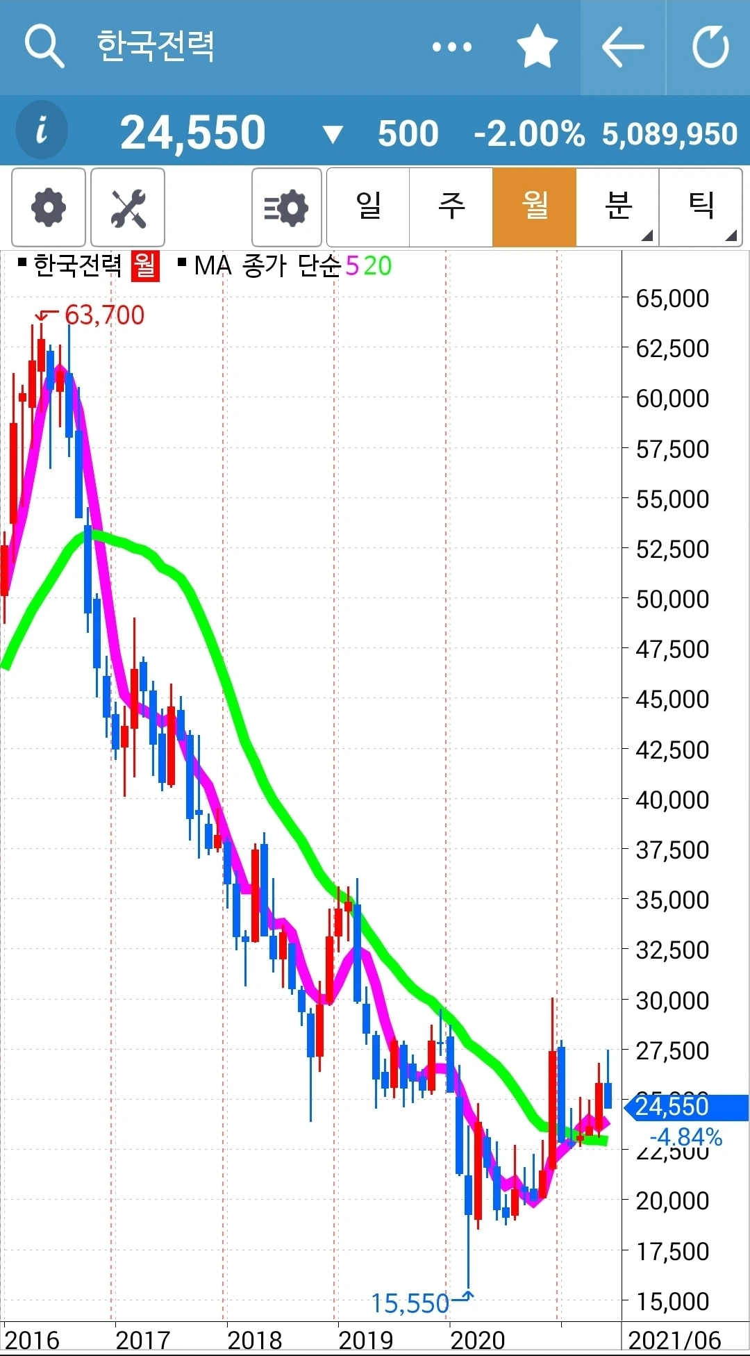 사진 1. 현물 주식. 한국전력이 원칙을 벗어났지만 그대로 보유했다. 와이? 월봉이 멋져서. 그게 이유가 될까마는 그래도 난 이 주식의 월봉에 끌려 매수했고 현물 주식에선 그대로 묻어두면 어떨까 애초에 생각했기에 좀 느긋하기로 했다. 어쩜 원칙을 어기는 데 대한 변명 또는 합리화일 수도 있다. 그래도 난 그렇게 했다. 그럴 수도 있다. 제대로 논리가 맞으면 된다. 푸하하하