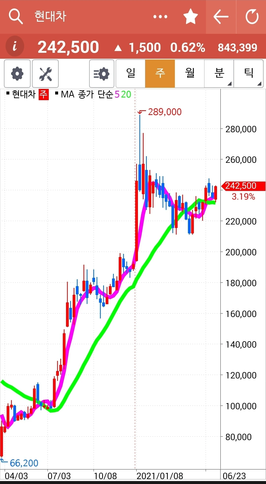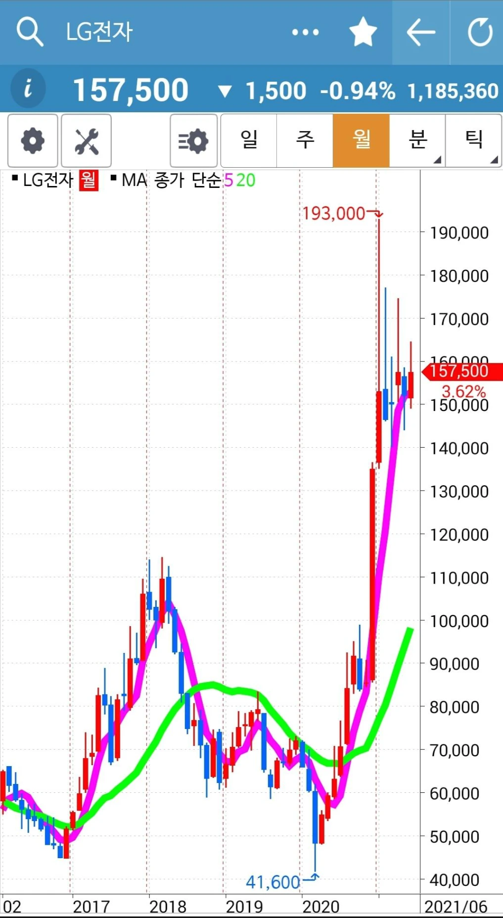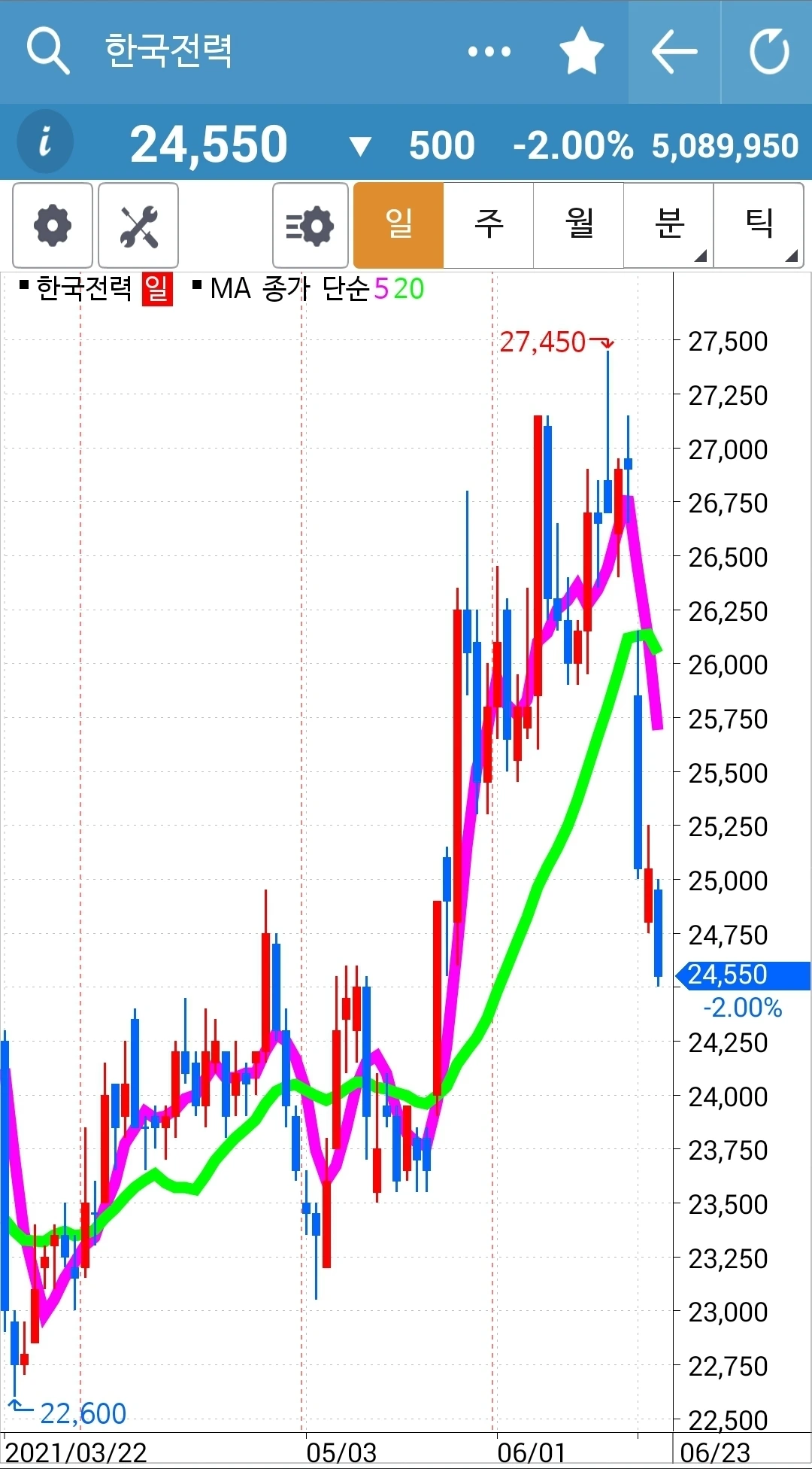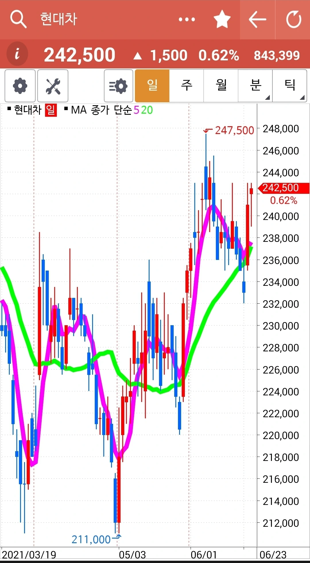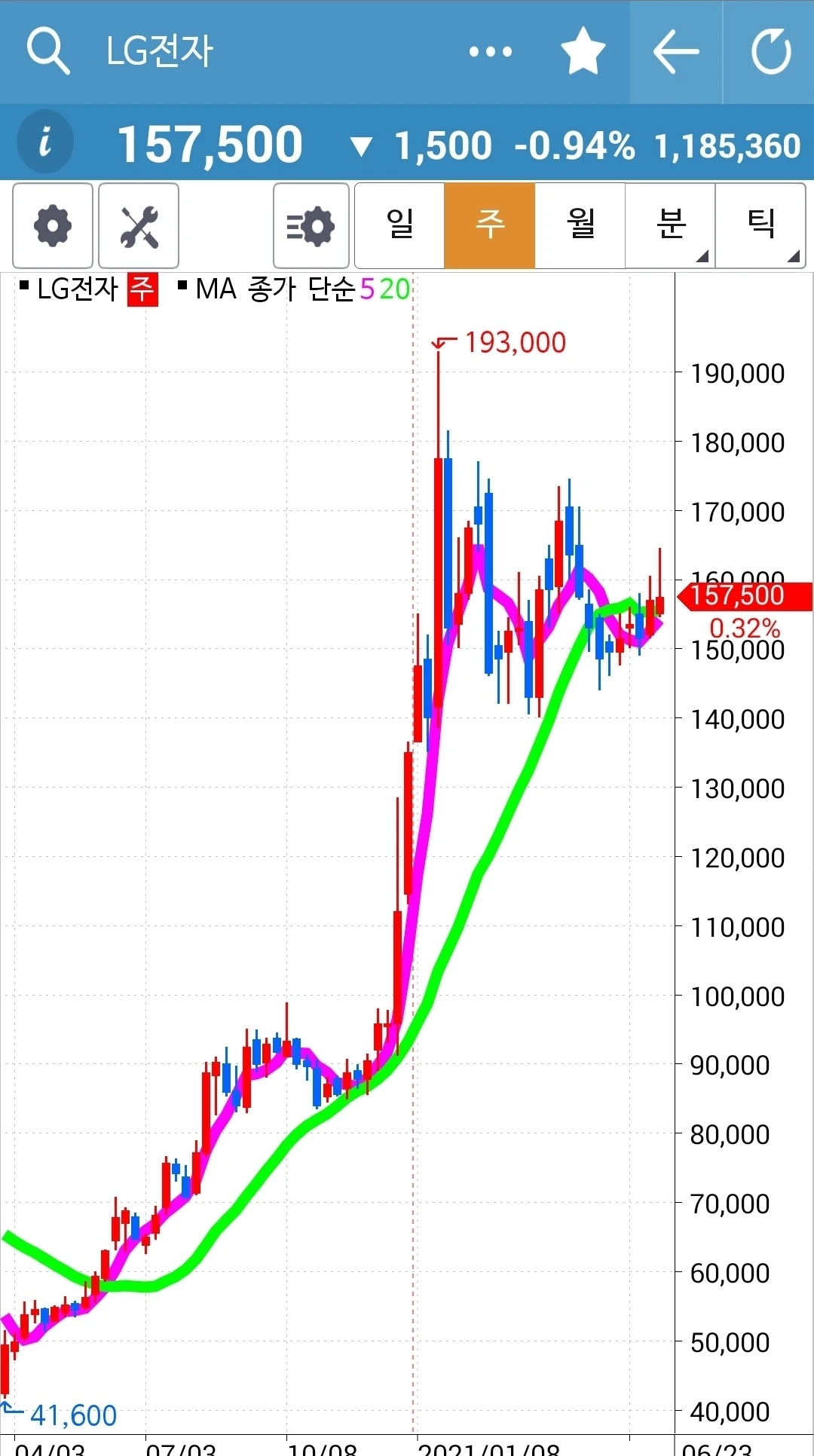 5일선이 힘차게 올라가고 있으니 아직 걱정할 것은 없다. 게다가 5 주선이 20 주선을 뚫고 위로 올라오려 하고 있다. 조금 더 힘을 내거라. 파이팅!!!