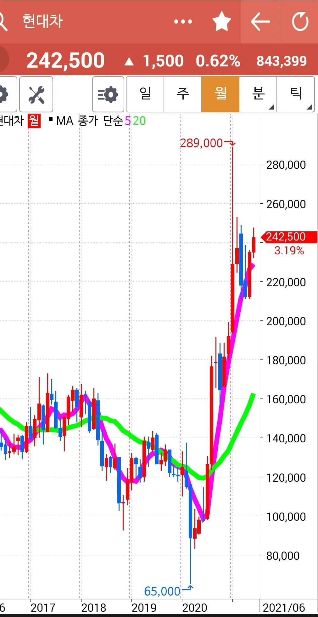 어제 긴가민가? 살짝 5일선과 20일선이 붙는 듯 보였을 뿐인데 거기서 나왔어야 할까? 하룻만에 이렇게 확실하게 5일선이 20일선 아래로 쭉 내려오다니. 오늘은 실행해야 한다. 그러나 월봉이 너무 멋있어 매수한 건데 현물 주식은 나의 현금 백프로로 매수한 것이니 애초 이야기한 대로 월봉이 무너지지 않는 한 왔다 갔다 없이 그냥 푹 묵혀둘 수 있다. 그러나 선물 주식은 다르다. 선물주식은 휙휙 그 요동침이 대단하고 금액도 무시할 수 없기 때문에 칼같이 원칙을 따라야 한다. 그래서 선물주식은 정리했다.