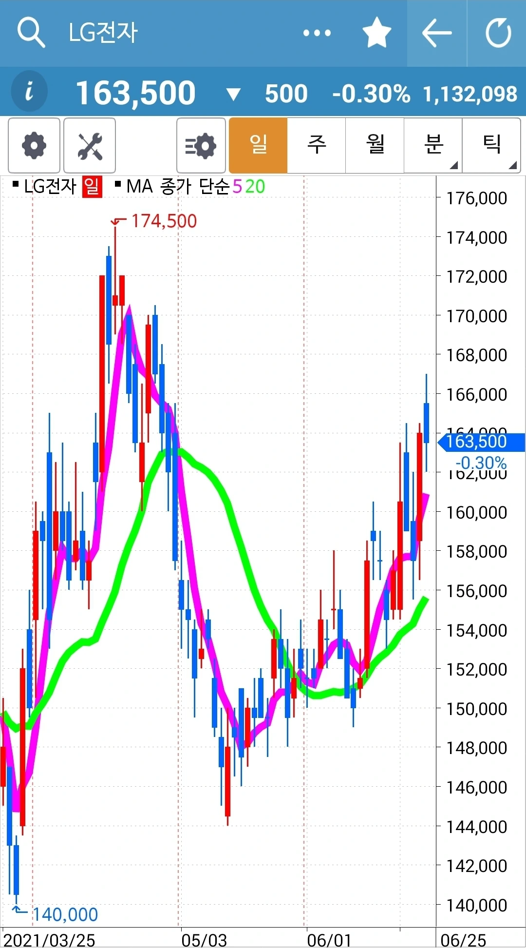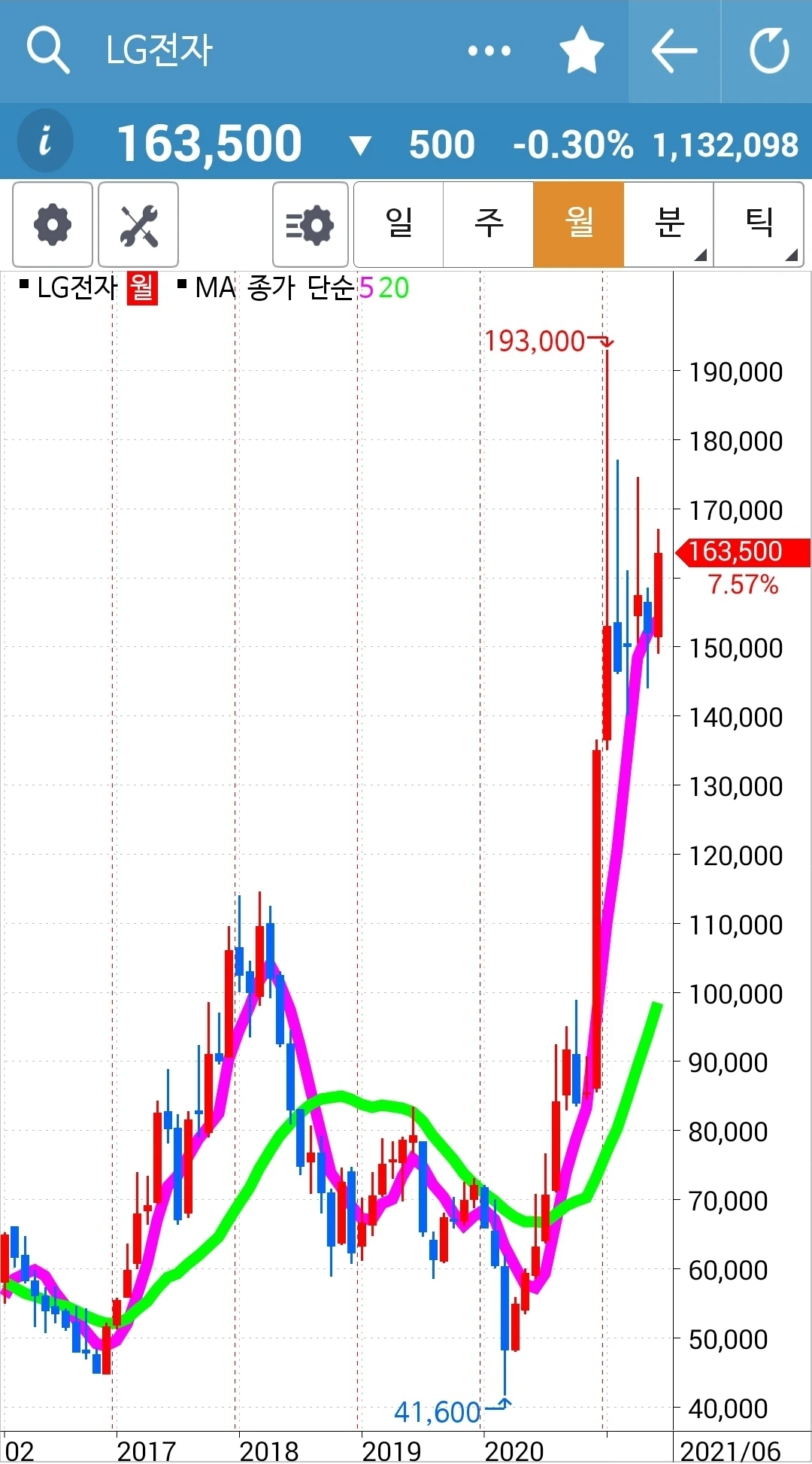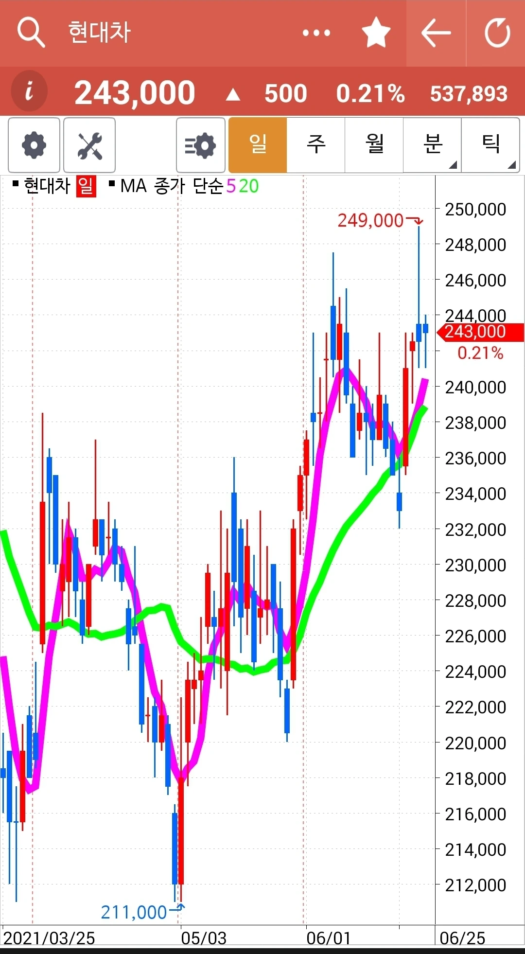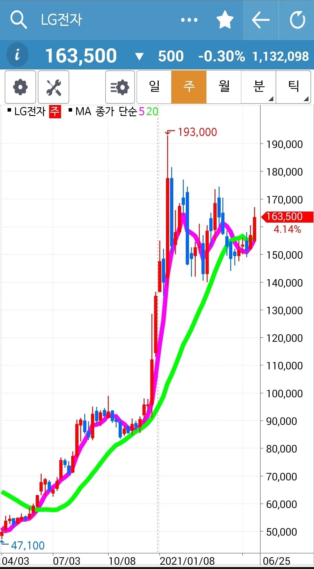 전 고점을 뚫고 뭉그적뭉그적. 힘이 찬가보다. 얼마든지 기다려주리라. 파이팅!