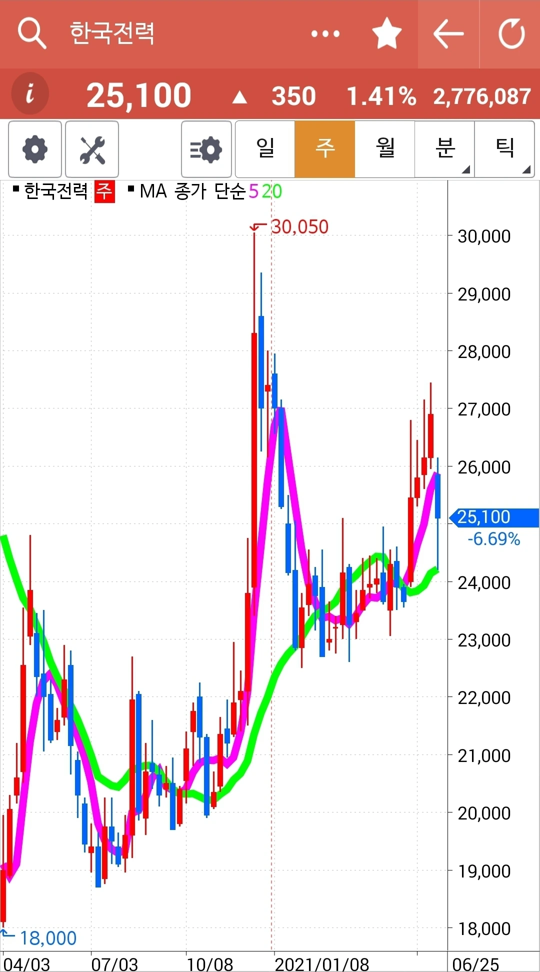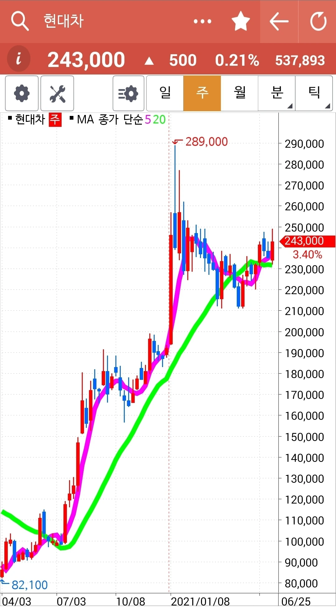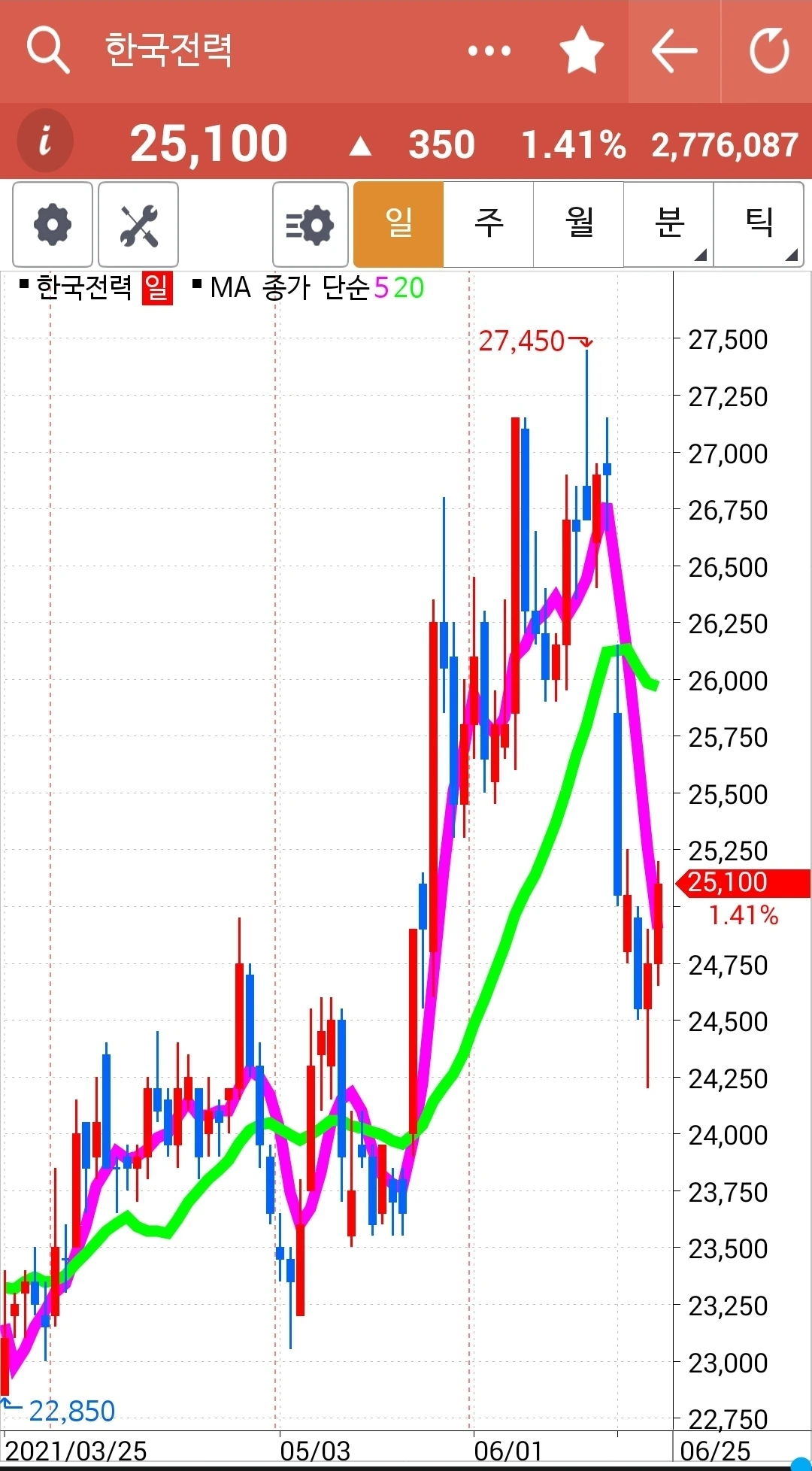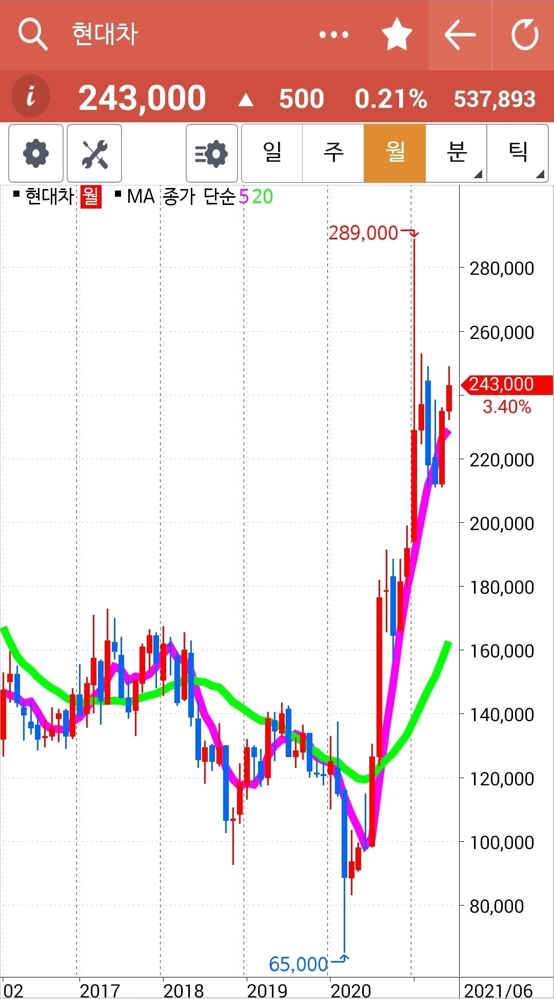 아깝다. 나에게서 탈락된 후 보란 듯이 계속 시뻘건 양봉을 보이며 올라가고 있다. 그러니 월봉을 보고 투자하겠다며 그나마 현물 주식에서 남겨놓은 건 참 잘했다. 그러나 선물주식에선 아니다. 결과적으로 놓아두었다면 더욱 좋은 결과를 낳았겠지만 선물주식에선 노노노. 매우 위험하기에 일단 원칙에서 벗어나면 칼같이 정리해야 한다. 암. '난 아무것도 몰라요 5일선이 20일선 아애로 내려가면 매도할 뿐야요~'를 실행할 뿐이다. 파이팅!